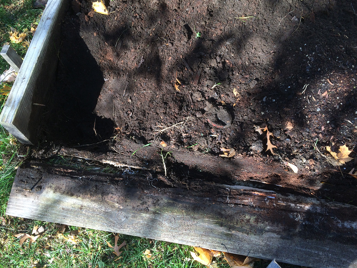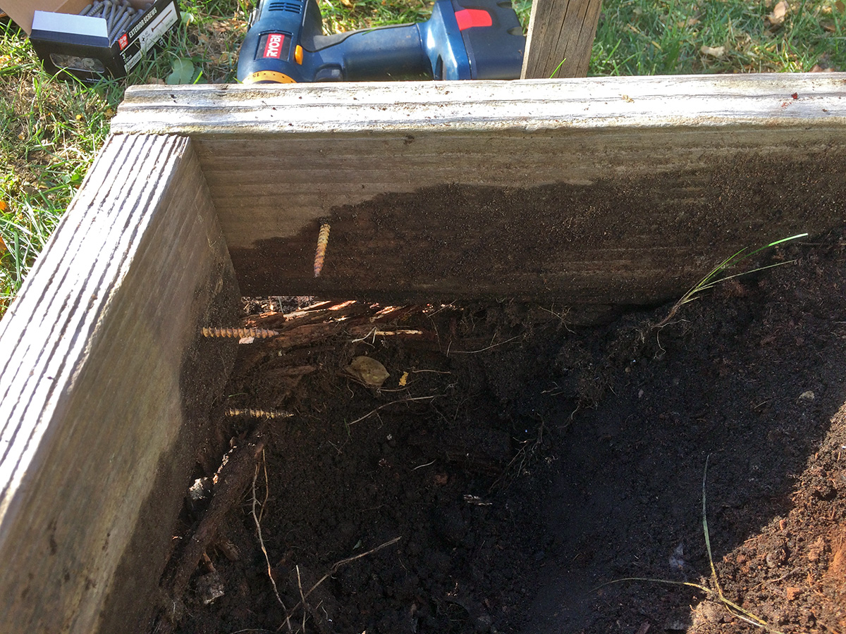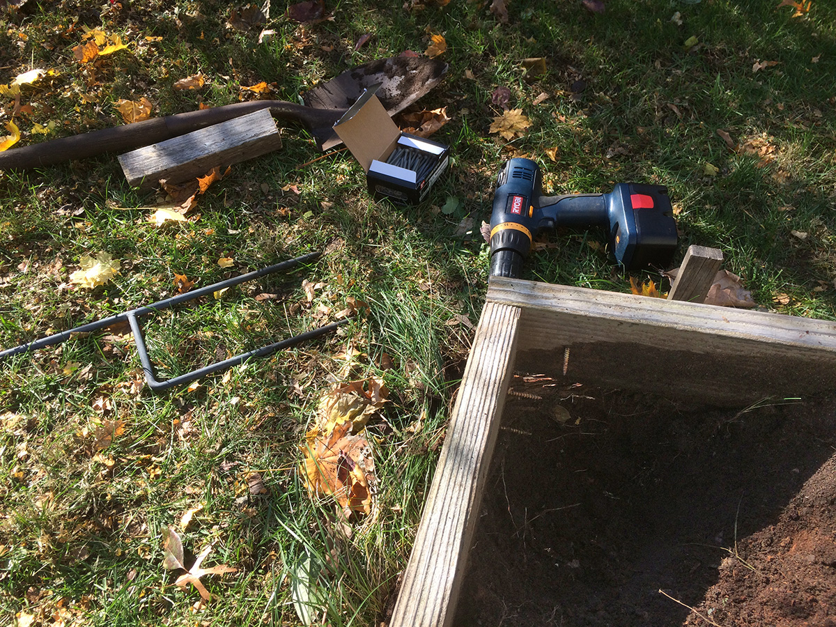 i read you can plant the smaller garlic cloves in tight rows for some spring onions. all the raised beds are occupied except for RB4. RB4 is not the ideal candidate because during the winter and spring it gets the least amount of sunlight, but it's the only available bed i can use to make a new garlic patch. but before i could do that i needed to repair the wooden box as it was falling apart. my original idea was to put new corner posts and nail the planks to that, but that was before i realized there were already long screws in the corners and they couldn't be removed because i didn't have the right star bit (T-20). so i ended up just nailing the planks to each other, before some of them started crumbling. now i'm hoping to find the right bit so i can remove the old screws and put in new ones.