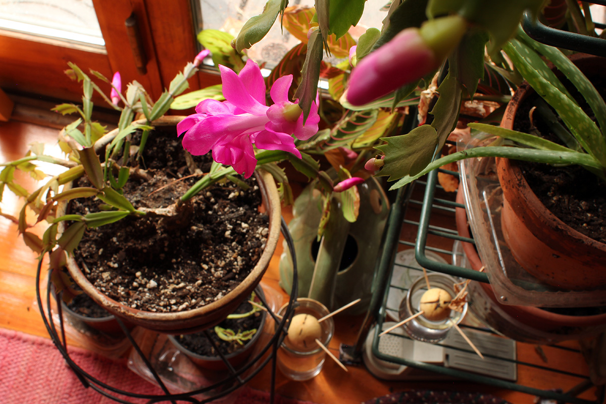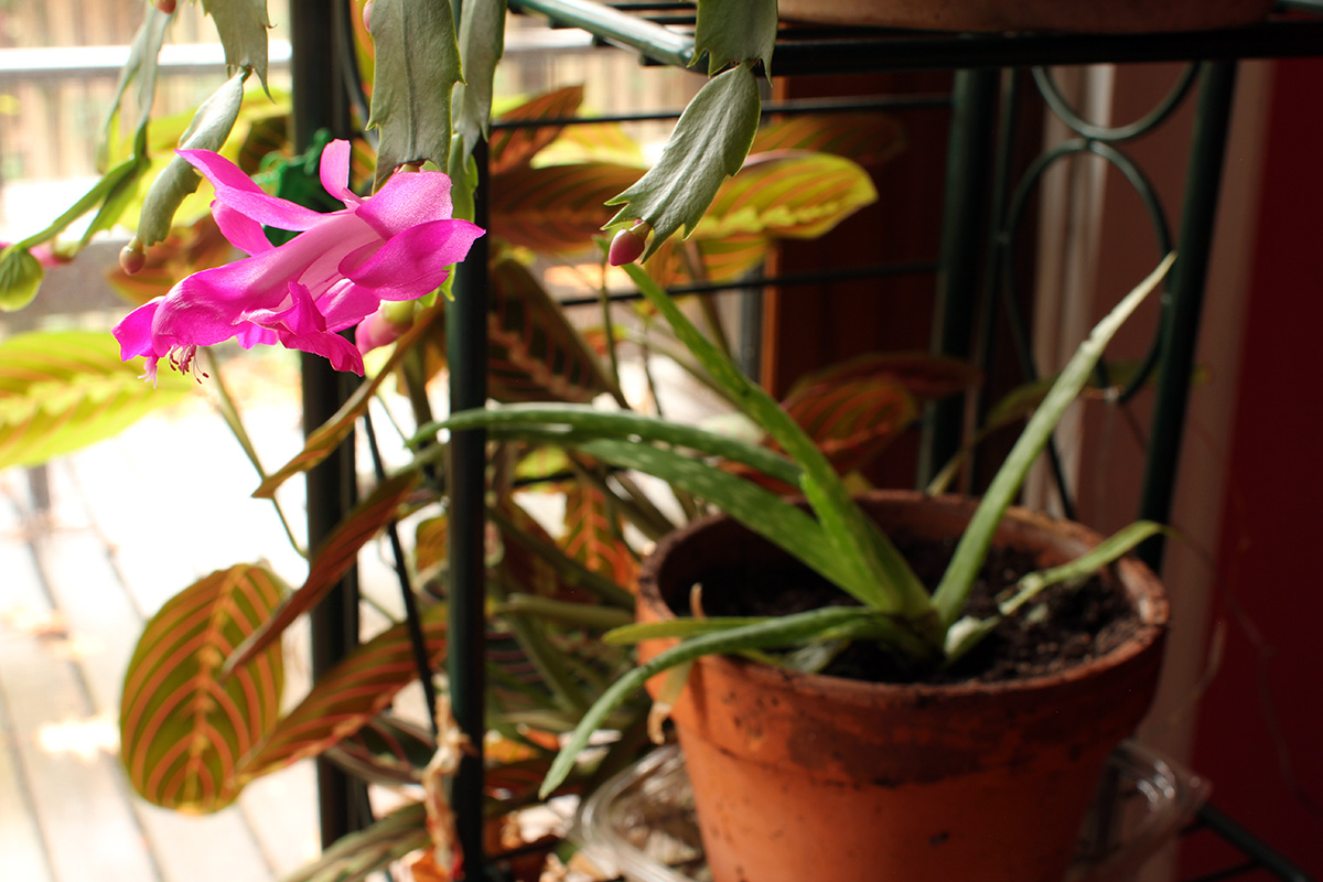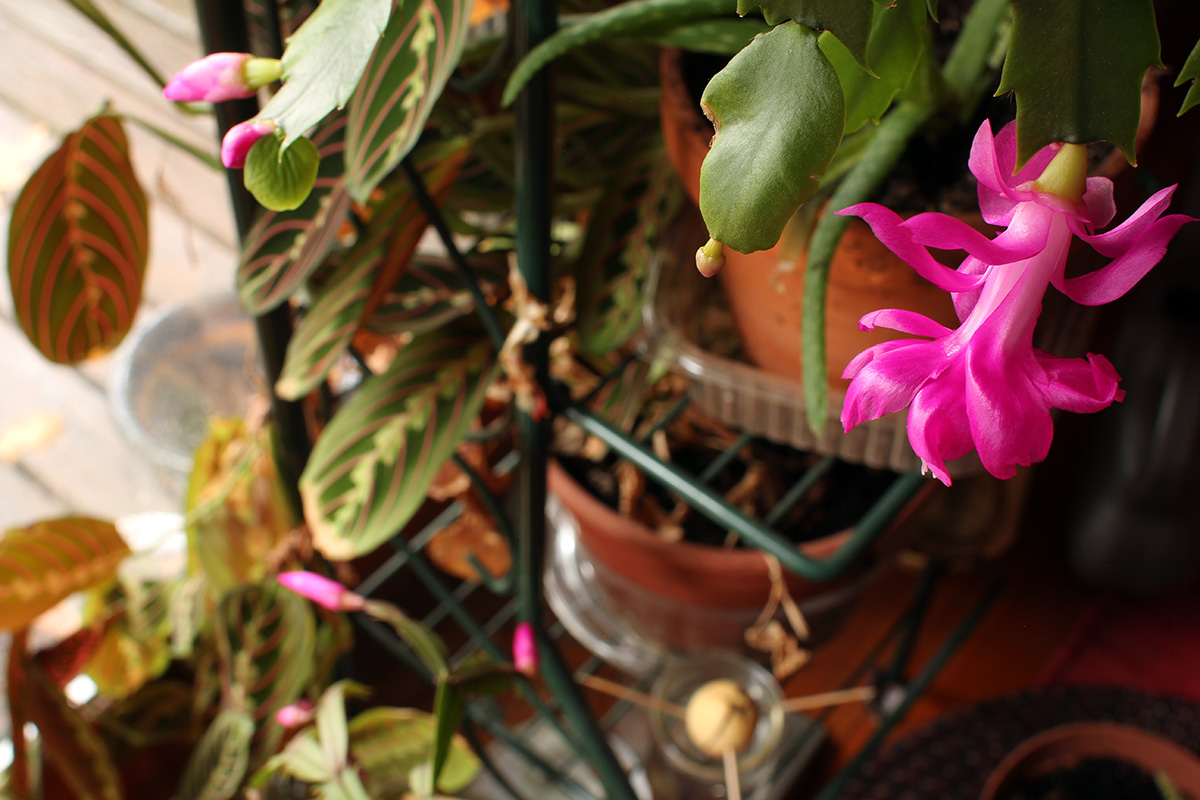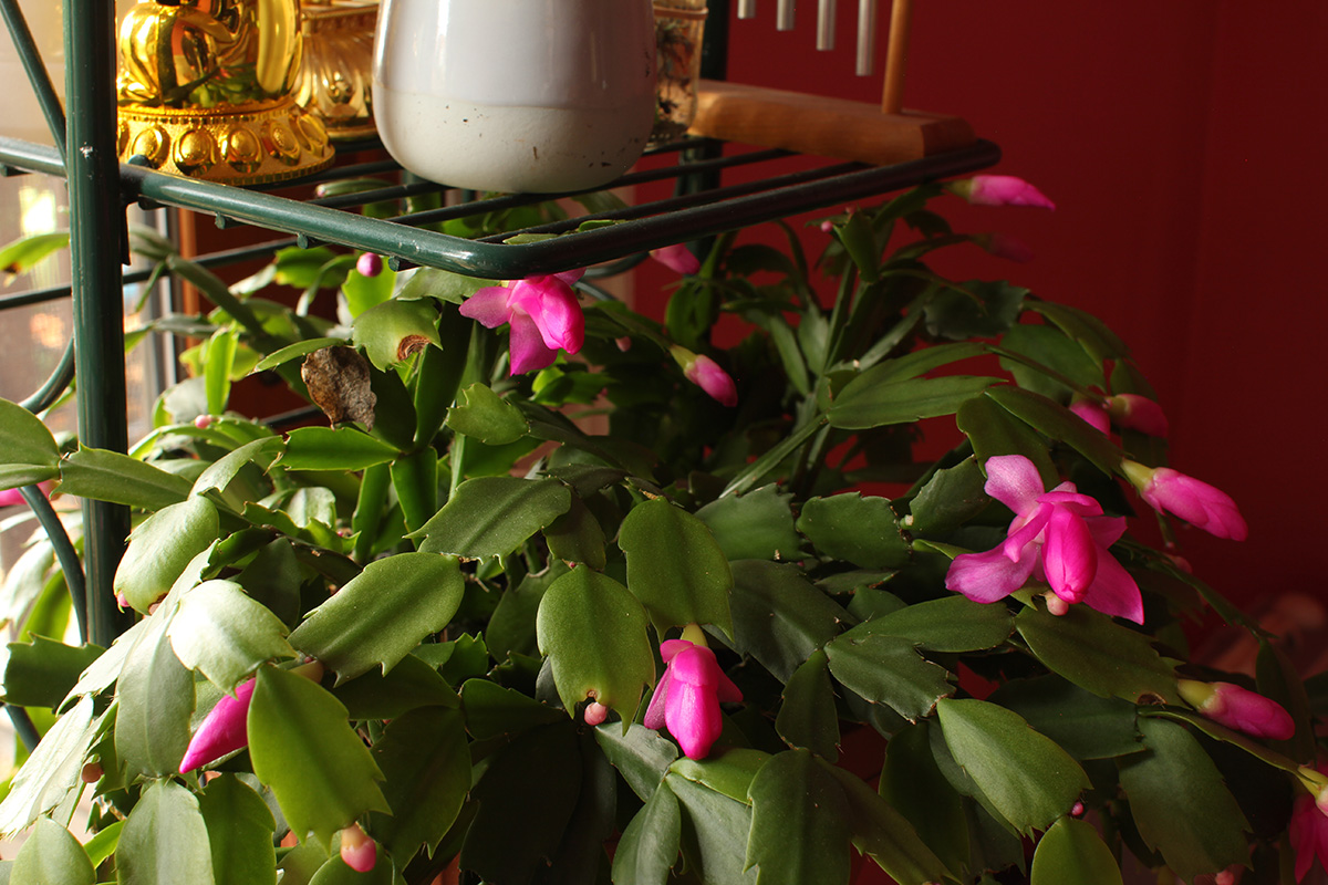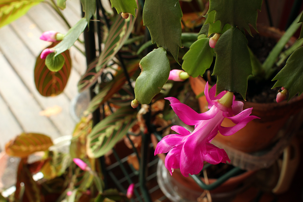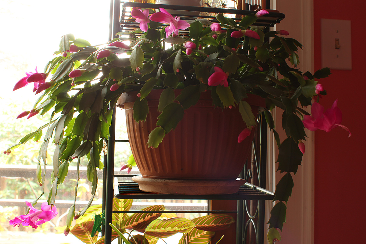 i don't get a lot of sun but for some reason conditions are ideal that every year in late november to december i get an explosion of christmas cactus flowers. this year especially, because i actually left the plant outside on the backyard deck during the summer where it seemed to thrive in the fresh air, natural rain water, and dappled sunlight. plus i replanted it with new soil. i noticed my pachira money tree plant had some aphids; i moved it to the bathtub and washed them off of the leaves.