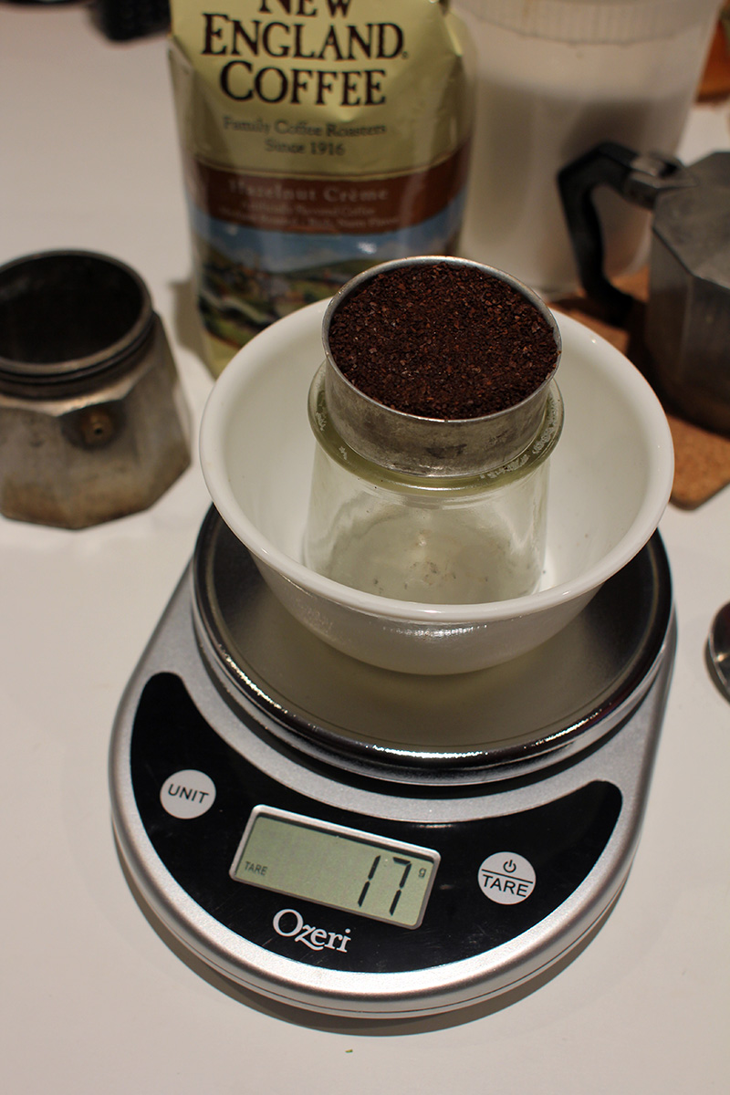 i read that the correct amount of coffee to use to brew is 20g. but that was with 380g of water; my moka pot can only hold 145g of water. but i was curious how much coffee the moka funnel could actually hold. i discovered it can take 17g of ground coffee, probably closer to 20g if i use a finer ground. with the moka pot, the portion is more concentrated, making less than a cup but using enough ground coffee to make 2 cups.