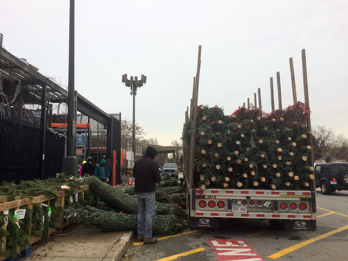 before i got to belmont i took a detour to the watertown home depot to return the two tubes of unused bathroom/kitchen caulk. i was there right when they were unloading a flatbed-truckload of fresh christmas trees. 'tis time!