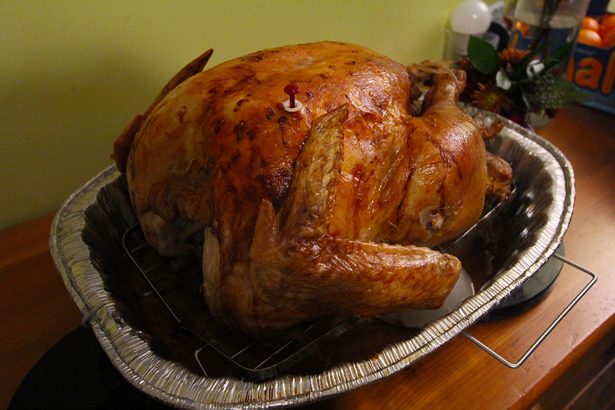 we took the turkey out of the oven at 5:30pm, after exactly 2-12/2 hours of roasting. the imbedded turkey thermometer even popped open, which normally doesn't happen. it wasn't particularly golden brown, which made me think i should've basted it after all. i'll baste again next year, even if it does mean a longer roast time.