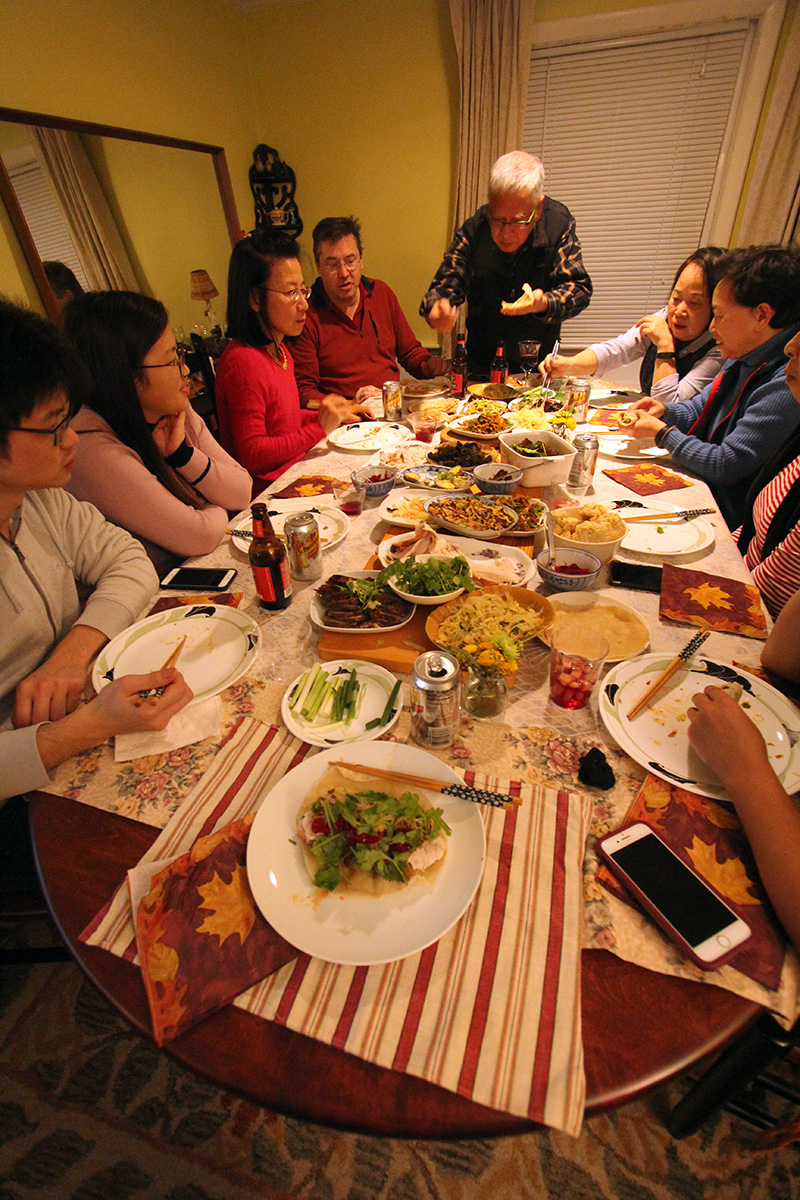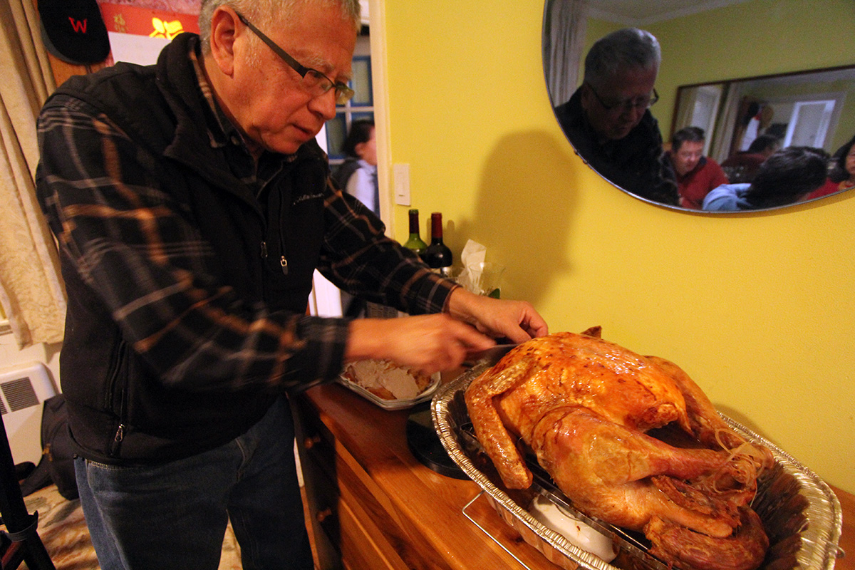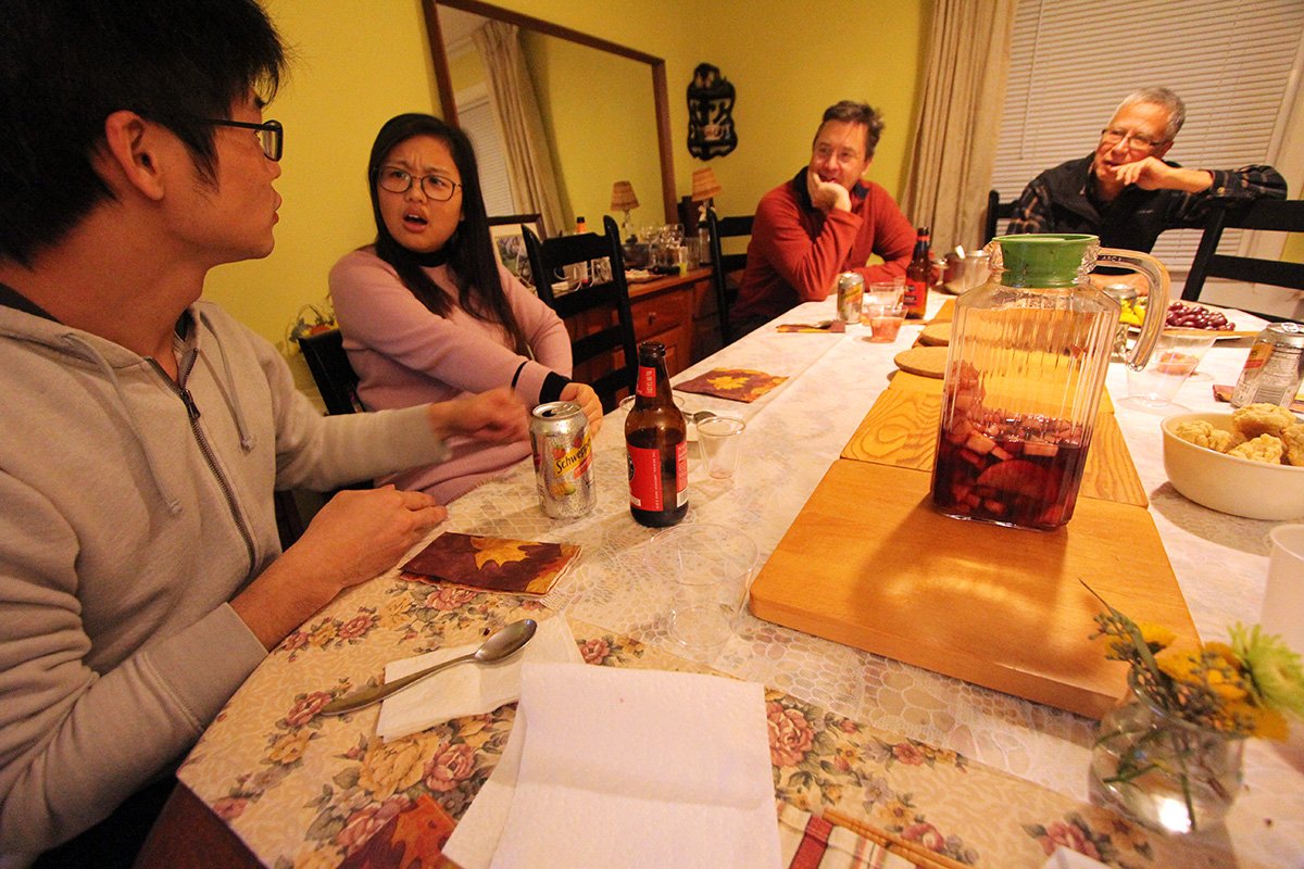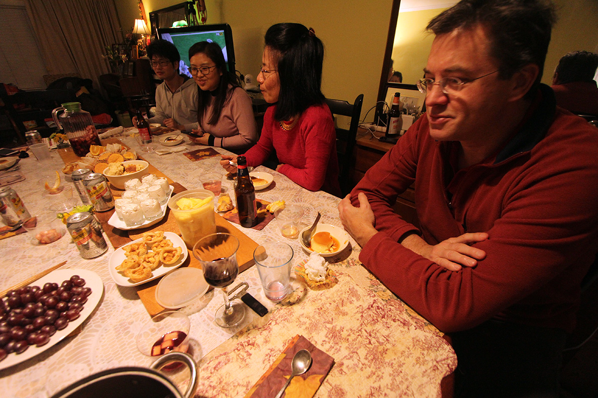 since my sister was still busy preparing the food, my father left close to 5pm to pick up my sister's godmother and our two guests from the cafe. this year we invited li and his wife who just arrived in boston on tuesday (her first time in the US). she's here for a month doing astrophysics research as well. li will return to china for good at the end of january. what we didn't know (but i guessed) was they already had a thanksgiving meal at the arlington home of one of li's professors. they had it american style, in slices served with gravy. his professor also weren't in the food business like my parents, so i'd like to think the better thanksgiving was with us.