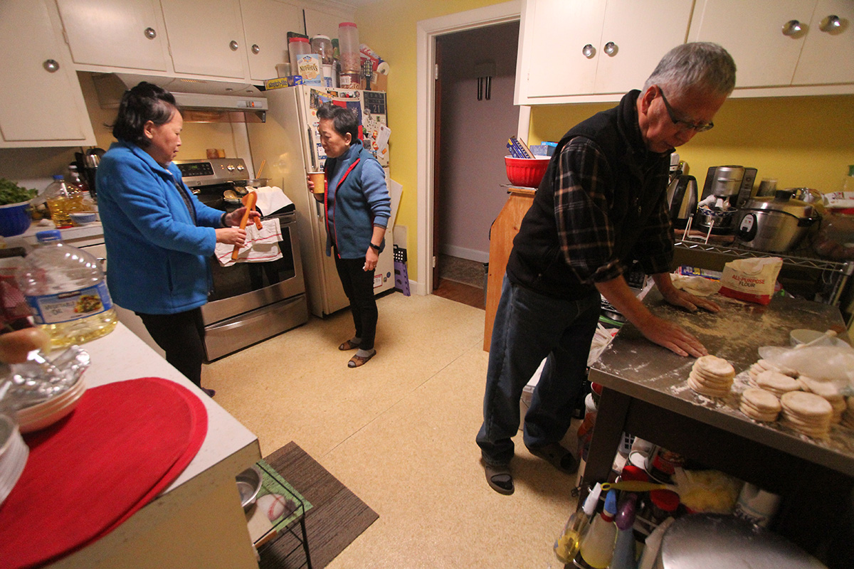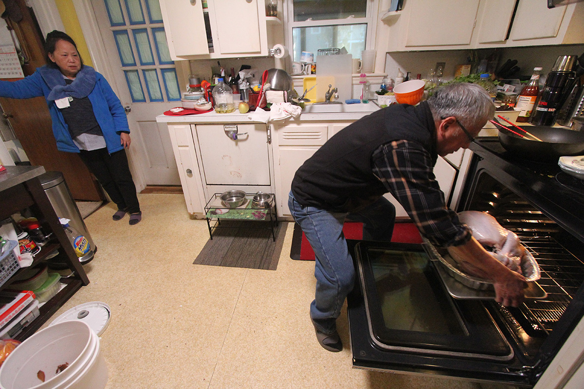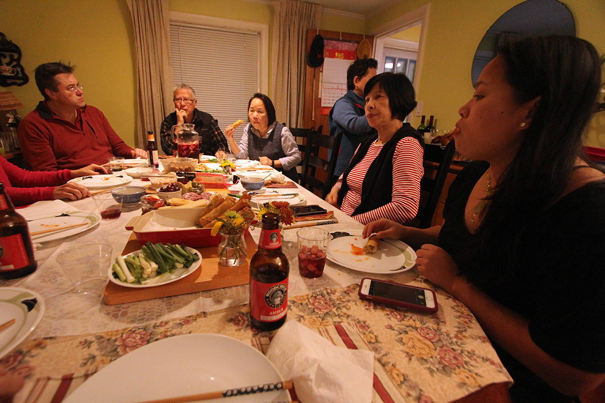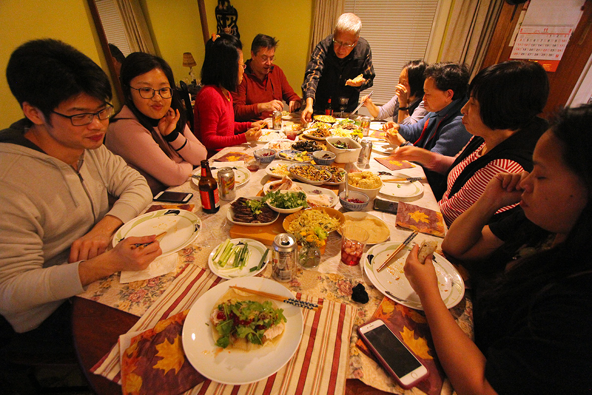 since my sister was still busy preparing the food, my father left close to 5pm to pick up my sister's godmother and our two guests from the cafe. this year we invited li and his wife who just arrived in boston on tuesday (her first time in the US). she's here for a month doing astrophysics research as well. li will return to china for good at the end of january. what we didn't know (but i guessed) was they already had a thanksgiving meal at the arlington home of one of li's professors. they had it american style, in slices served with gravy. his professor also weren't in the food business like my parents, so i'd like to think the better thanksgiving was with us.