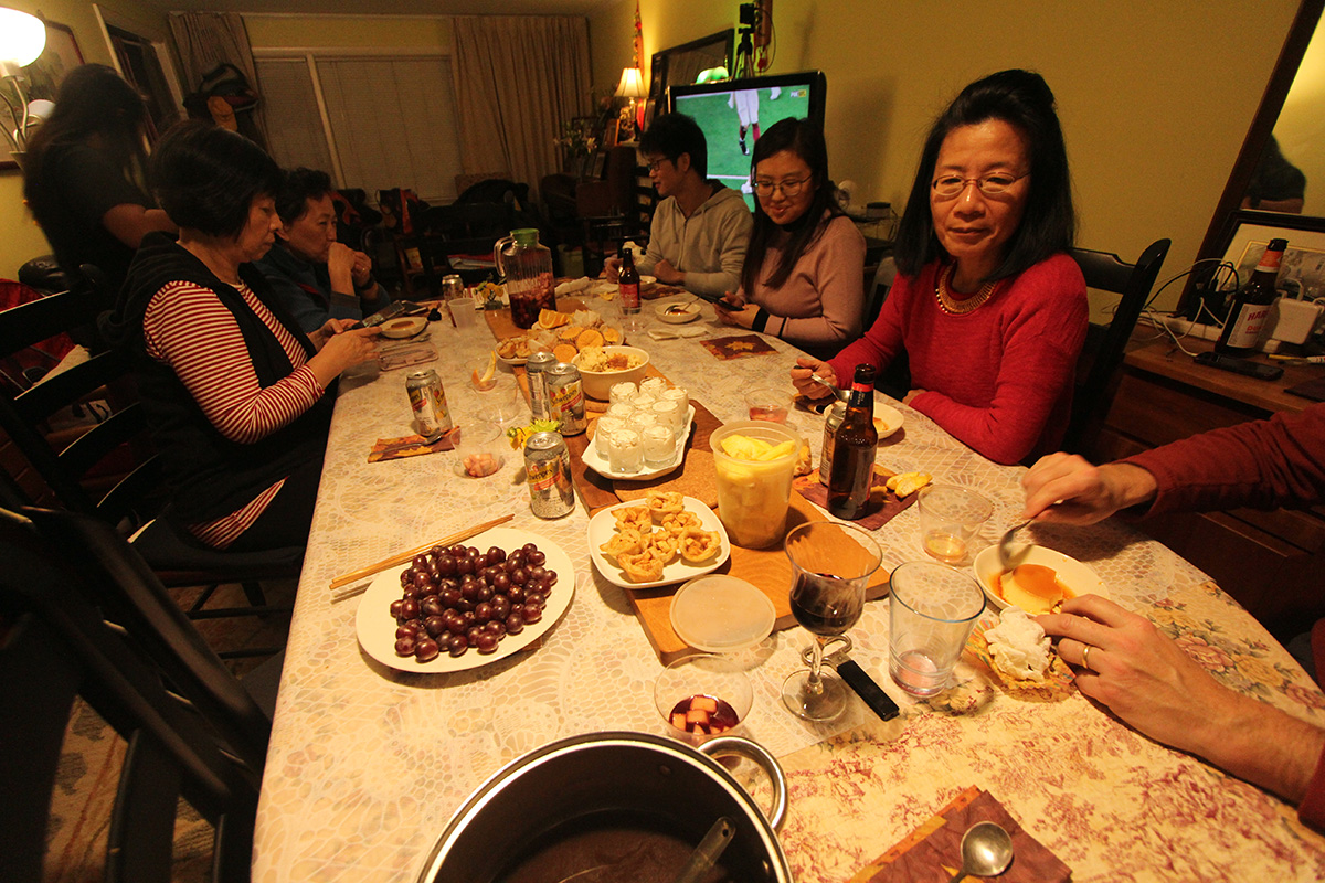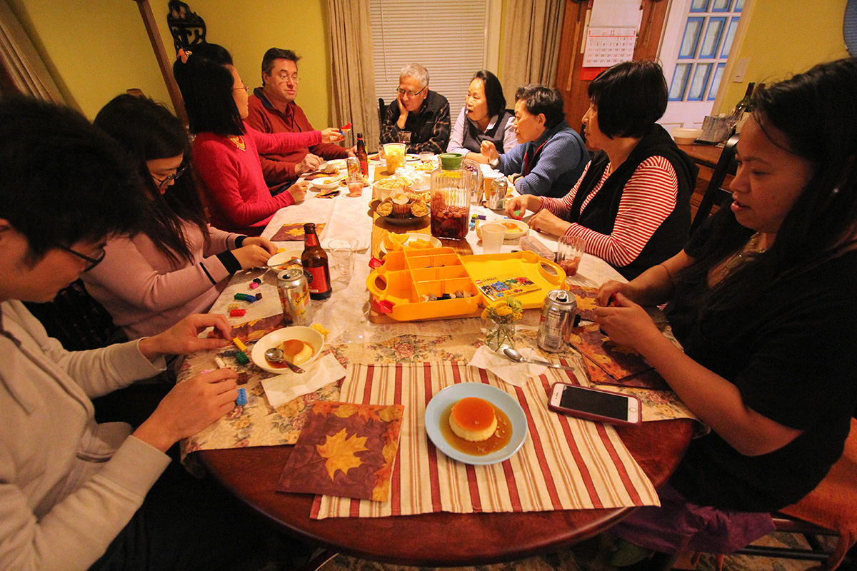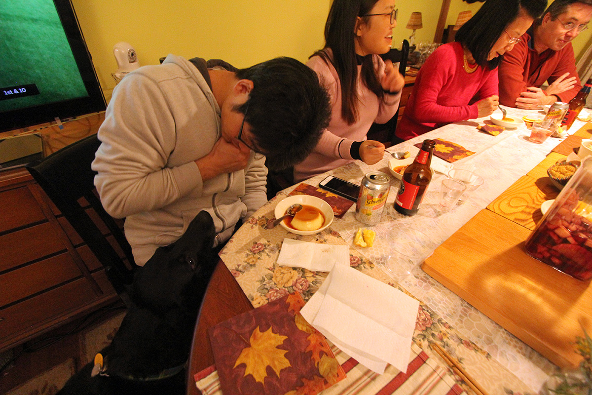 dessert included: sweet warm red bean soup with taro-filled glutinous rice balls; my traditional thanksgiving flan; and a bunch of pastries my sister created, including chestnut whipped cream and sponge cakes. my aunt must've read that i was thinking about making some coconut flan because she asked if this was it, but that was just an idea i was toying with. some hot was also served. during that time my 2nd aunt and my sister's godmother helped my mother wash the stacks of dishes.