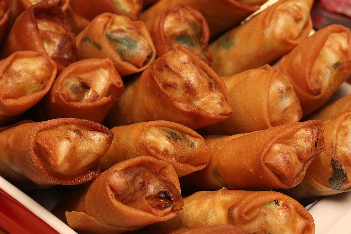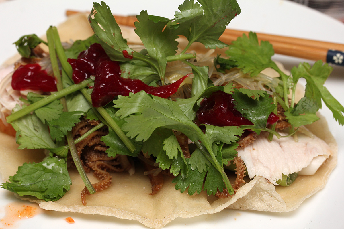 my aunt and uncle arrived around 5pm as well, bringing with them grilled jumbo shrimps, which we served as one of the appetizers, besides roasted hazelnuts, crab dip with rice crackers, salmon on table wafers, cheese plate, and of course the traditional fried spring rolls. there were also drinks, including the sangria my sister made. as for beers, we had two kind this year: harpoon dunkin' donuts porter and samuel adams cherry wheat. i tried both, and both tasted awful: the porter was like dark beer mixed with bitter coffee, while the cherry wheat tasted like like beer but with a synthetic cough-syrupy flavored cherry.