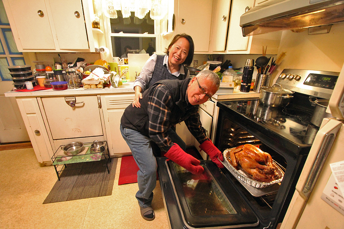 in what may be the coldest thanksgiving in boston on record, my father called me in the morning to give me a ride even though i originally planned on taking the bicycle to their house. he came a bit after 10am. the streets were mostly empty of cars; pedestrian traffic seemed to be higher, with people out for a stroll, walking pets, or jogging. we stopped at the cafe to take all the thanksgiving food to belmont, including the turkey still brining in solution. my father poured out the liquids before we loaded the bucket into the car.