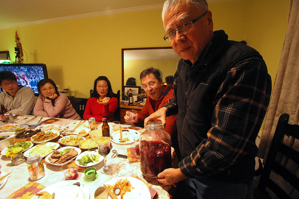 after we finished with the turkey, the table was lightly cleared in preparation for dessert. my father brought out his plum wine for people to sample. 2 months of fermenting in the basement, it looked and smelled like it'd be delicious. but when we tried it, there was hardly any sugar left, all fermented into alcohol instead.