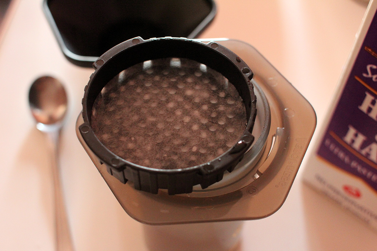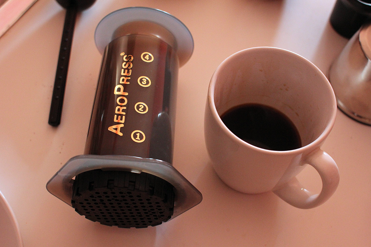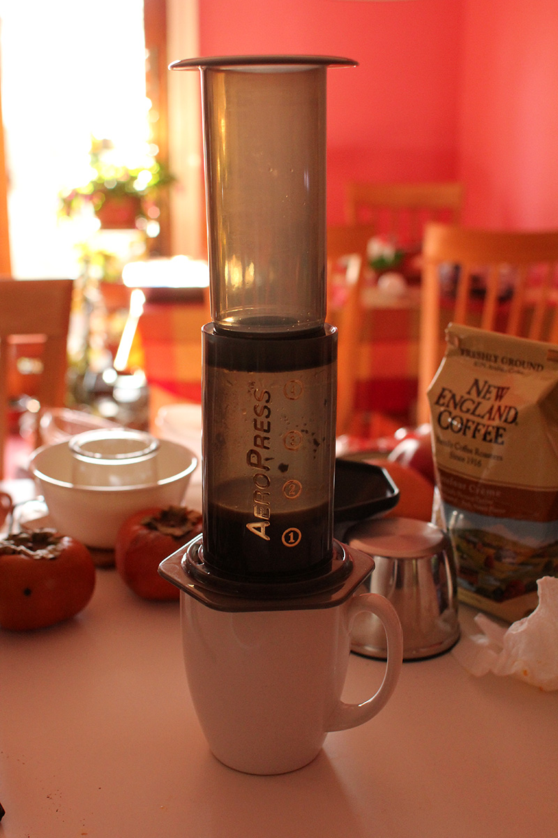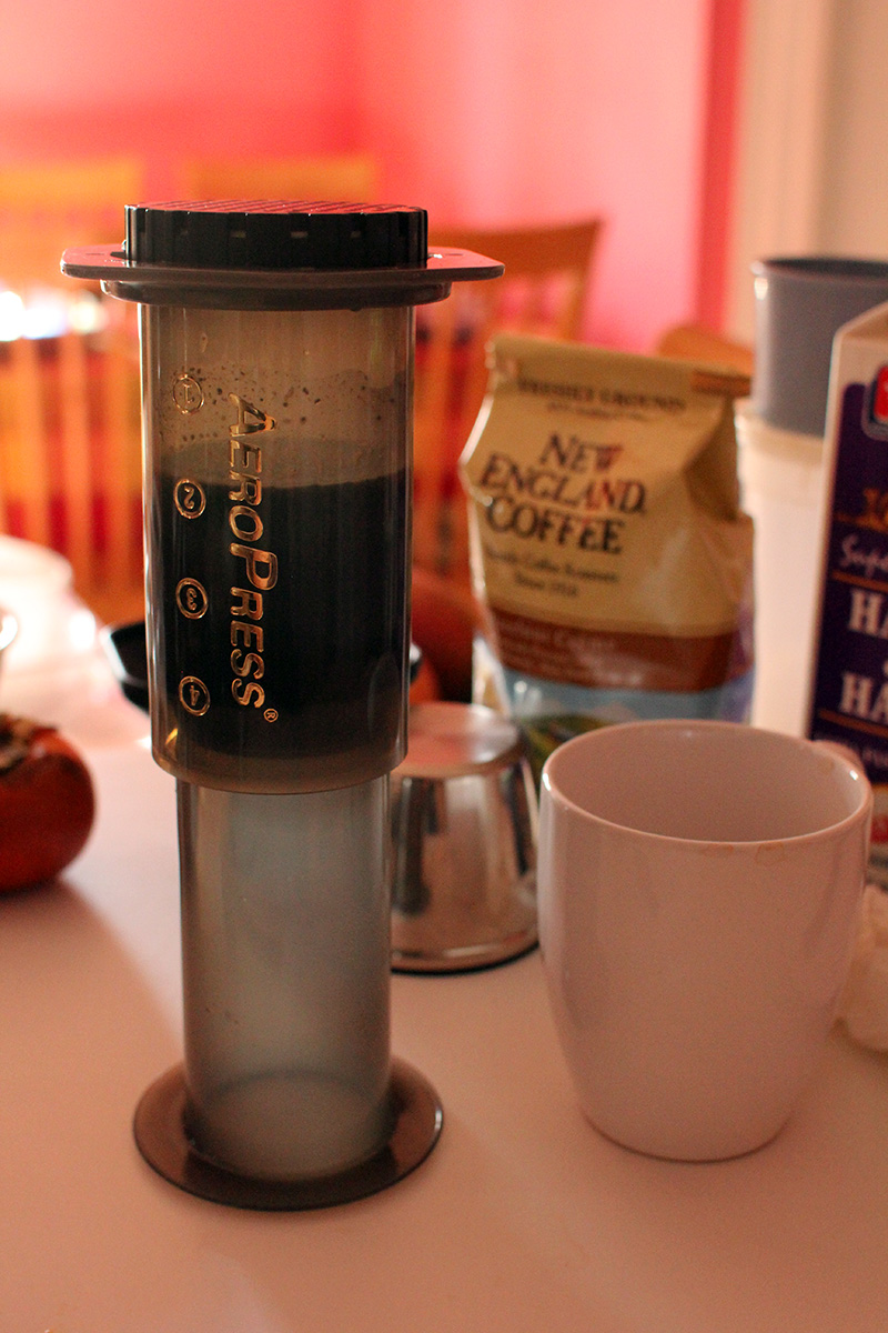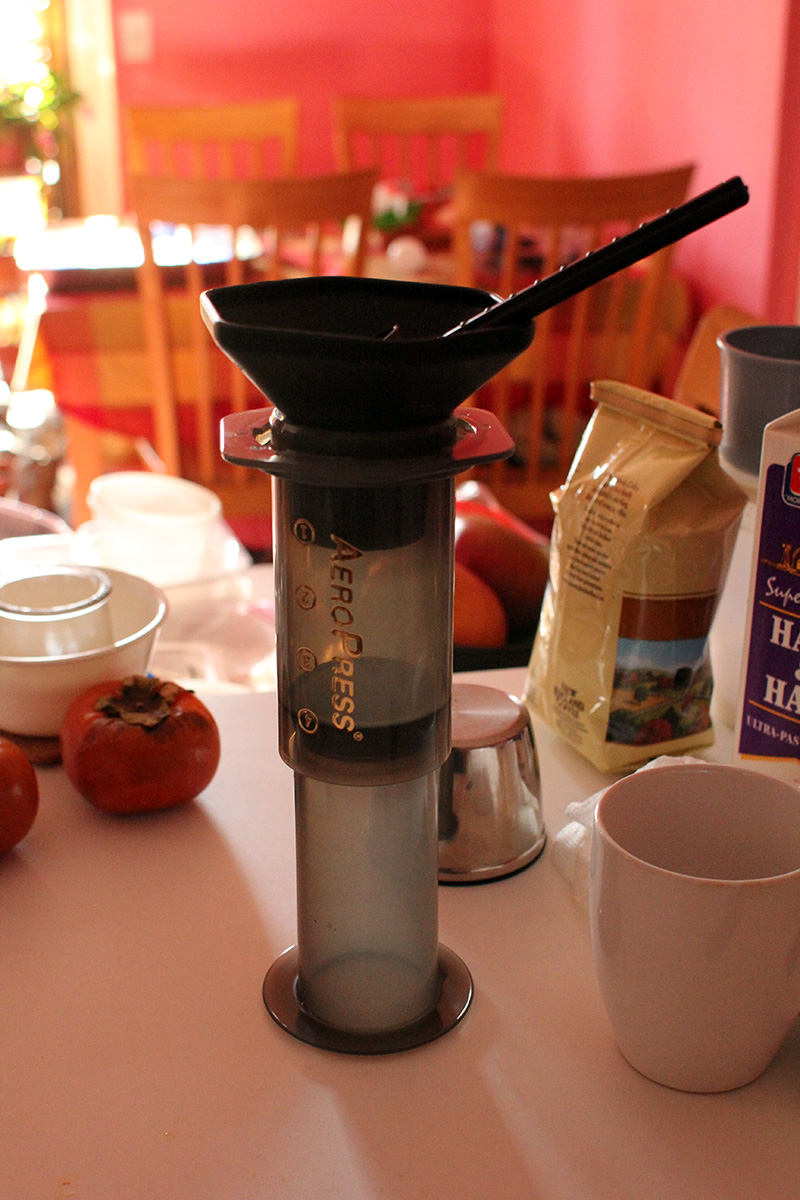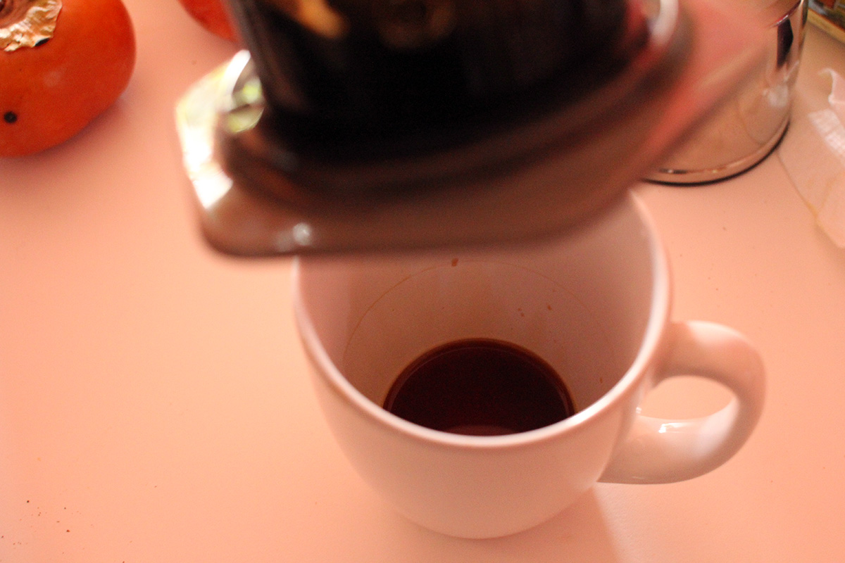 with my second attempt at using the aeropress, i opted for the inverted method. i also wet the filter to create a barrier so the water doesn't leak through the aeropress so fast, although using the inverted method makes that a non-issue. i made the mistake of adding too little water though (the direct i saw online said to fill it to the 1-2 mark) so when i eventually plunged the aeropress, it only gave me a little bit of coffee. i added some hot water to make up the balance and filled the rest with half & half and sugar. it didn't taste all that bad, very mellow, with the dilution and half & half added.