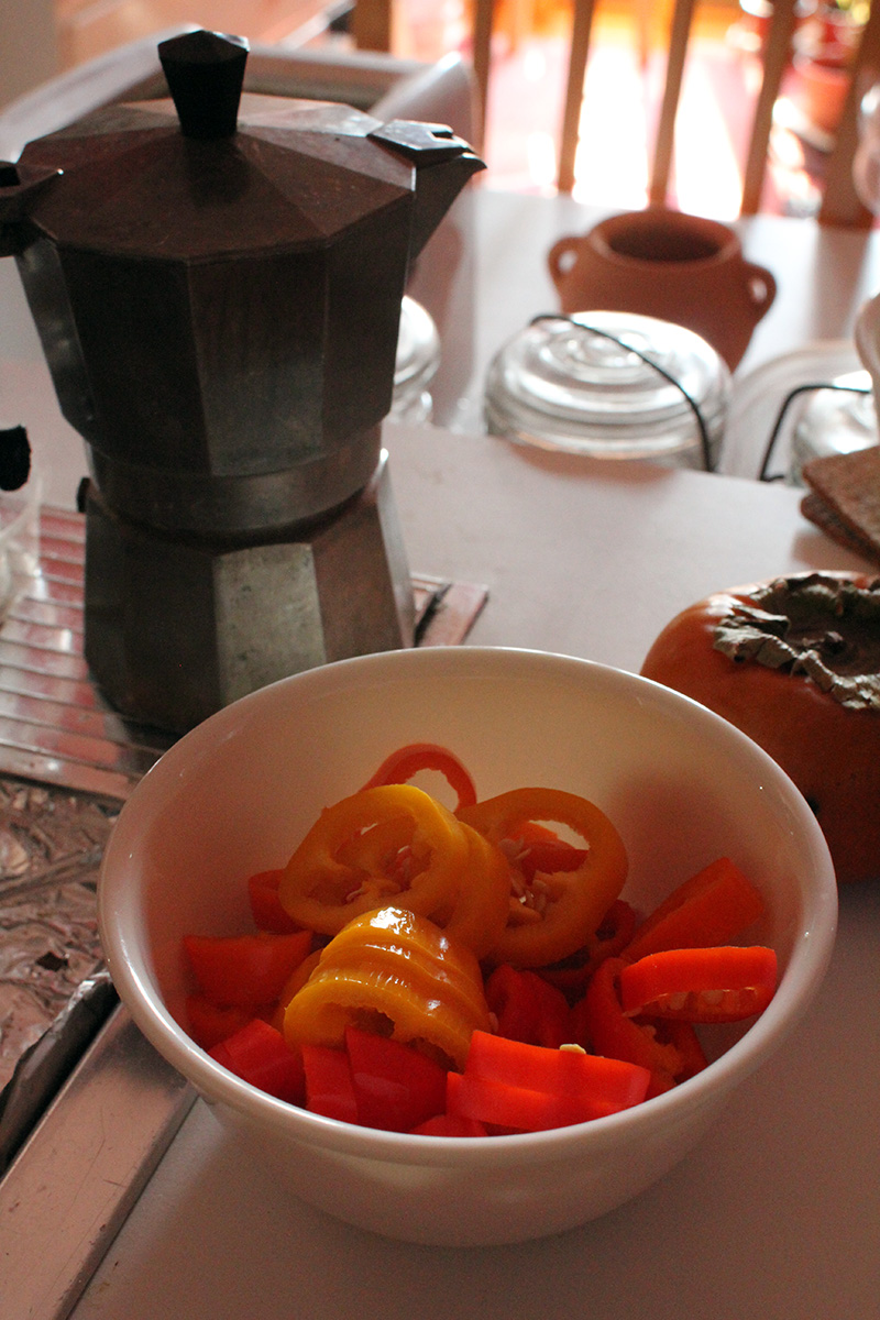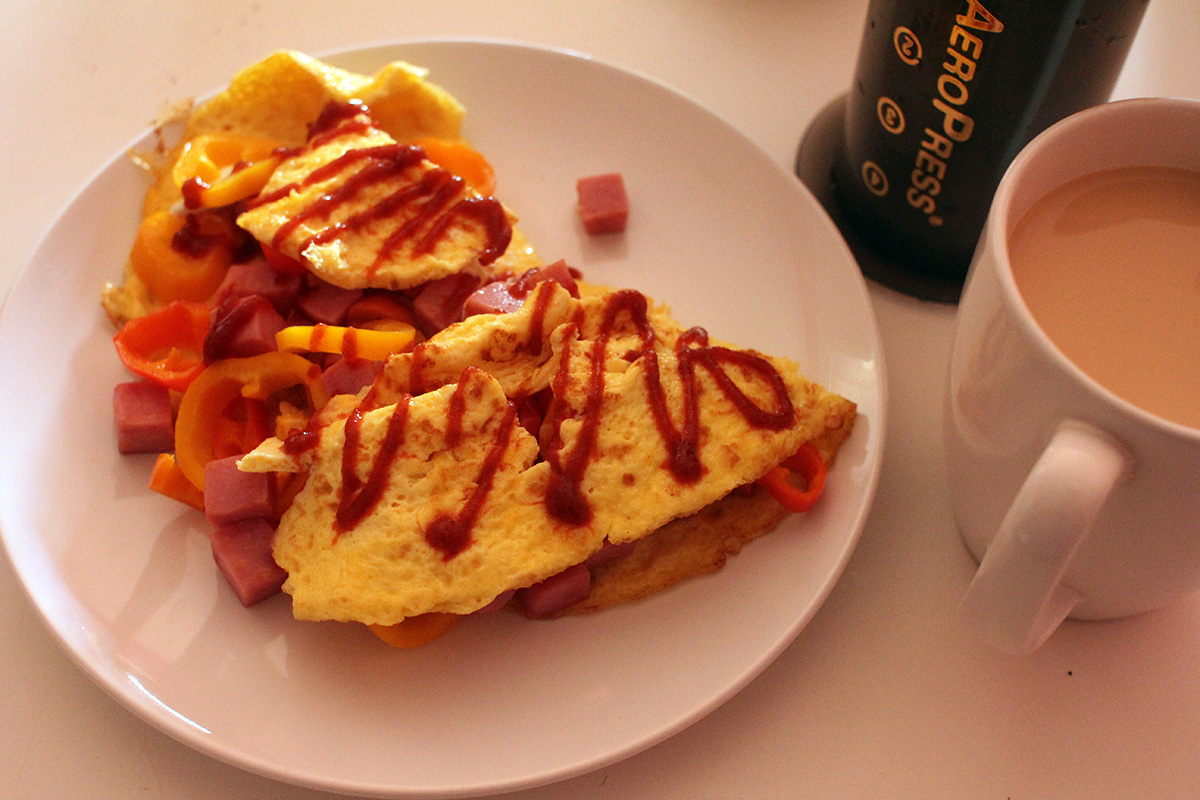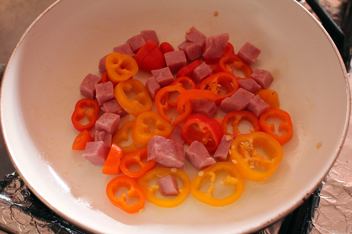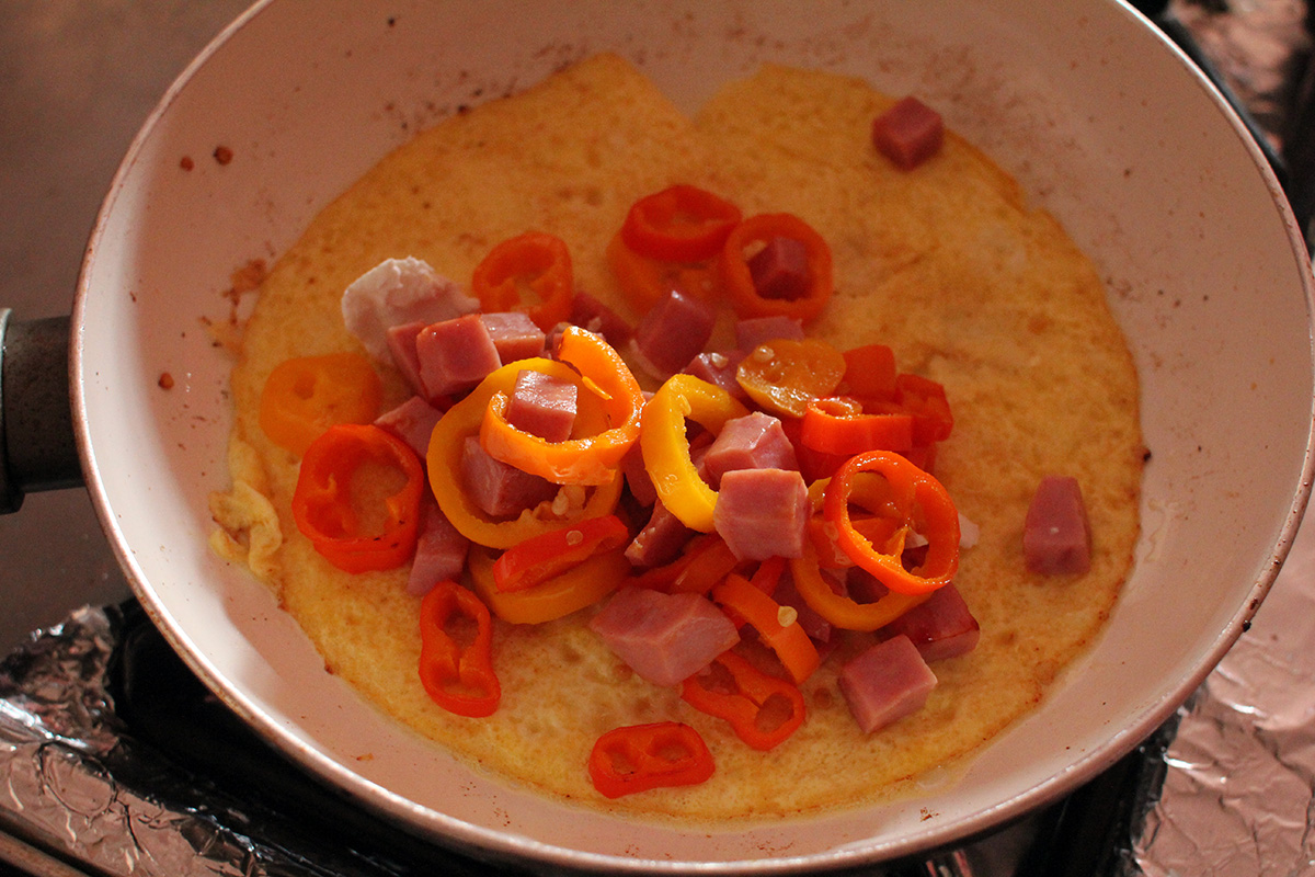 trying to improve my western omelette game, one big mistake i seem to be making is adding the "stuffing" ingredients as is without first heating them. that makes for a cold omelette. so this morning i tried cooking the ingredients first (diced ham and sweet peppers) before adding them to the omelette. i also used a bigger pan to created a larger omelette. but that made the omelette too thin (almost a crepe) and when i went to fold it in half it broke apart.
