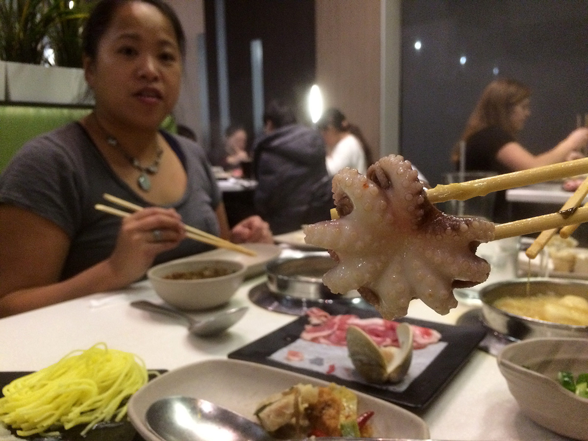 our actual server (a filipina) took our broth order from a choice of 5 flavors: dashi, spicy dashi, pork bone, spicy pork bone, and vegetarian. my parents and i got the spicy pork bone, which was the closest approximation to sichuan hot pot minus the peppercorns. my 2nd aunt had the spicy dashi which wasn't spicy at all. my sister got the regular pork bone (a white broth that looked like milk). we also ordered 4 meats: lamb ($4), tripe ($4), prime beef ($6), and seafood combo dinner ($7). the meats were well portioned, and must be subsidized by the cost of the buffet as they're cheaper than elsewhere when you order by the plate.