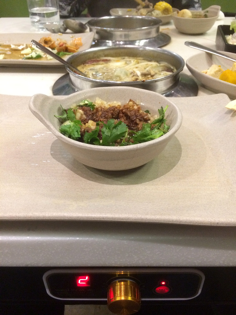 the buffet counters were a dazzling sight; i wanted to take photos but got all self-conscious as the feeding frenzy of customers began (fortunately there's a gallery on the website). there was a counter of vegetables, a counter of different noodles next to a section of different mushrooms (shitake, wood ear, oyster), a counter of different fishballs and tofu, and two twin counters of sauces. when i returned to my table with my plate of food, they'd already delivered the broth which was boiling at the table. i went back to the buffet counter to mix my sauce: scallions, cilantro, minced garlic, shacha sauce, sesame oil, chili oil, and soy sauce. the only thing that was missing to make it even more delicious was a square of fermented tofu.