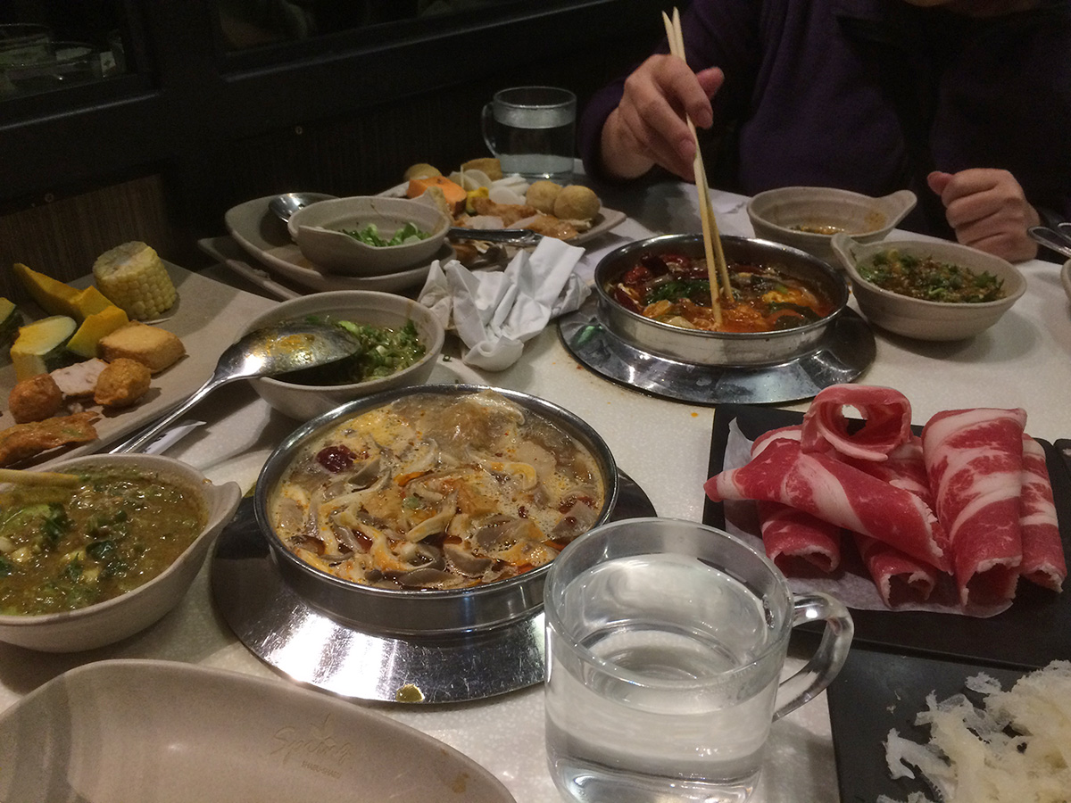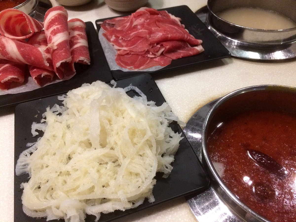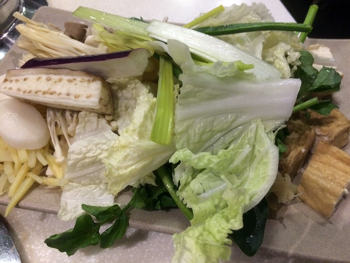 this being our second time in three days, we were seasoned pros at the art of shabu shabu buffet. we decided to get a table closer to the buffet counters, away from the far end of the restaurant where it was colder. they ended up giving us a table along a busy walkway, what we made up for in convenience we lost in privacy. our greeter was the same girl who was our waitress 2 nights ago, but she didn't seem to recognize us. i noticed when my father went to the food counters he was stocking up on tofu. i took an ice cream break in between plates of food. i didn't take any noodles this time, but like my father i too love the tofu, though not as much as he does. i took some frozen korean rice cakes and these crunchy gluten nuggets. i also didn't take too much leafy vegetables but did stock up on the different mushrooms. i ate until i couldn't eat anymore.