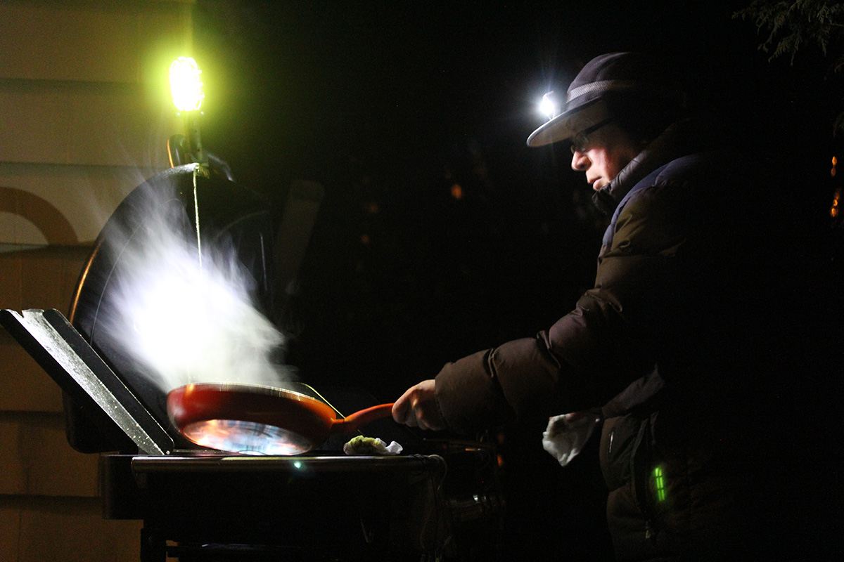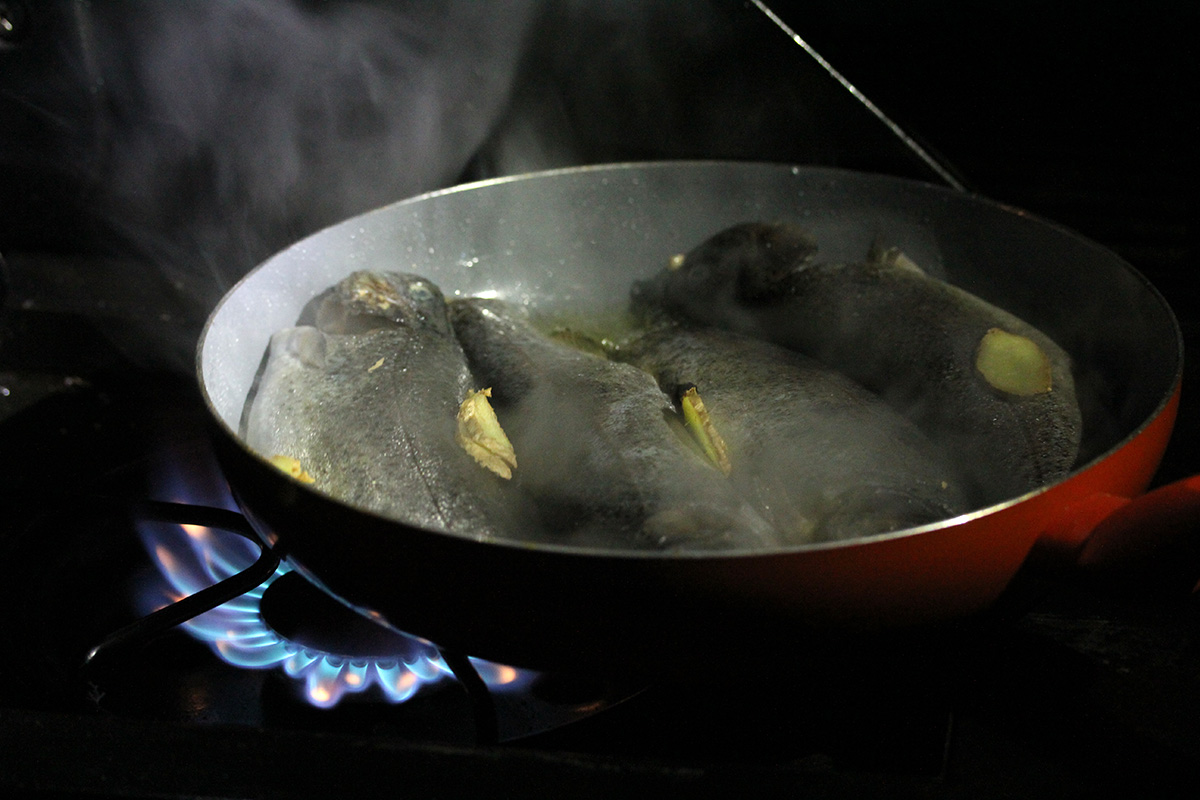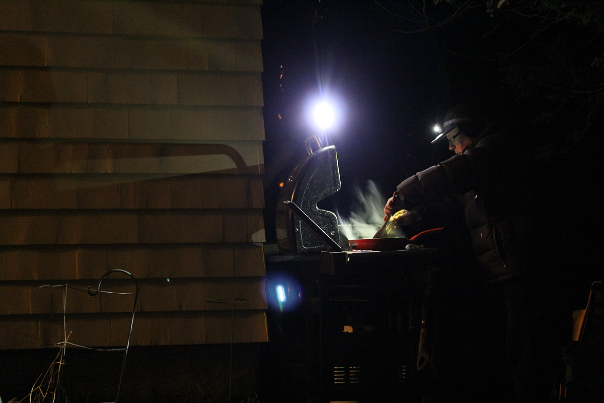 my father pan-fried the trouts i bought yesterday outside on the barbecue grill. i brought my 300 lumens black diamond headlamp so he could see what he was doing. i took some photos using a tripod and the 60mm lens. after dinner i rode home before 8pm.