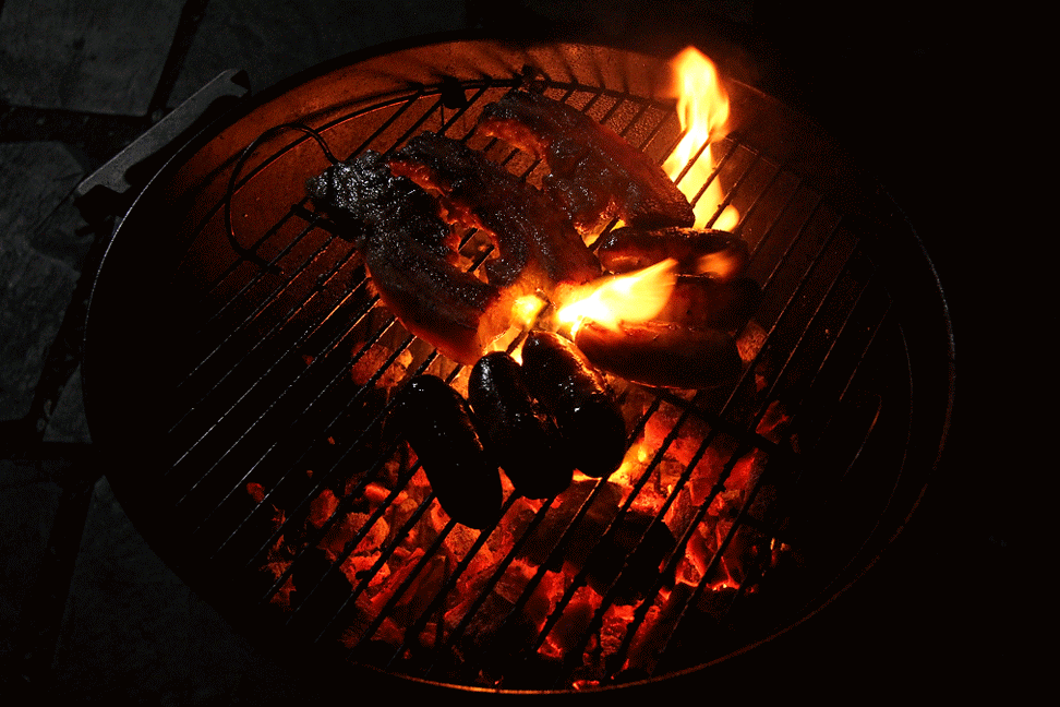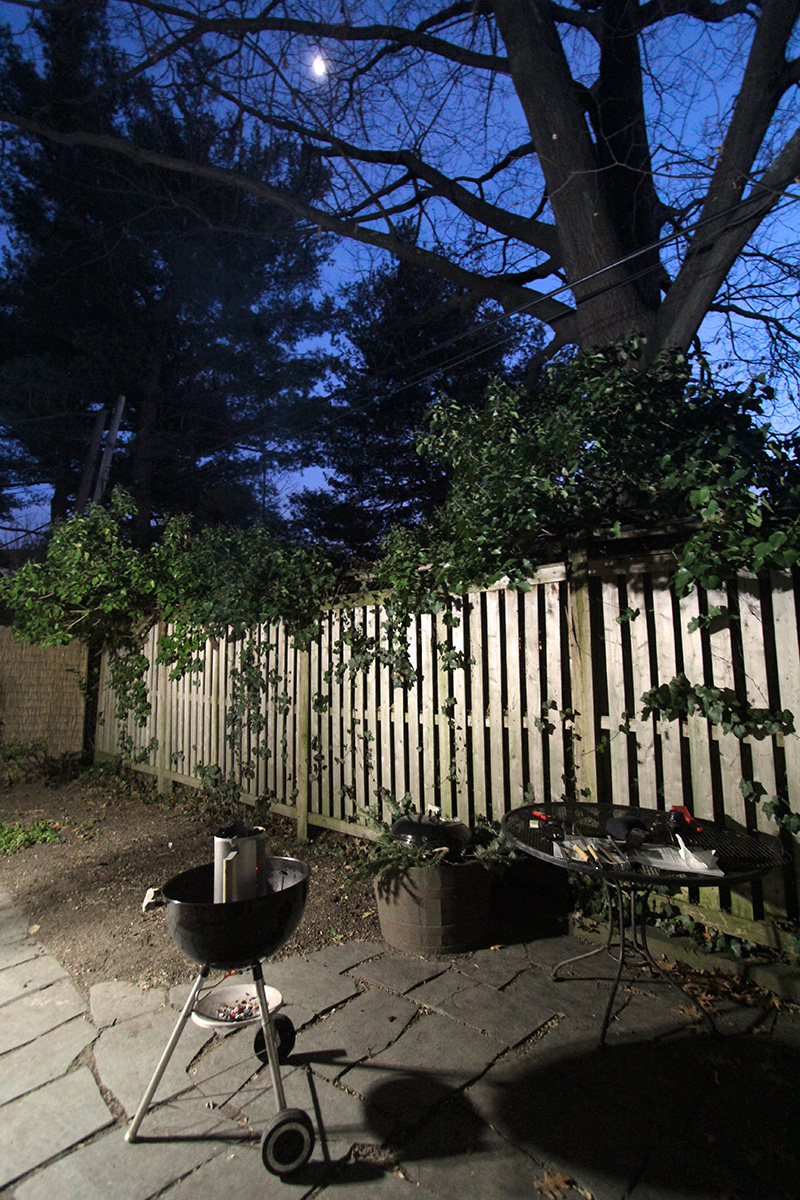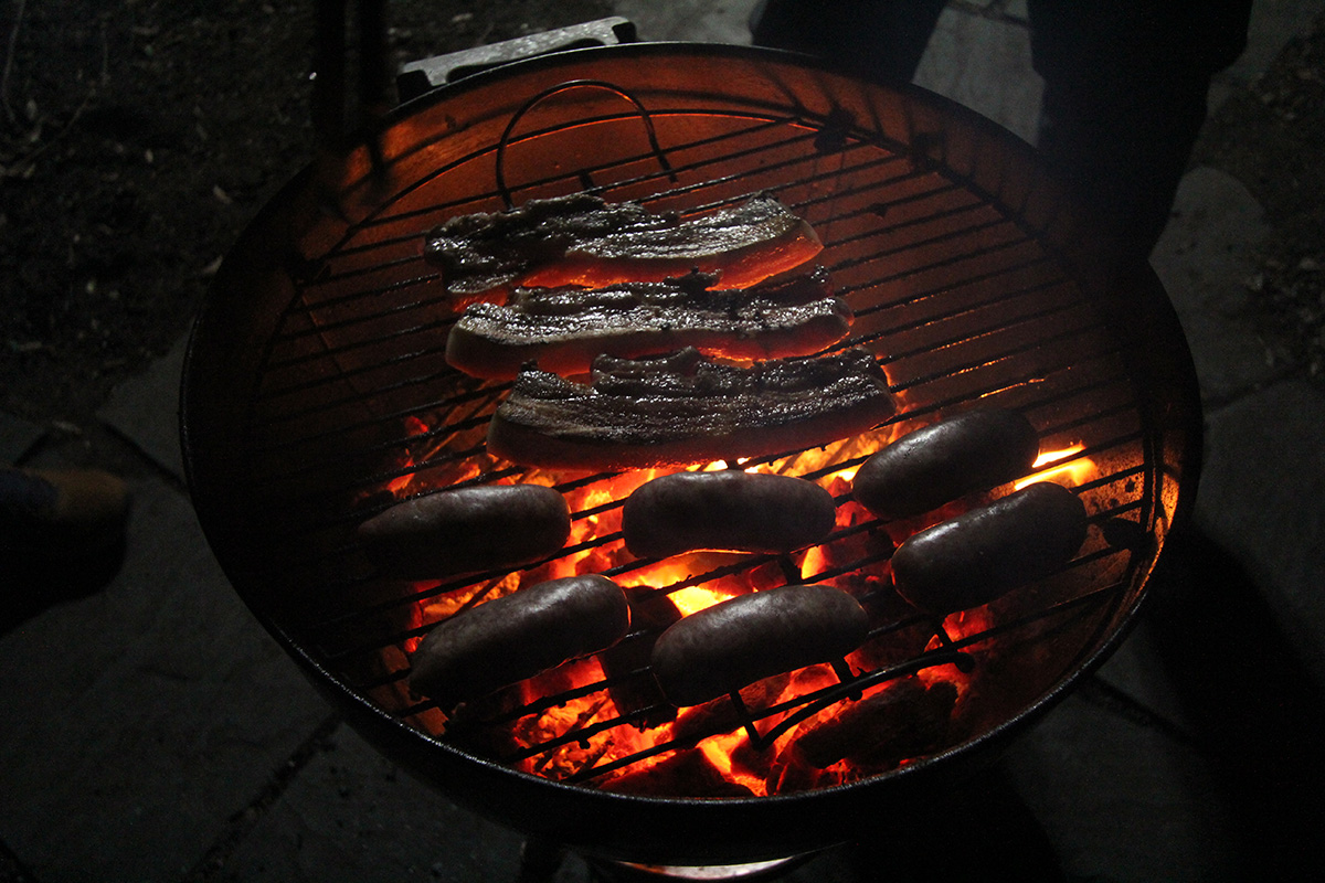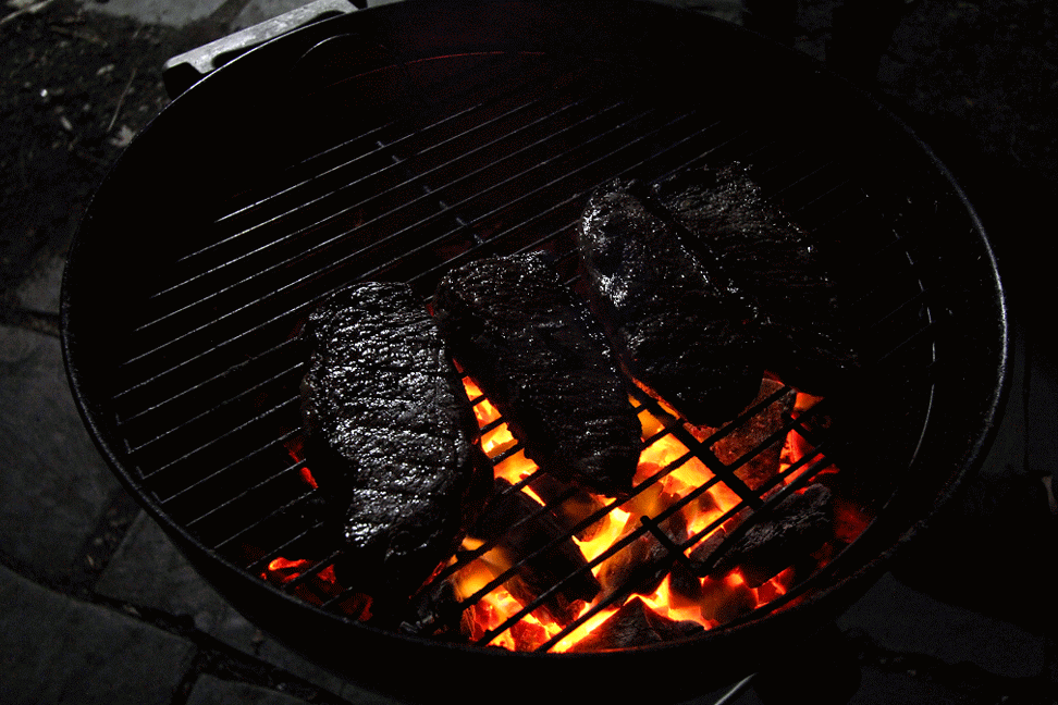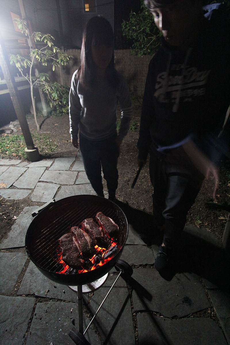 we were finally ready to cook the rest of the meats by 7pm, everyone coming out to stand around the barbecue. i had on a thick throwaway hooded sweatshirt so i don't get grease and ember stains on my clothes. we started with the 4 steaks rubbed with kosher salt and pepper before grilling. because these were leaner cuts compared to last time, there wasn't as much flare ups. the heat didn't seem very hot at first (i could hold my hands above the grill for 5-8 seconds easily) but as we cooked it gradually became hotter to the point where i could only hold my hands above the grill for 1-2 seconds.