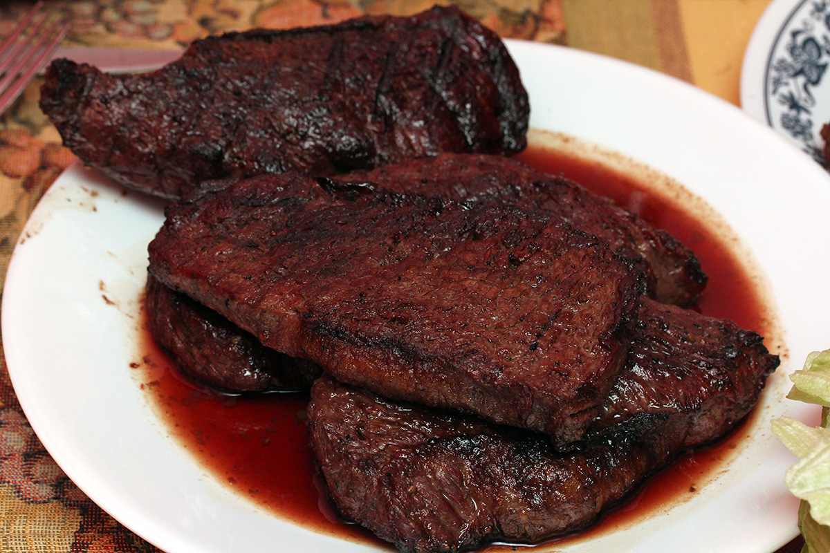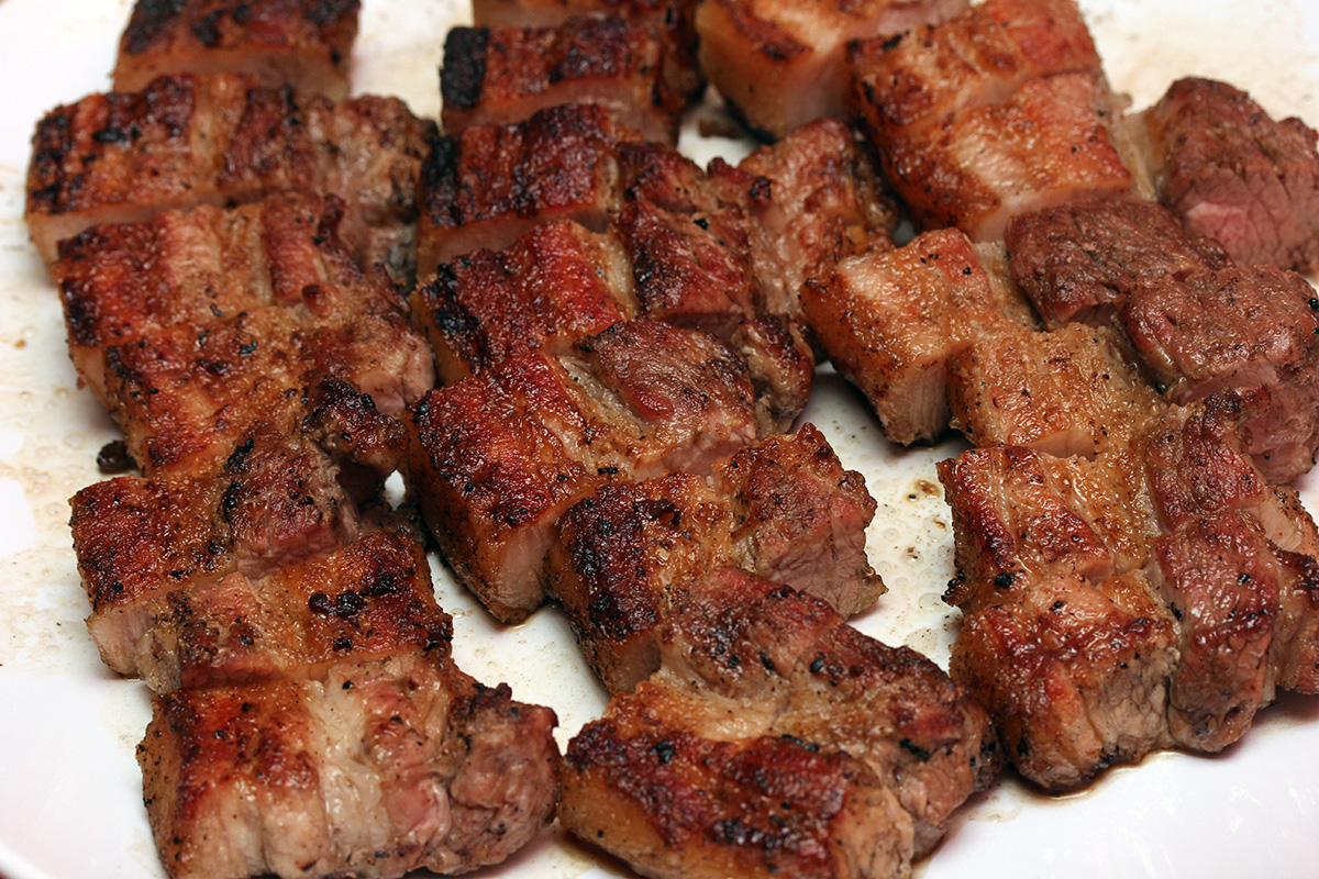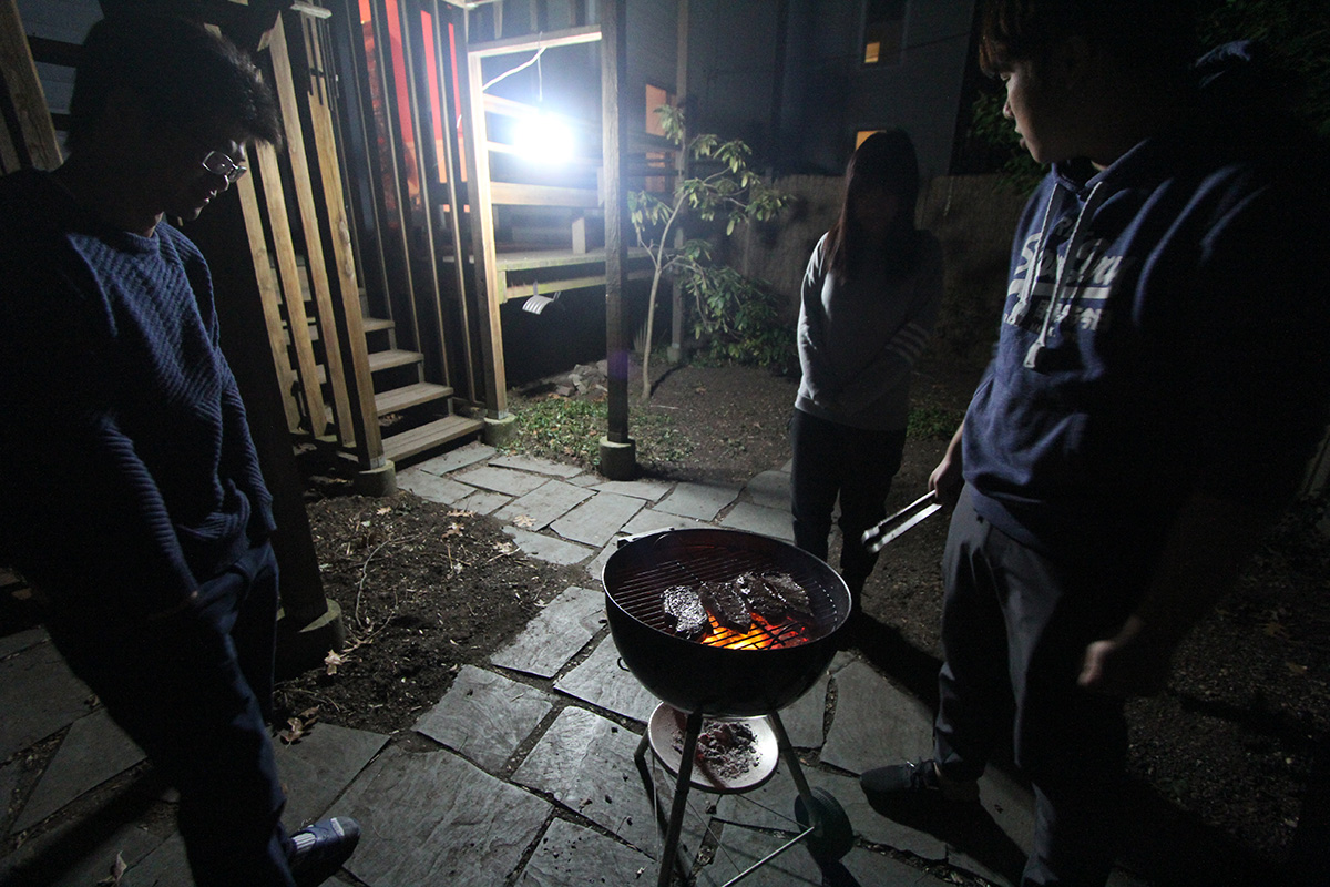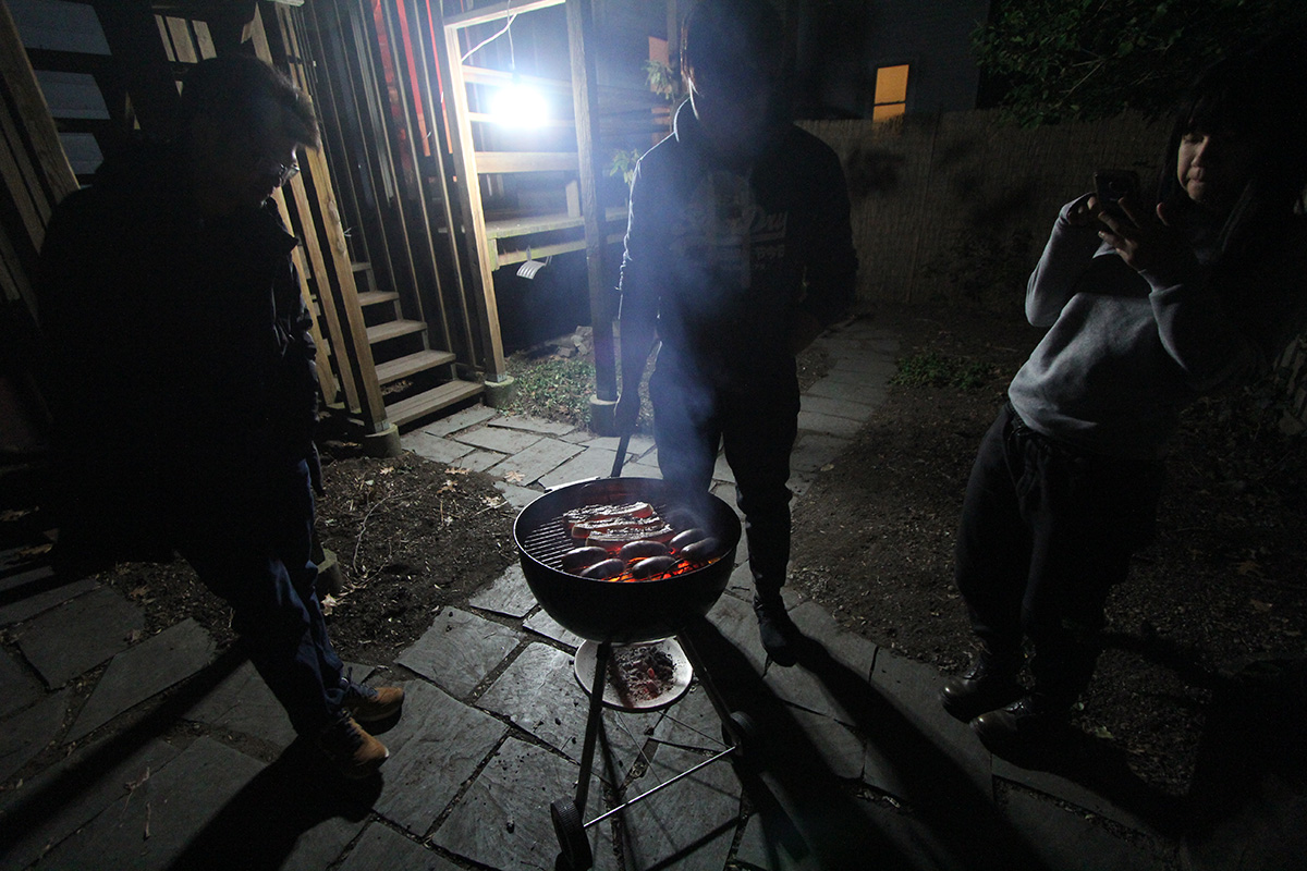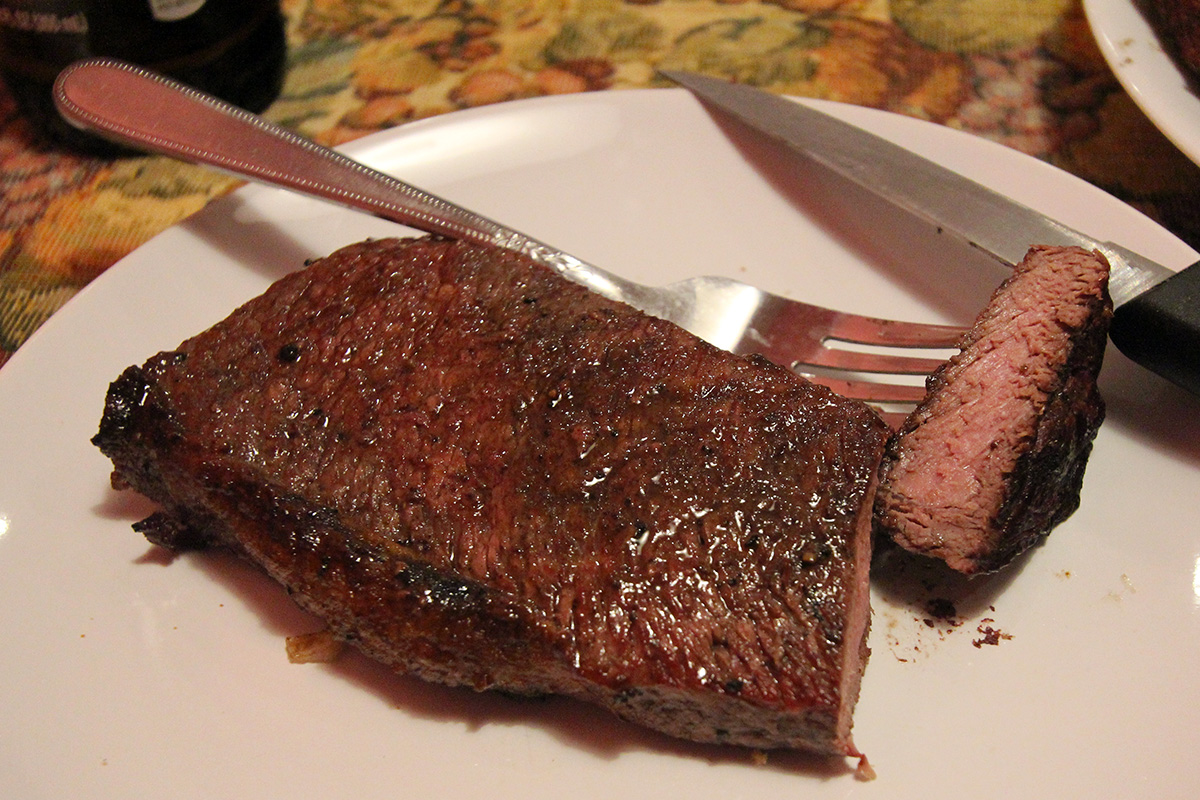 we were finally ready to cook the rest of the meats by 7pm, everyone coming out to stand around the barbecue. i had on a thick throwaway hooded sweatshirt so i don't get grease and ember stains on my clothes. we started with the 4 steaks rubbed with kosher salt and pepper before grilling. because these were leaner cuts compared to last time, there wasn't as much flare ups. the heat didn't seem very hot at first (i could hold my hands above the grill for 5-8 seconds easily) but as we cooked it gradually became hotter to the point where i could only hold my hands above the grill for 1-2 seconds.