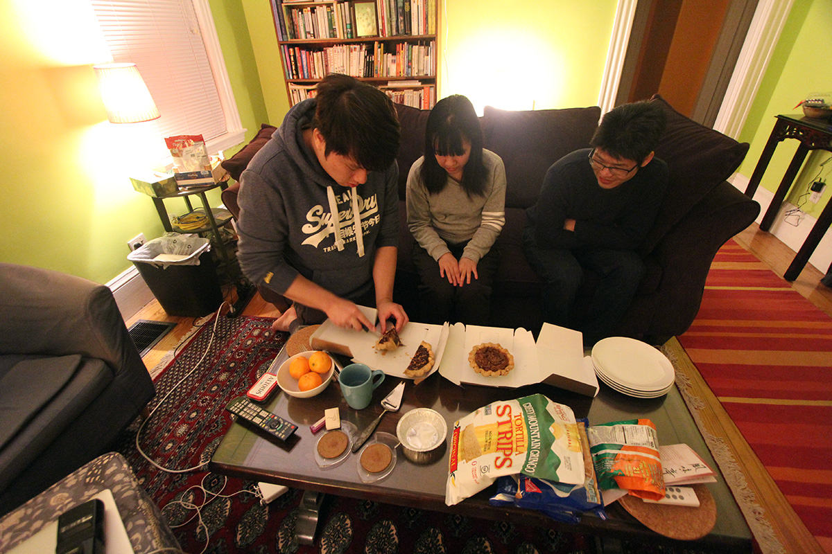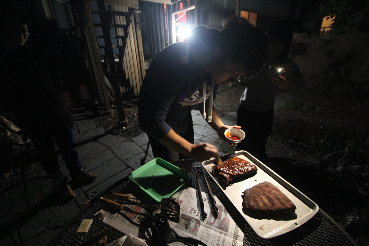 sandy had sliced up the pork bellies into nuggets; they were good as-is with a crispiness. she made a sauce using soy sauce and sugar but i didn't like it, and we didn't have any salt-pepper dipping sauce like they do in korean restaurants. the italian sausages were okay but could've used some additional time on the grill as they were still a little soft in the center. finally, there were the ribs, which kelvin was raving about (as he was also the ribmaster). they tasted good on their own - i didn't think much of the dry rub but it left a good flavor - but the sticky sweet sauce elevated the ribs even more.
