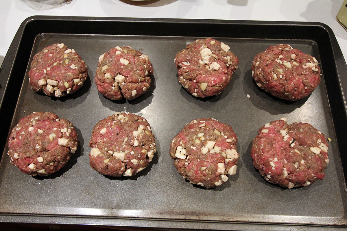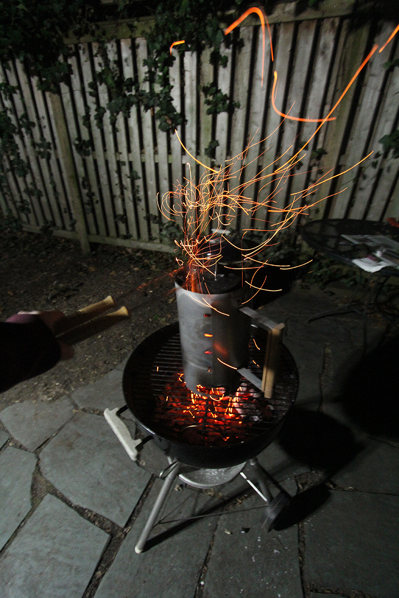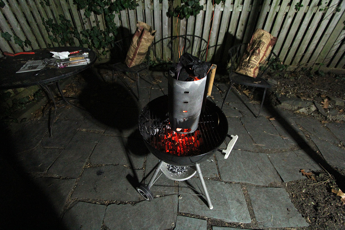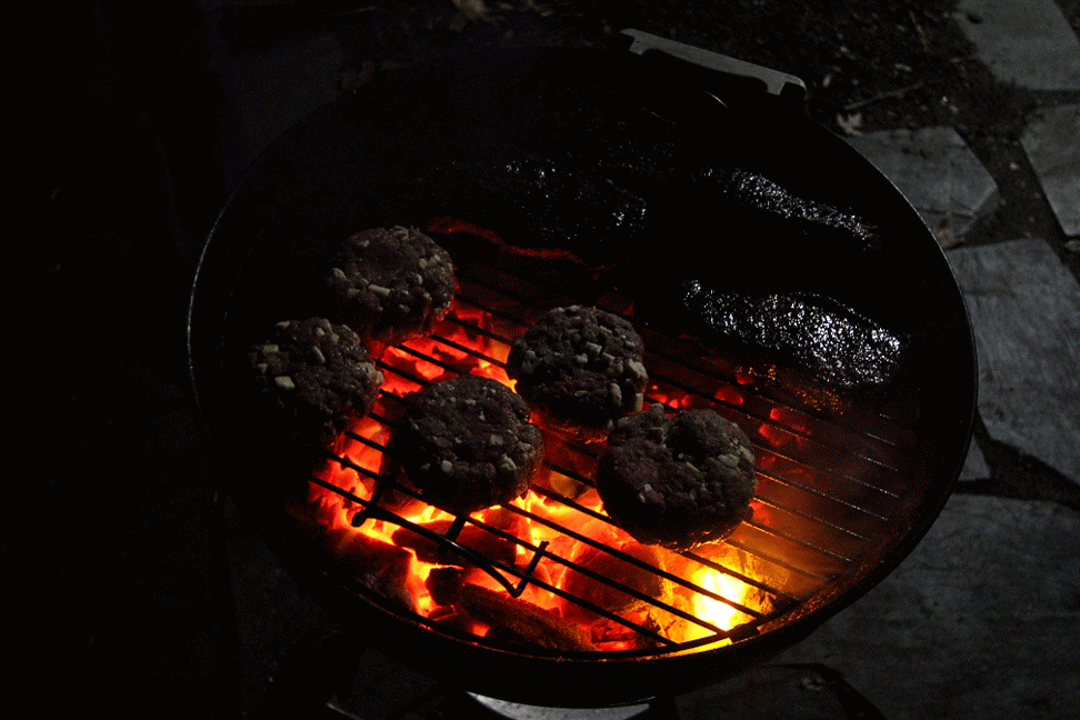 the first batch had already cooled enough by then it wasn't giving off much heat even though charcoal bits were still glowing. i think the first batch didn't burn as long because it was mostly small pieces of charcoal from the bottom of the old bag. the second batch charcoals were from the new bag and came out in large lumps that retained more heat. while we were waiting for the coals to reach grilling temperature, i also prepared the burger patties.