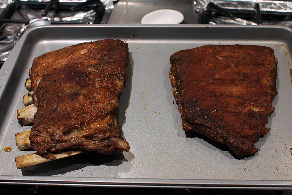at 5pm i began lighting the first batch of charcoal for cooking the ribs. kelvin read that the best way to cook the ribs is to wrap them in 2 layers of aluminum foil and throw them directly onto the charcoal. i told him that was fine, but the ribs would block the heat so we wouldn't be able to cook. so the idea was to do two batches: a first batch just to cook the ribs, a second batch for the other meats. he prepared his ribs, first trimming off any excess skin, then covering it with a spice rub he created that was a combination of salt, italian herbs, paprika, and peppers.