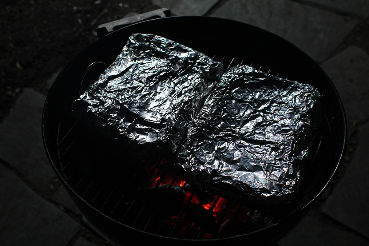 we ended up putting the ribs (3 layers of heavy duty aluminum) on the grill grate instead of directly onto the charcoal. at 6pm we flipped the ribs, at 6:30pm we took them out to cool while i began the second batch of charcoal. in hindsight, cooking the ribs in this fashion was a waste of charcoal, since the ribs could've just as easily been cooked in tin-foil in the oven. the only crucial part was the eventual grilling with barbecue sauce which comes later.
