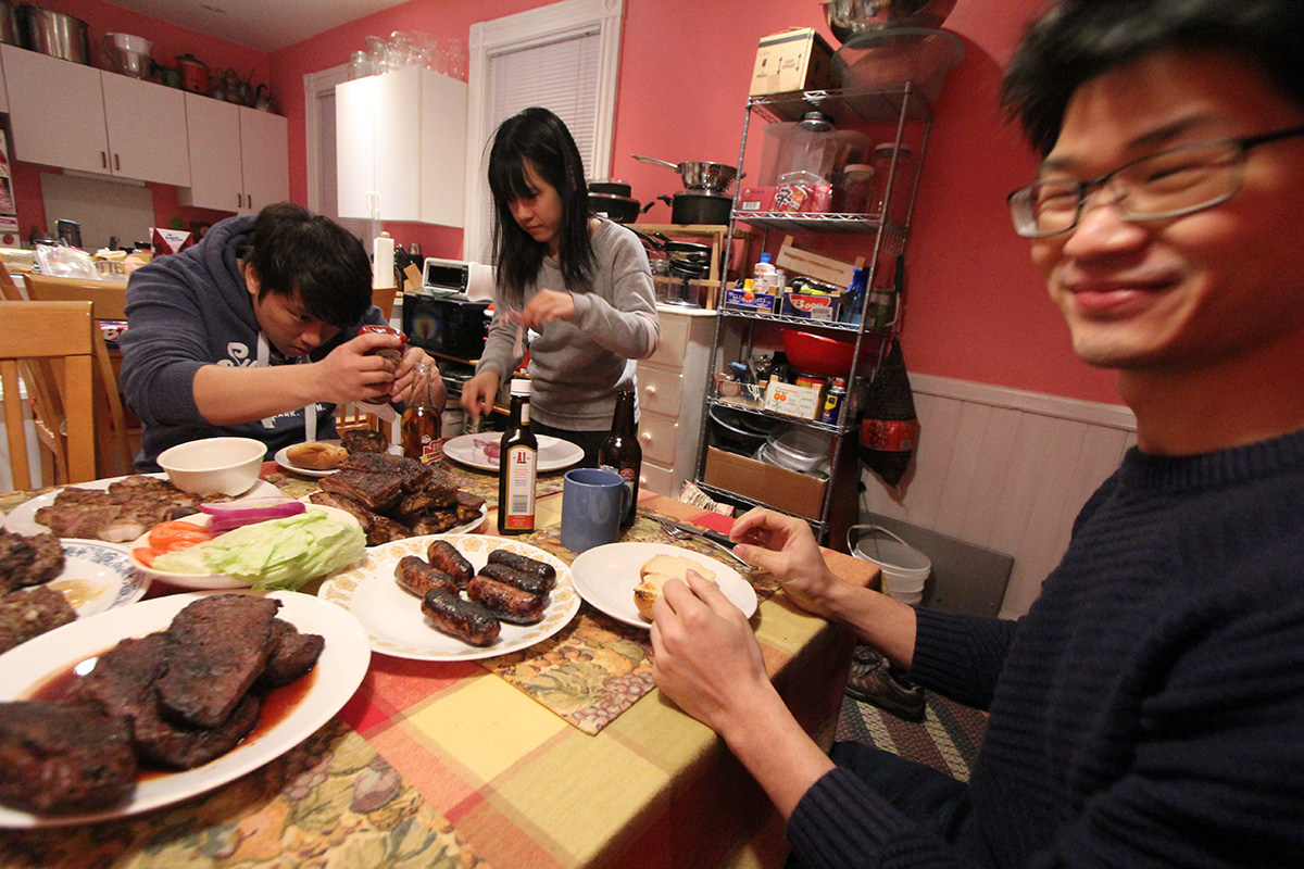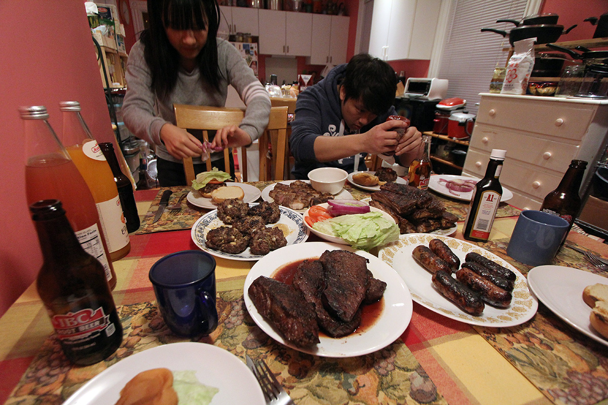 with all the meats cooked and everyone back inside, it was time to eat. by that point it was already 8pm. we ate on the dining table with just enough seats for 4 people. the steaks were cooked to medium which i like, but a little too tough for sandy and kelvin who prefer medium-rare. the burgers on the other hand weren't cooked long enough and there was still a bit of rawness in the center like a medium-rare.