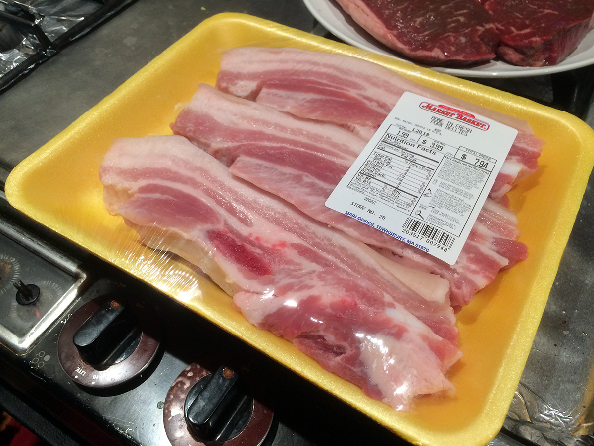 around 12:30pm we walked to market basket to pick up some barbecue ingredients. i already had steaks (2.4 lbs. $14) and italian sausages in the fridge. i got some ground beef (2 lbs. $7) and gorgonzola blue cheese ($1.50) to make burgers while kelvin got a 5.25 lbs. slab of st.louis ribs ($15.70) and 2 lbs. of pork bellies ($8).