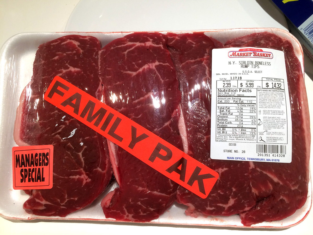 around 4pm i brought out the steaks so they could warm up to room temperature. i bought these boneless sirloin rump tips on saturday, and they had already gone a little dark, no longer the bright red of fresh beef. seeing that we might not have enough hardwood lump charcoal for two burns, i rode the bike to the ace hardware store in porter square to look for charcoal. i didn't see any upstairs until i asked someone who told me they had more supplies in the basement. i found 8.8 lbs. bags of cowboy brand 100% all natural hardwood lump charcoal (what i had before). after a price check, i found out it was $9.99. i also learned that charcoal is not taxed as i went to pay.
