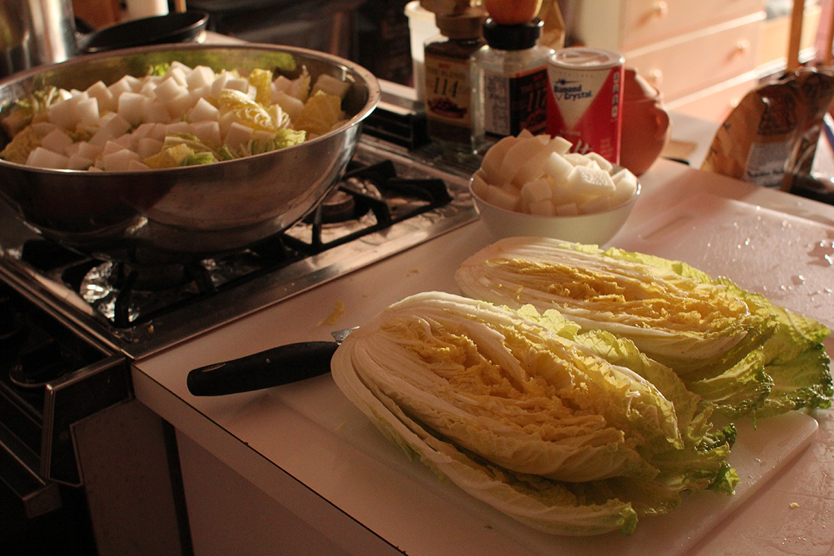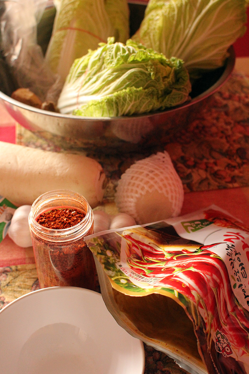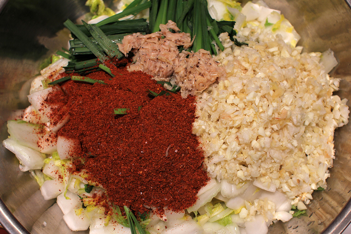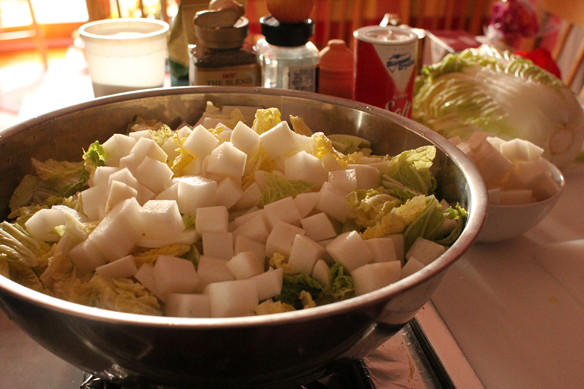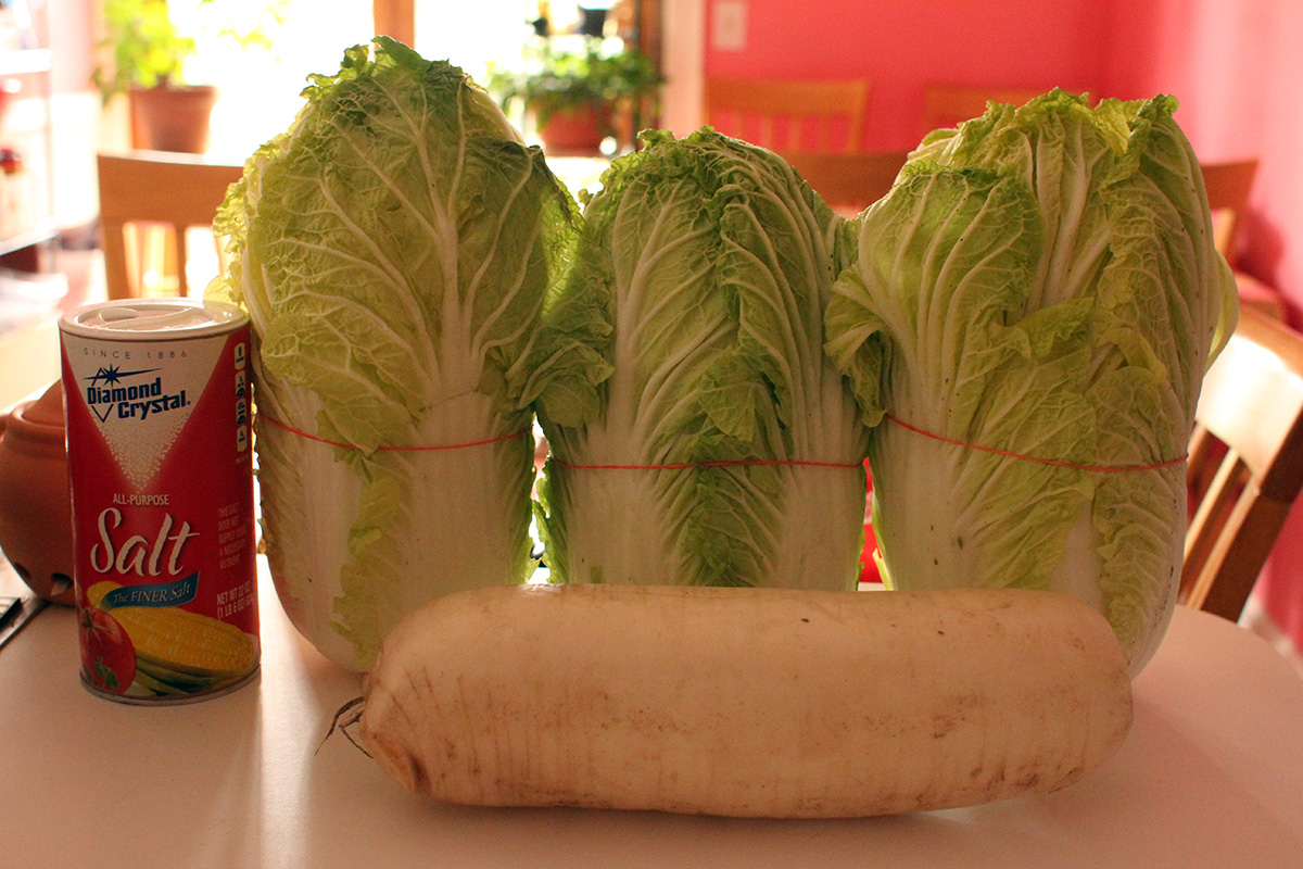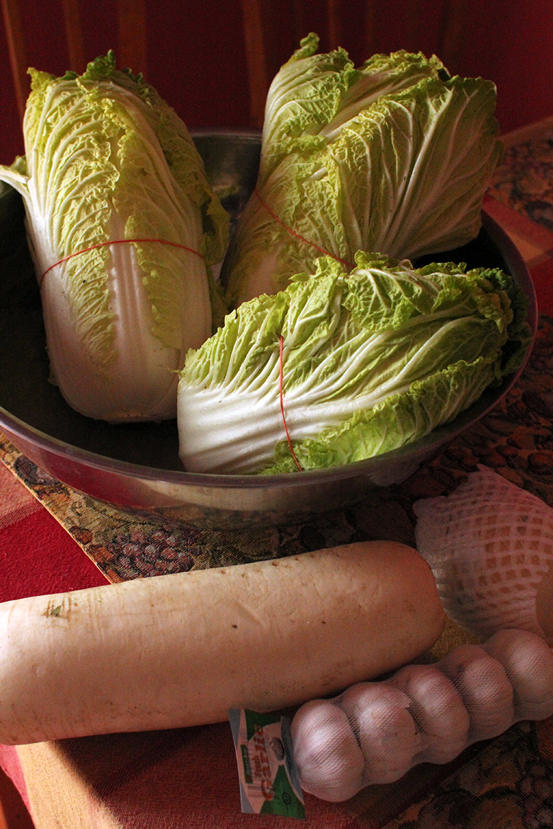 7.59 lbs. napa cabbage 3.02 lbs. daikon radish 5.75 tbsp fine salt 2 tbsp salted shrimp paste 14 tbsp red pepper powder |