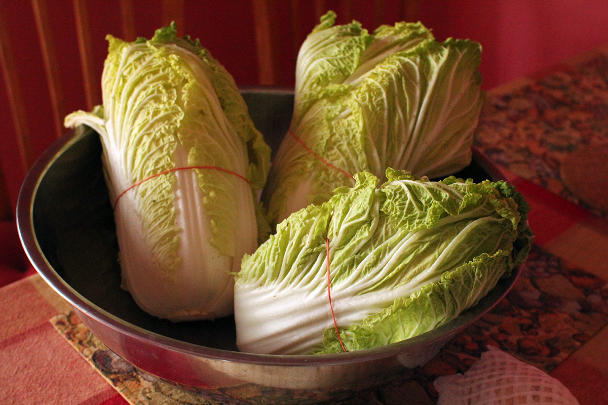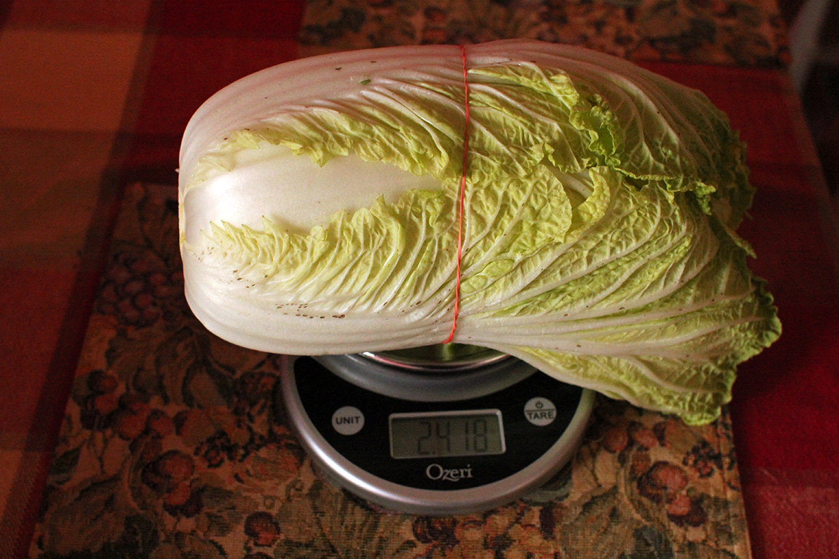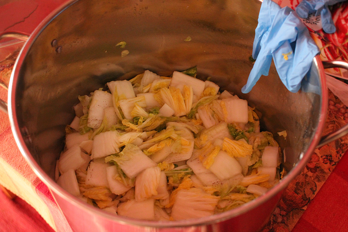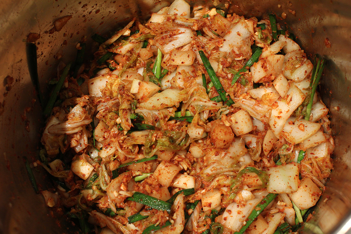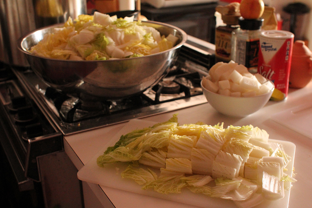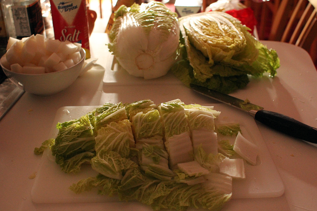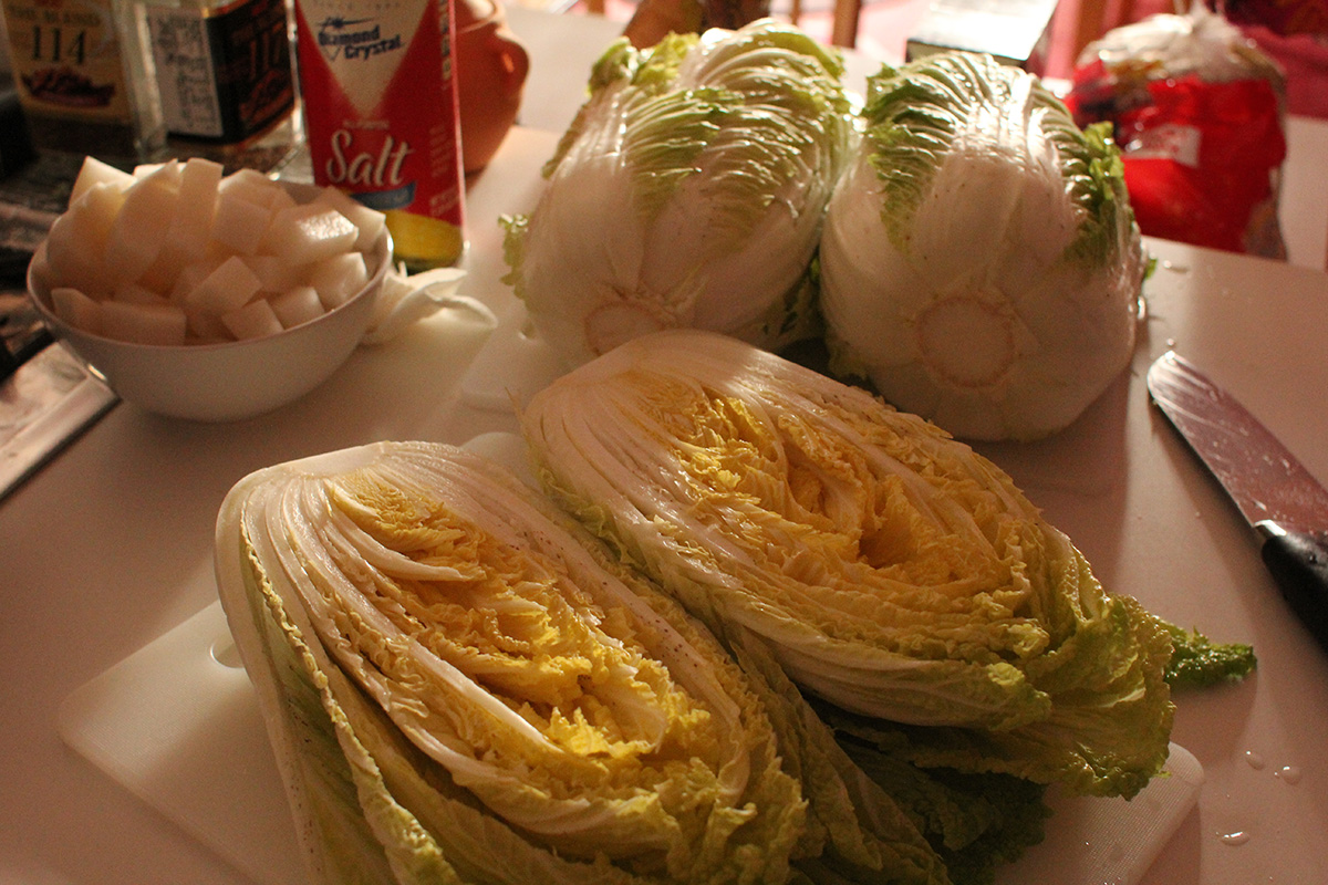 7.59 lbs. napa cabbage 3.02 lbs. daikon radish 5.75 tbsp fine salt 2 tbsp salted shrimp paste 14 tbsp red pepper powder |