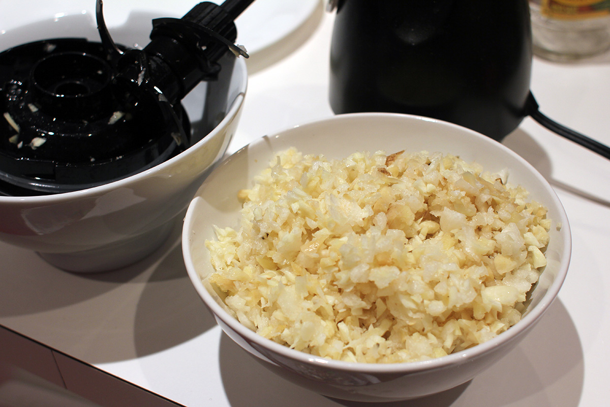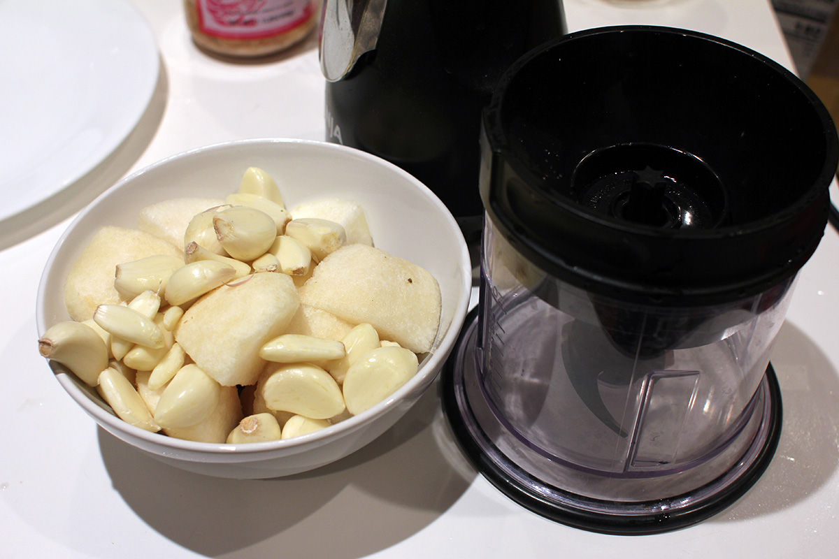 0.20 lbs. ginger, processed 2 heads of garlic, processed 1 asian pear (0.67), processed 0.32 lbs. garlic chives, chopped |