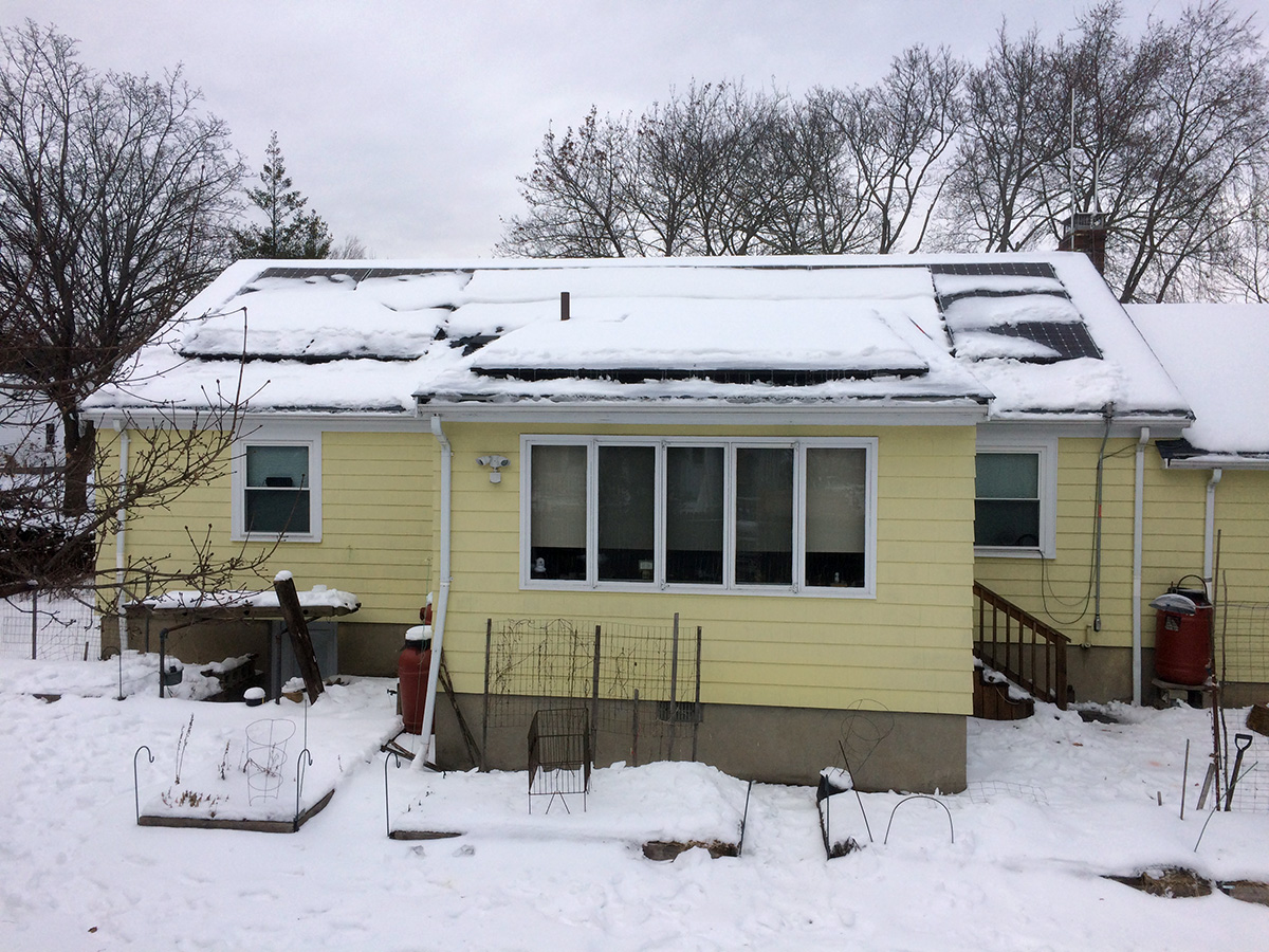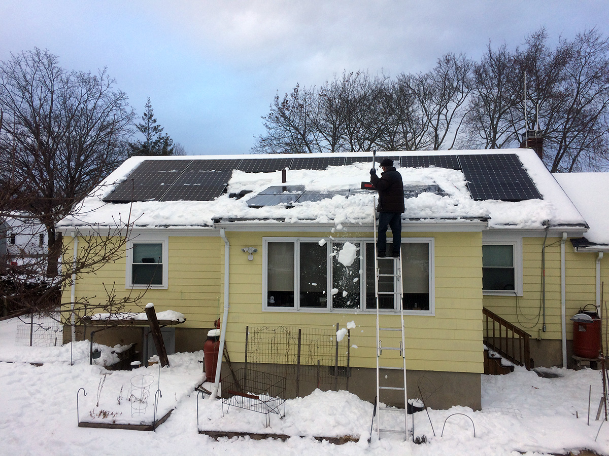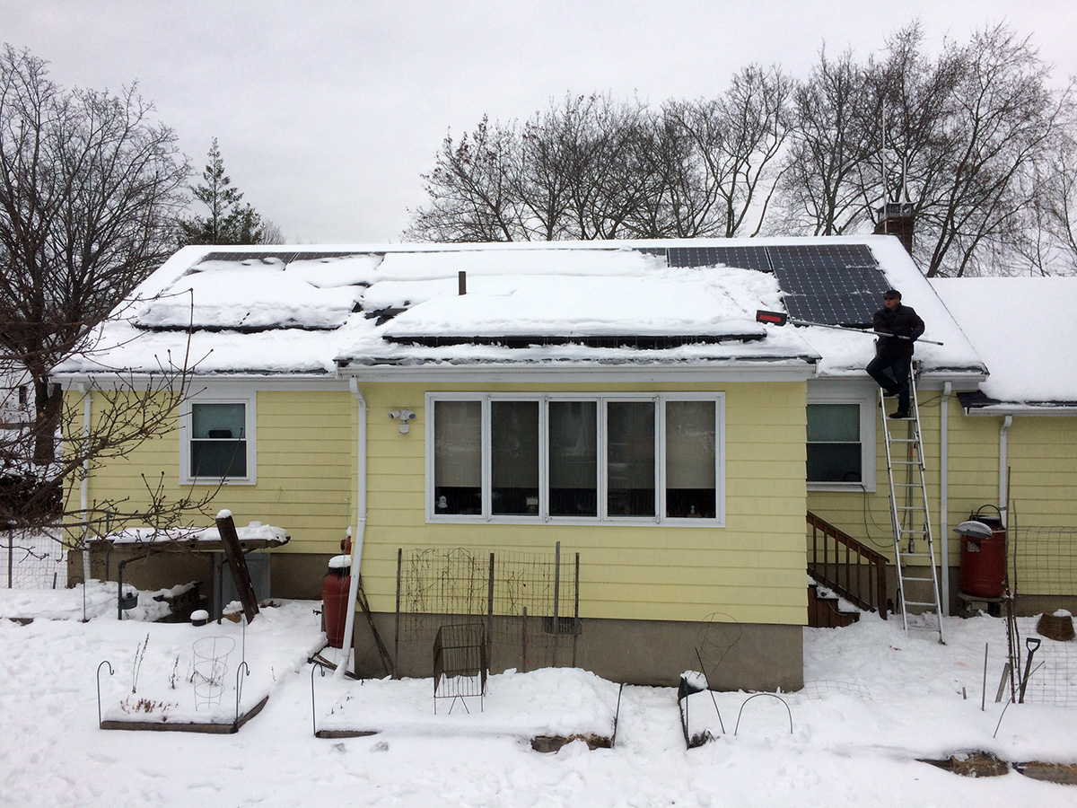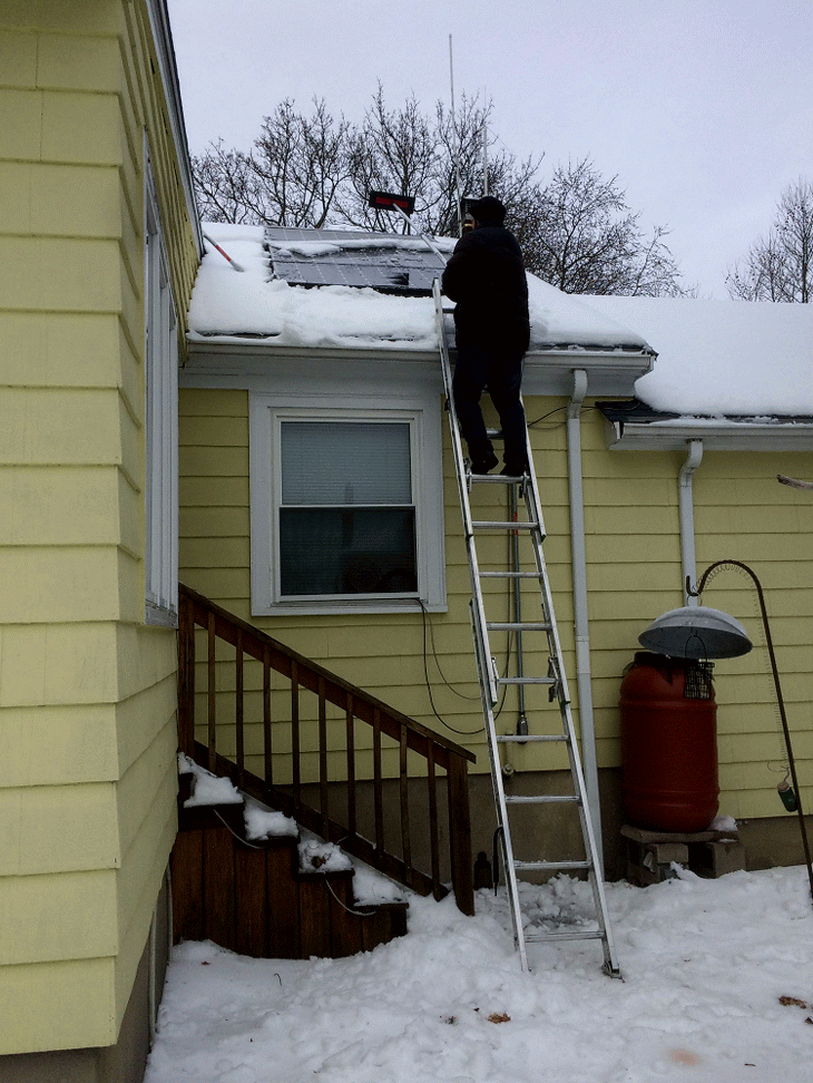 my father and i then went to belmont to clean the snow off of the solar panels. the panels above the dining room area had melted the most, but all the panels were still covered. with the melting snow creating a slick surface on the panels, it all took was some gentle tapping with the sno-pro roof rake to create avalanches of falling snow. the area on the main roof above the sunroom was harder to get to. my father removed what he can but left the rest to melt. then there was the snow on the sunroom panels. the slope isn't enough for the snow to slide off on its own so we had to help it along, working from the bottom edge. the top layer was a thick ice crust 2 inches thick, while down at the bottom was a centimeter layer of melting ice. i cleaned as much as i could before my father had a turn. he seemed to have a knack for snow removal, hitting the snow with a karate chop of the snow rake to break it apart before sliding it off the panels. we stopped with 3 sunroom panels still partially covered and 3 more entirely covered. hopefully the melting will take care of the rest.