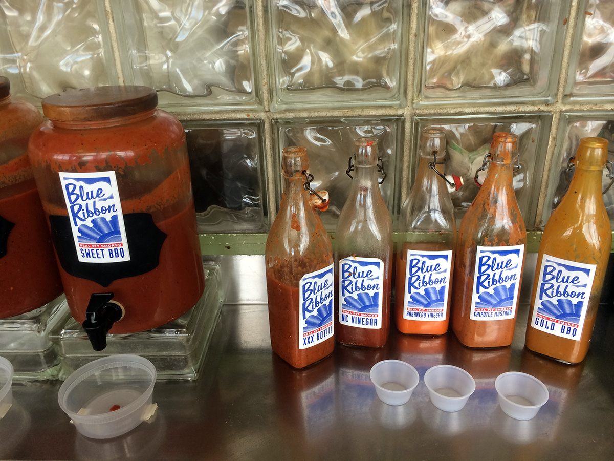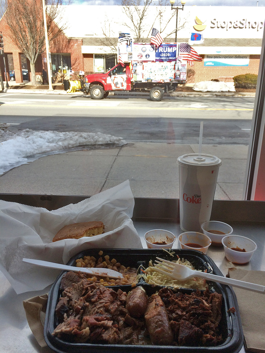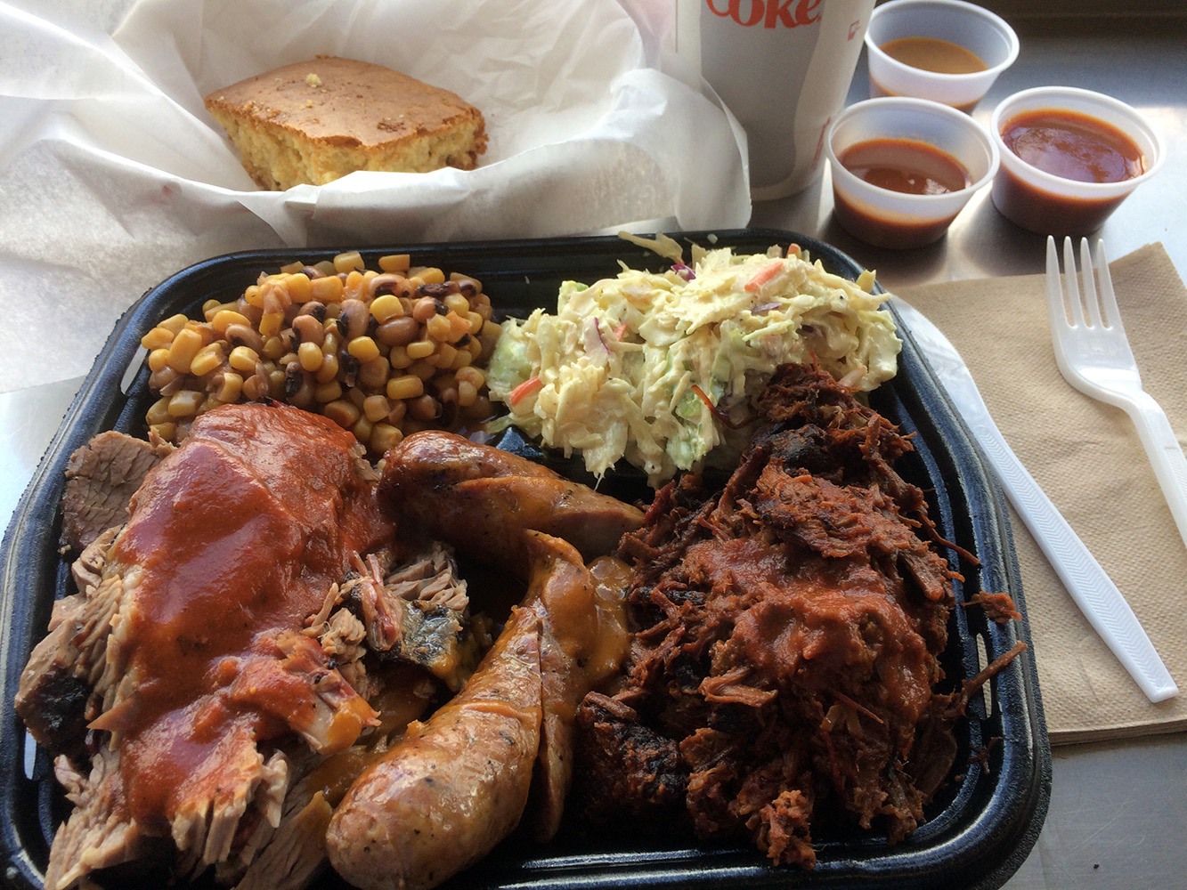 there was a tiny crowd but they all seemed to be finishing up. there was still some counter space which we grabbed. i ordered the blue ribbon trio platter: texas sliced beef brisket (+50¢), red hot smoked sausages, kansas city burnt ends (+50¢), with sides of black-eyed corn and cole slaw, and a complimentary piece of corn bread. i also added some sweet tea ($1.49), bringing the total to $21.38. as for the sauces, i filled up on hot bbq, sweet bbq, gold bbq, and chipotle mustard. kelvin got the same thing but ribs instead of sausages, and egg salad instead of cole slaw. we only waited a few minutes before we got our orders, a heaping pile of barbecue. we hung up our jackets on the wall hooks and began eating.