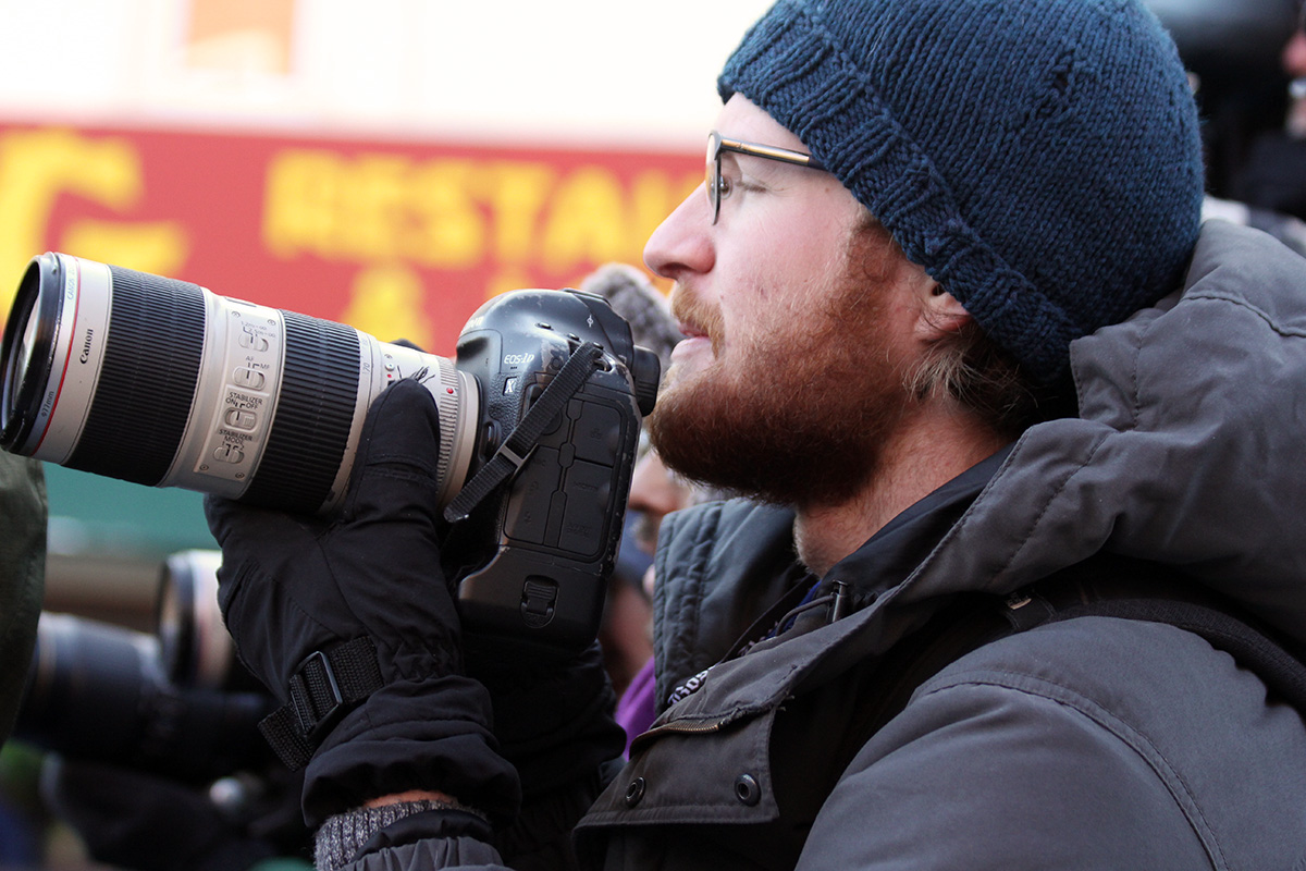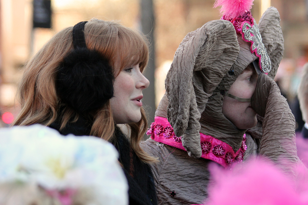 the parade itself was brief, lasting all but 10 minutes before it turned down a side street and disappeared. as the procession was slow, it was easy for onlookers to chase after it, turning it into a mob of people following the lead car. kelvin - armed with their prosumer point-and-shoot - really seemed to be into it, separating with sandy to get some better shots from the street. at one point i saw him touching the tail of a dancing inflatable t-rex. i had my 70-300mm lens, and as long as nobody was blocking my view, i could shoot fine from the sidewalk, though the transitions from light to shadow was an exposure challenge.
