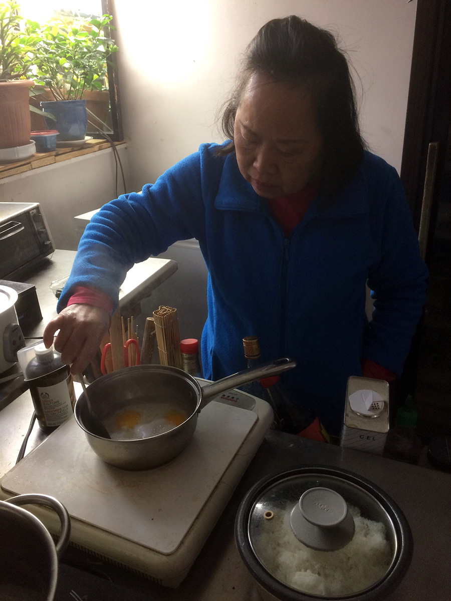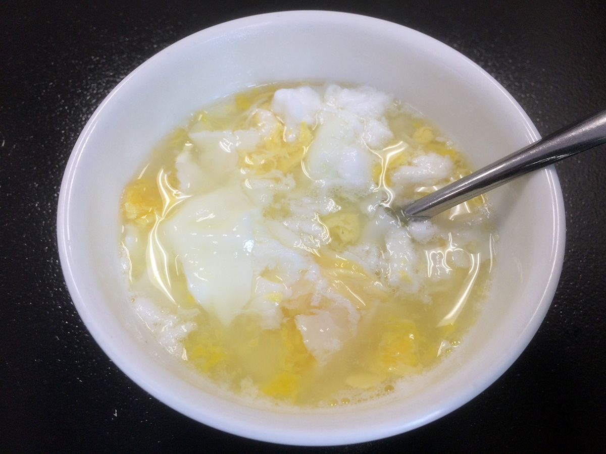 i made my way to the cafe. i asked my mother to make me a traditional birthday dish of 2 eggs with some sugar. i returned home after i finished eating.