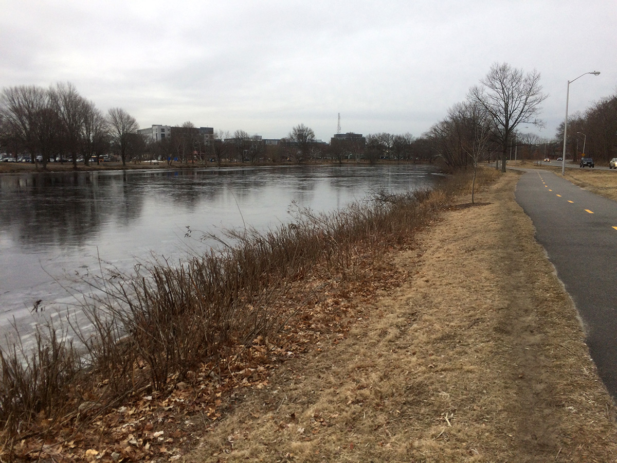 i woke up at 8am on my birthday to renew my driver's license before a snowstorm was due to arrive in the early afternoon. it was a good day to do it since my license was due to expire today and gave me a little adventure. the watertown RMV was the destination and i'd already checked out the bike route on google map, which showed me a leisurely ride along the charles river. i left by 8:30am, before sandy even woke up. temperature was surprisingly low for some reason, only in the teens, but i was confident that it would rise. i did however have to stop at one point to change from gloves to mittens as my fingers were freezing. there was hardly any traffic on the bike path, a few other cyclists and joggers. the river was partially frozen and the only wildlife were a few canadian geese. i stopped behind the cambridge cemetery and saw what looked to be my grand uncle's grave.