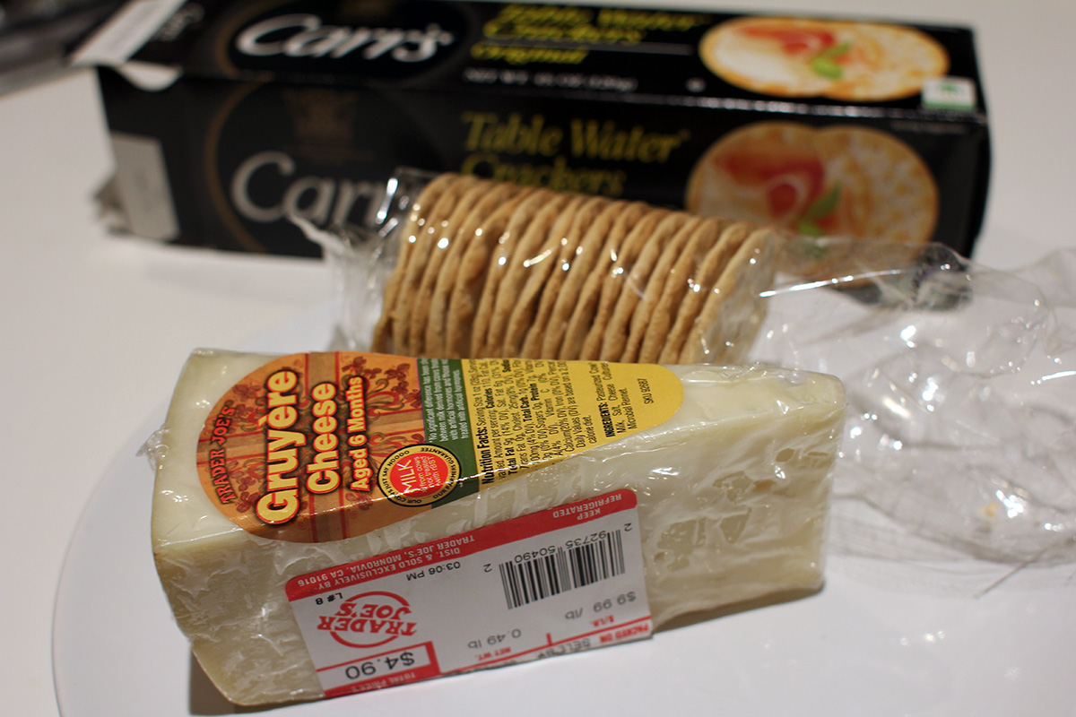 a quiet afternoon turned noisy when sandy once again started videochatting with kelvin at 3pm. i moved to the dining table to get some peace and quiet. i took the leftover gruyere from the fridge and had some cheese and crackers for a snack.