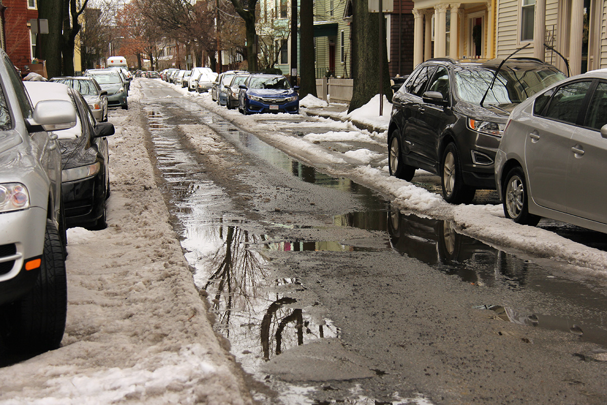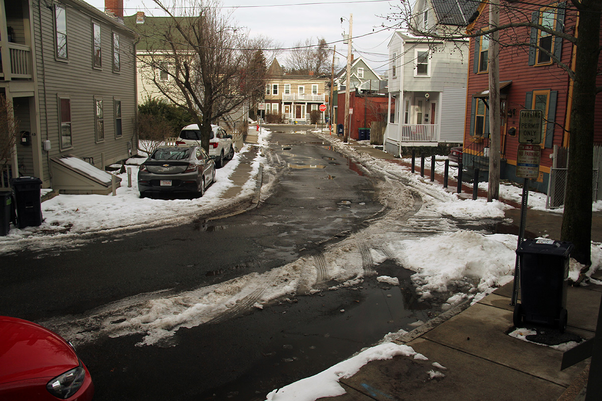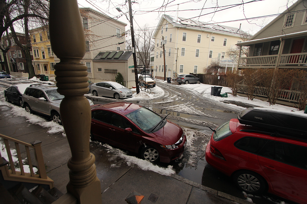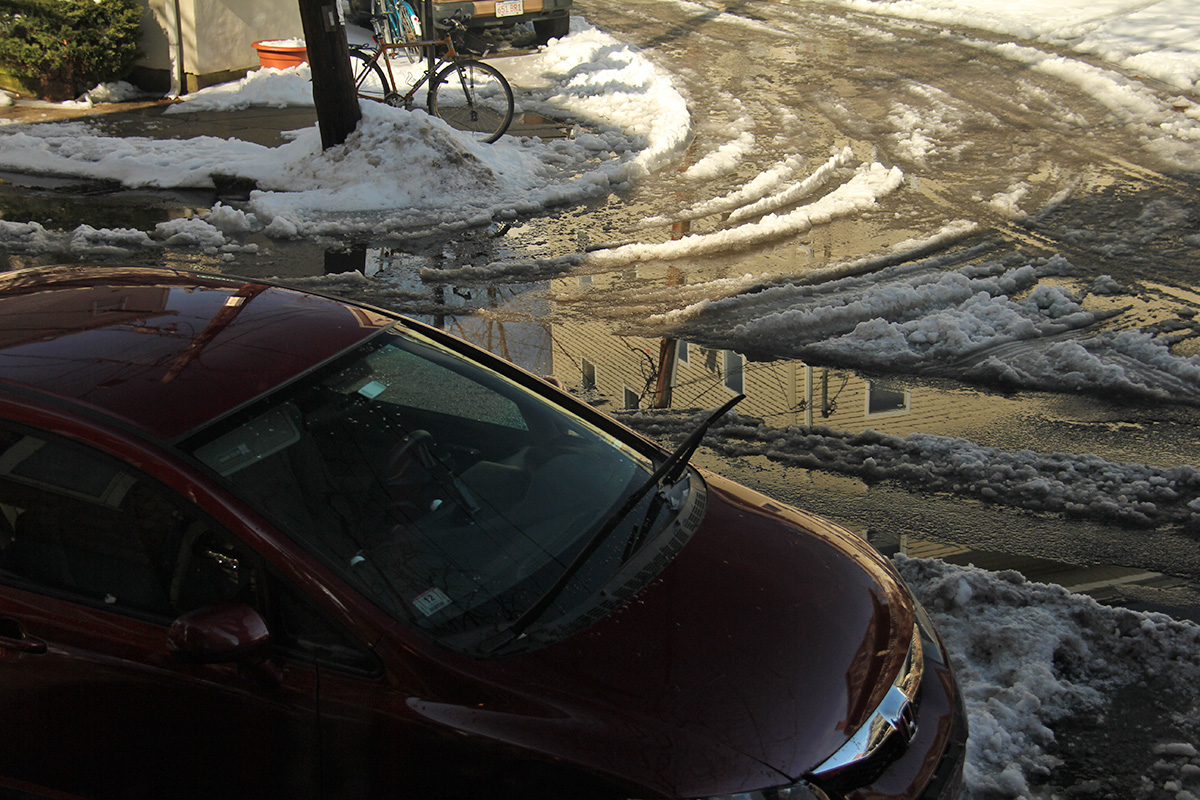 all that snow that fell yesterday was now all melting away today, as everything turned into slush and emptied into the storm drains like urban waterfalls. i went out briefly to bring in the trash but also to scrape off some stubborn slush clumps stuck on the sidewalk.