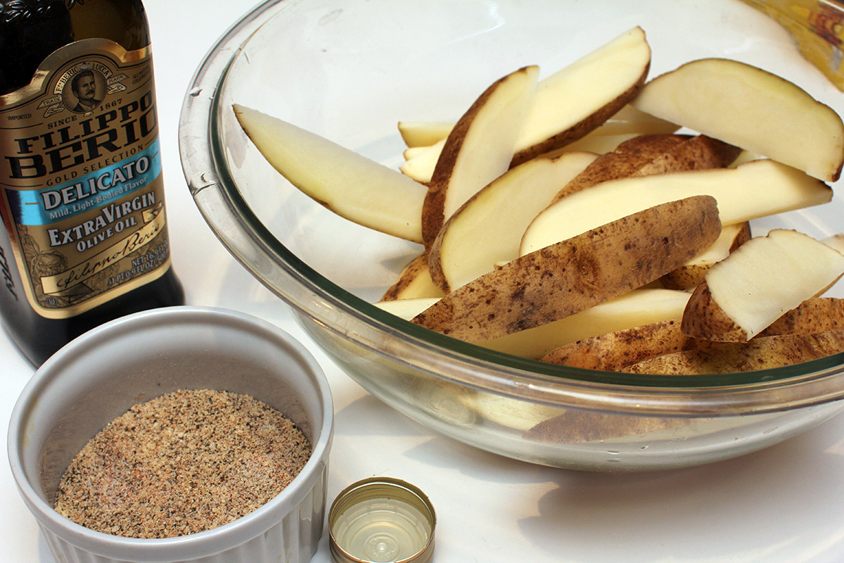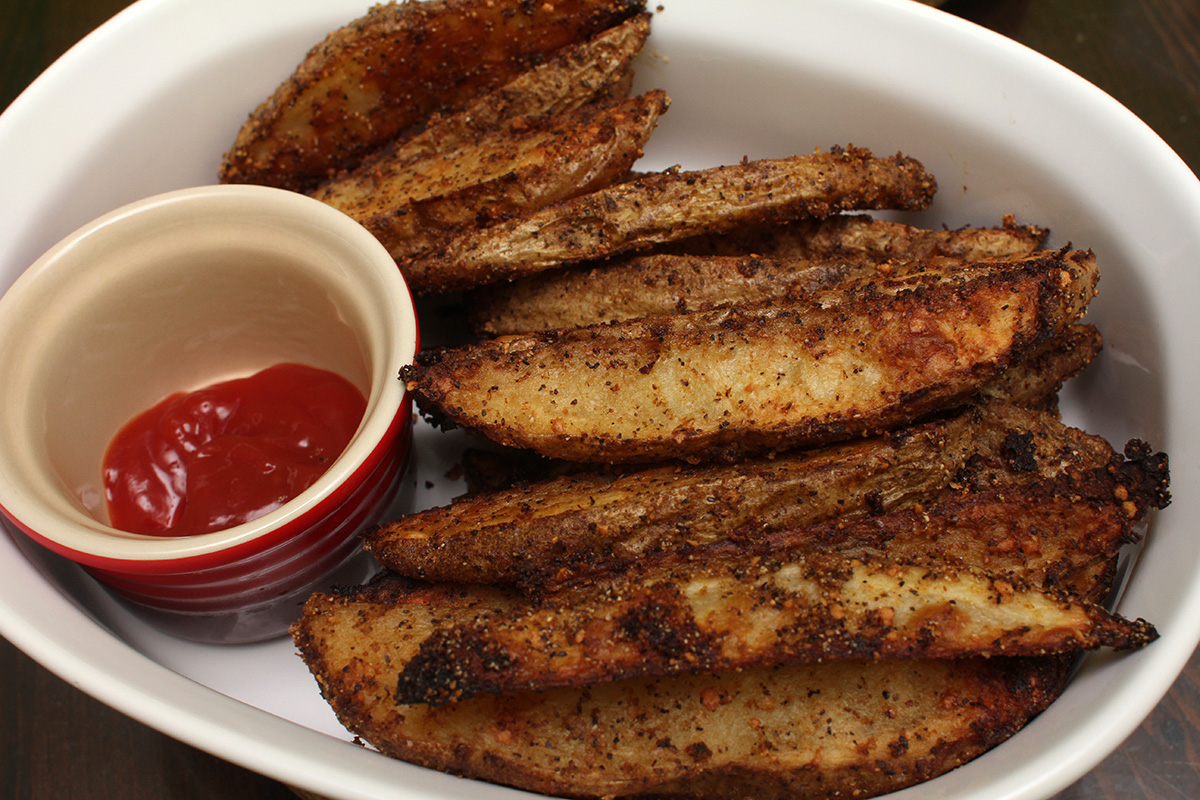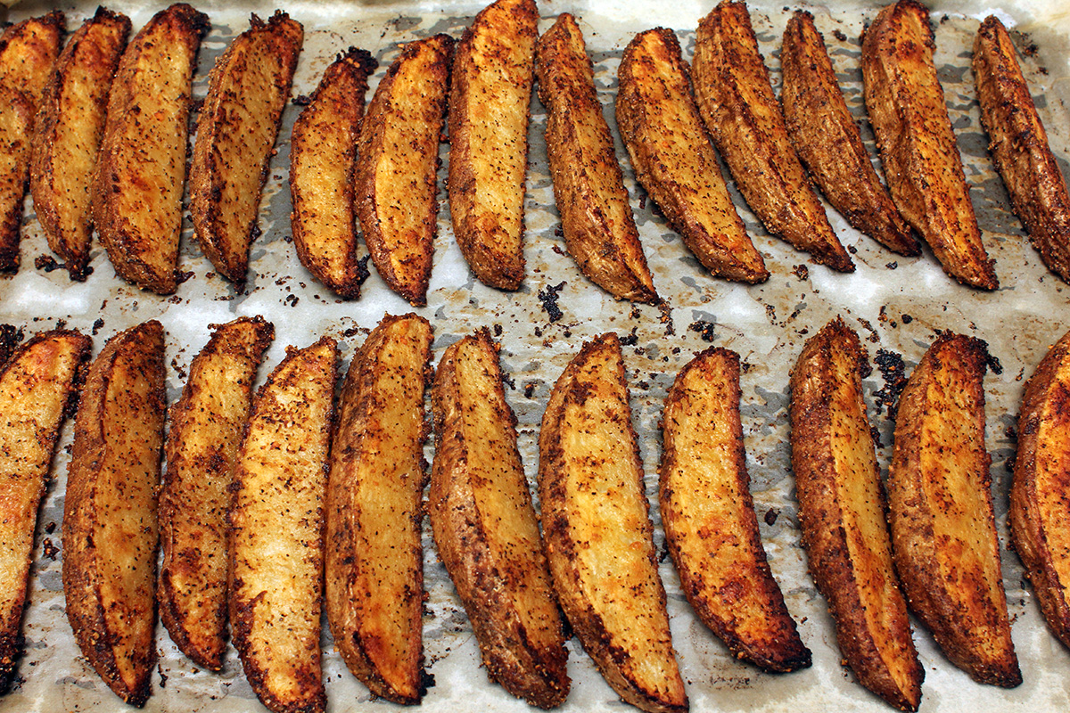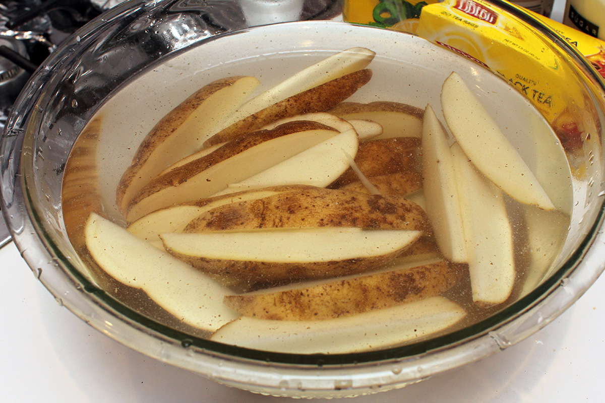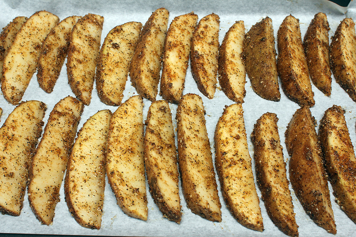 sandy came home by 5:30pm and went in her room to chat with kelvin. i began making my spiced potato wedges with the bag of idaho potatoes i bought a while back. i cut 3 medium potatoes into wedges. at one point the knife slipped and cut into my fingernail. sandy actually came out of her room because she'd thought i cut myself. there was just enough potatoes to fit onto a single baking sheet lined with parchment paper. this time around i soaked the wedges in hot tap water (30 minutes, supposedly it makes them crispier) before drying them off and tossing them with some olive oil and spices. i made too much spices, i can cut back a little next time. i baked for 25 minutes before turning them and baking for another 20 minutes.