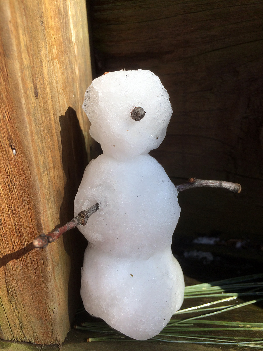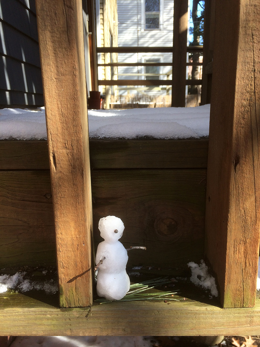since it'd be snowing tomorrow morning, i put away my bike figuring i won't be riding it anytime soon. while i was at it i built a tiny snowman with the snow from yesterday.