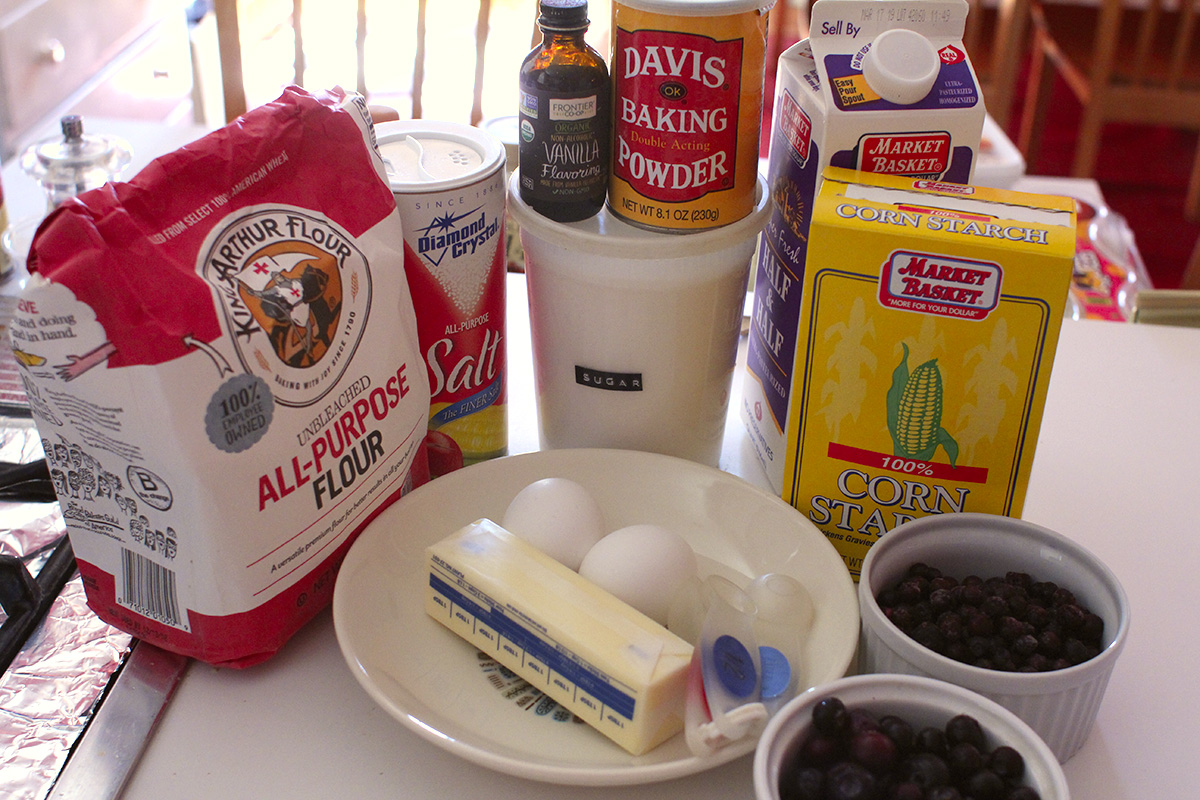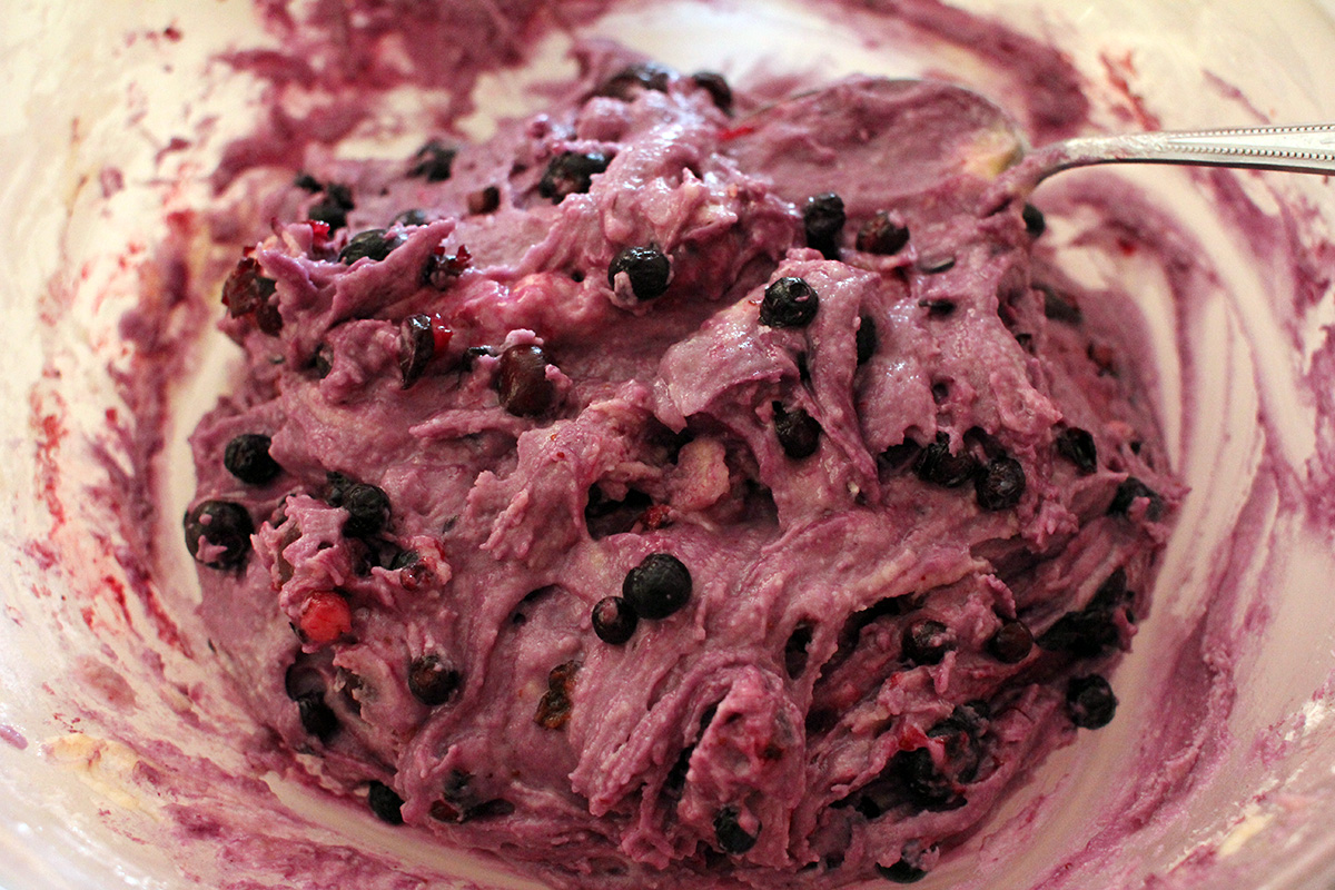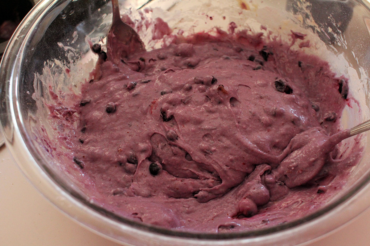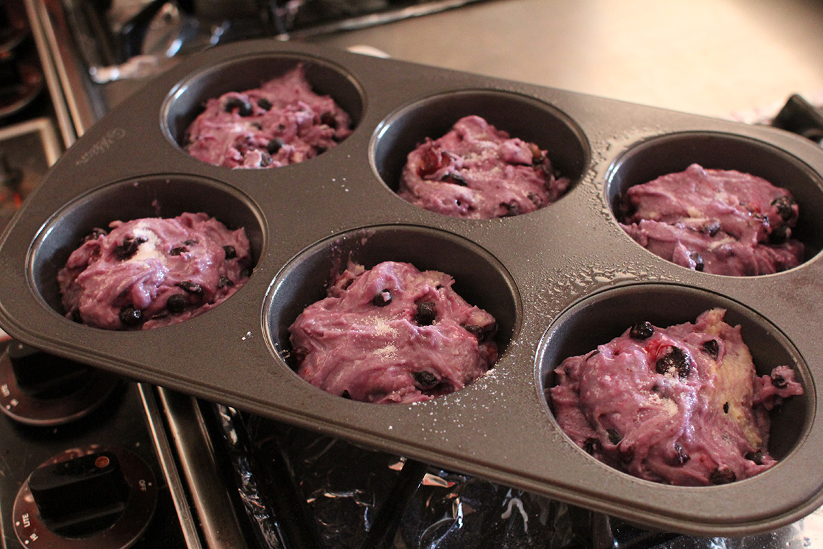 i made a new batch of cake flour blueberry muffins, this time vowing to get the ingredient portions correct. i set up the butter and eggs the night before, i mashed the sugar and butter by hand, everything was going according to plan. the batter was not as stiff as last night (with triple the baking powder). i did notice the frozen blueberries were "bleeding" into the matter, so much so that the batter turned purple. i think the problem is i set out the blueberries beforehand in porcelain bowls that slightly defrosted the berries while i was assembling the other ingredients. next time, i'll just throw in the frozen berries directly, so there's less chance of the juices coloring the batter.