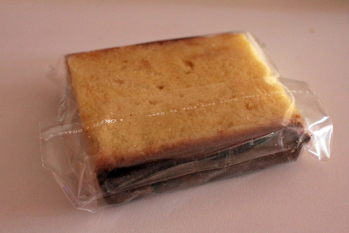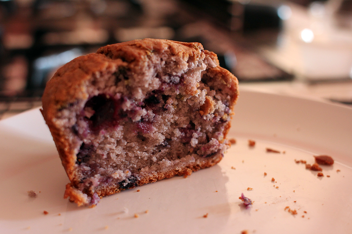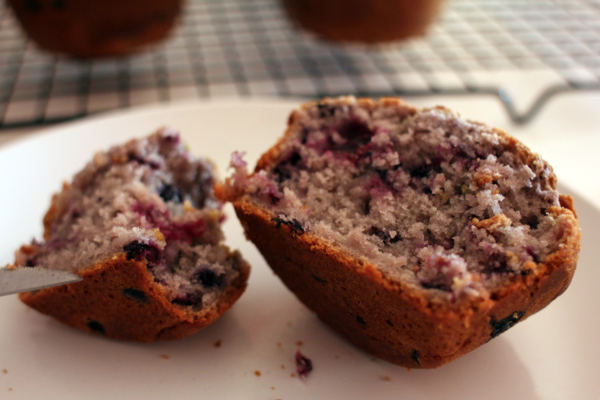 50 minutes later when the muffins had finished baking, i took them out of the oven. instead of having a crumbly loose texture, these muffins had a more compact texture. they were also smaller, so despite rising, they didn't rise nearly enough. my father actually stopped by to pick up some muffins because my mother (and my 2nd aunt) wanted some. when he arrived i cut open one of the muffins to taste. it was still very moist and fluffy on the inside, just in a more condensed package, more aesthetics than anything else. my father ending up taking 4 while i saved one for sandy.