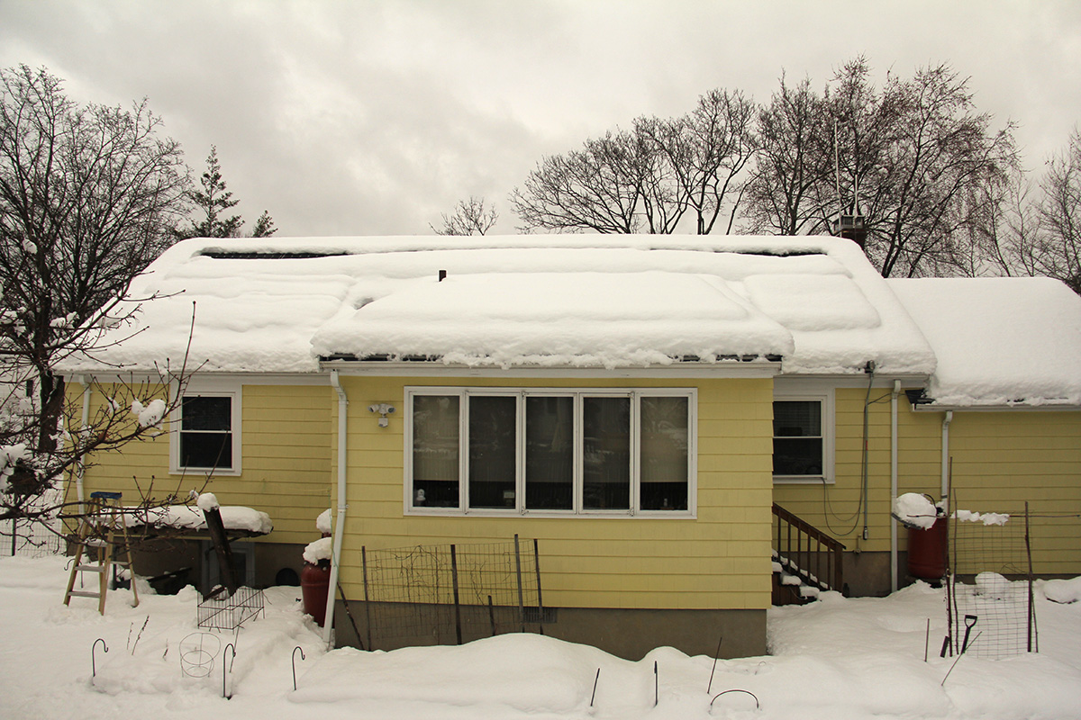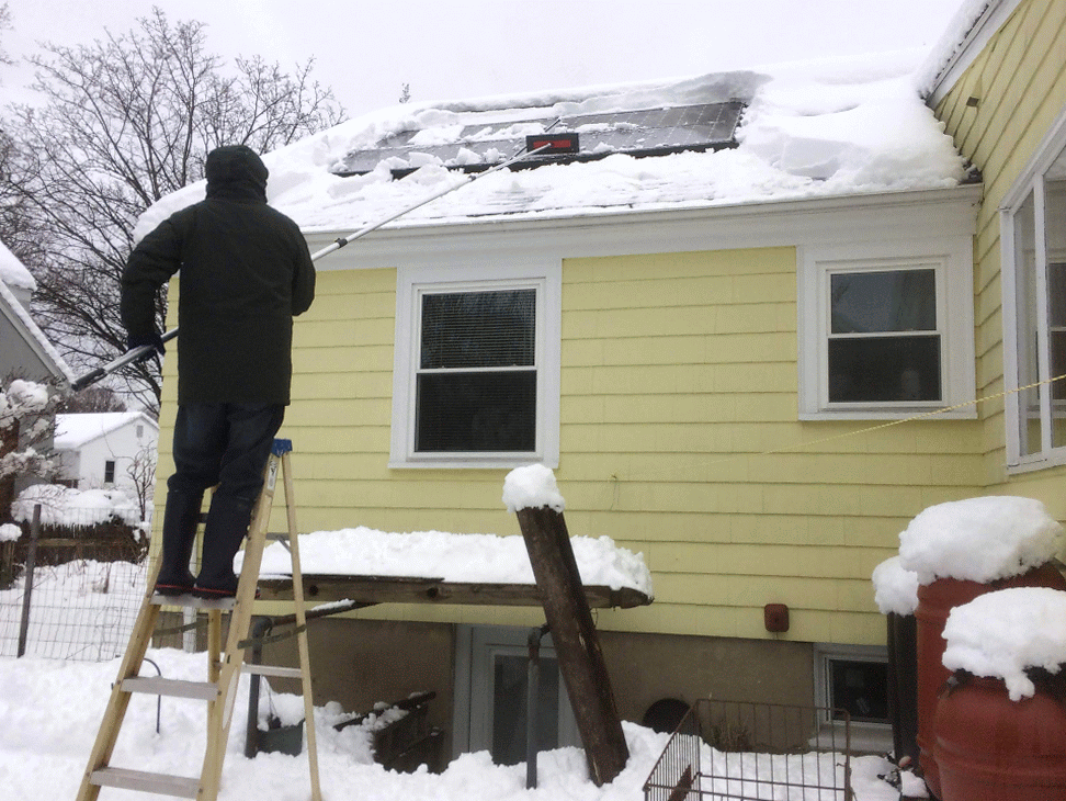 there was enough snow on the solar panels to create an avalanche effect when we hit the snow at the right spot. my father managed to create one on the left side of the house; the avalanche buried the basement staircase in snow and also knocked over and broke a porcelain pot. it was harder to create avalanches with the sunroom snow, since the angle wasn't nearly as steep. there was a mini avalanche but i prevented it from sliding down completely as i was afraid the force of the snowfall would knock over the ladder i was standing on. by the time we reached the right of the house we figured out a new technique: when there's a lot of snow on the panels, first knock it down by creating avalanches, but make sure to do it with an a-frame ladder instead of a leaning ladder to prevent the falling snow from knocking over the ladder. afterwards use the taller leaning ladder to clear whatever snow didn't slide down.