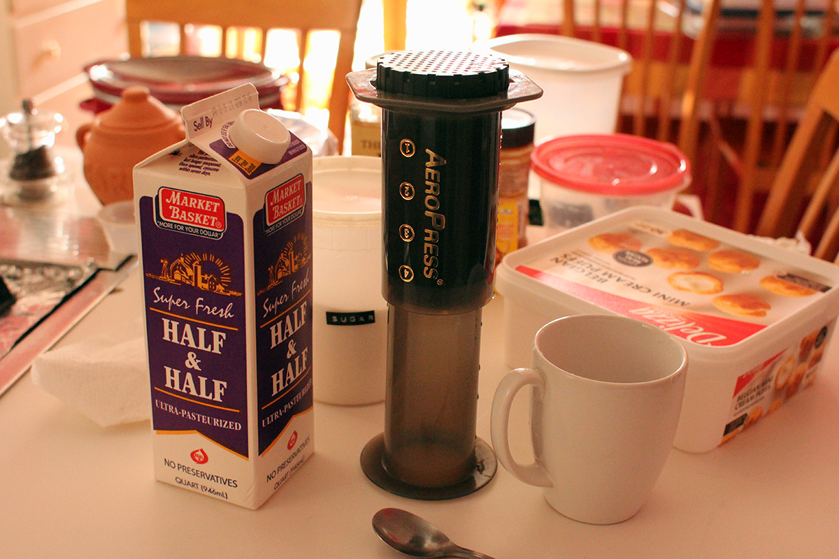 the muffin i tried was moist and fluffy, with a flavorful crust. despite blueberry juice stains mixing in the batter, the interior remained pale for the most part. some of the larger blueberries melted and tasted more like bitter cranberries. i made some aeropress decaffeinated french vanilla coffee to go along with my muffin lunch.