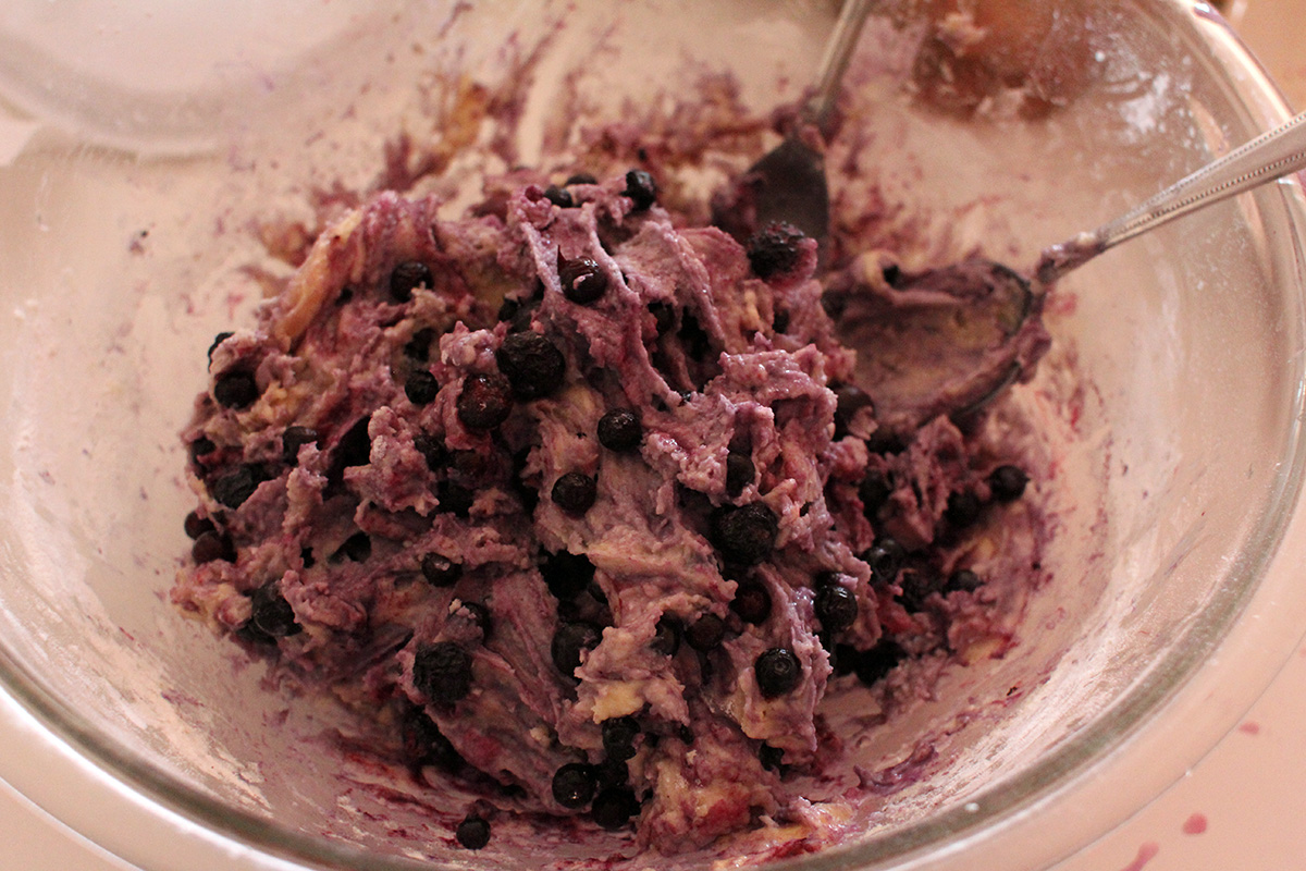 at 11am i began making a new batch of blueberry muffins. i was still going with homemade cake flour but this time i wouldn't forget about the baking powder. i would also add the frozen blueberries directly into the batter without leaving them out to accidentally defrost and leak their staining juices.