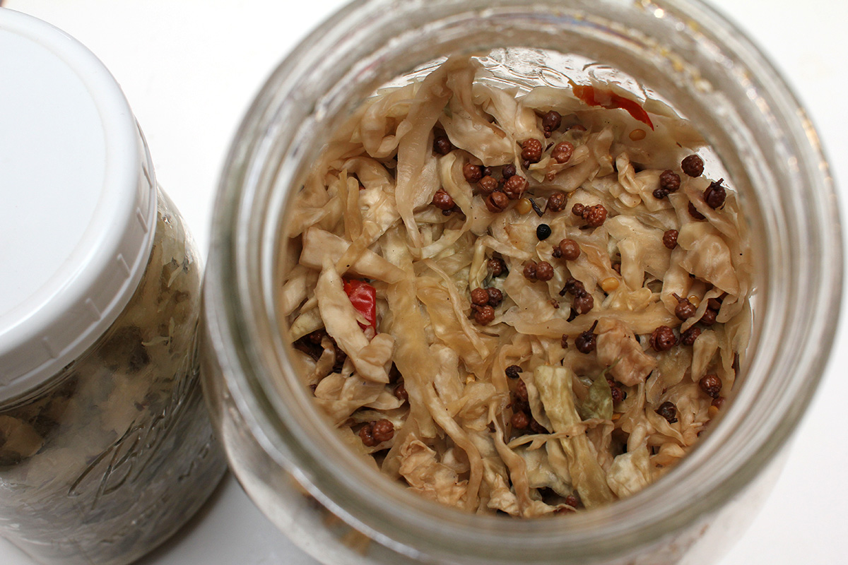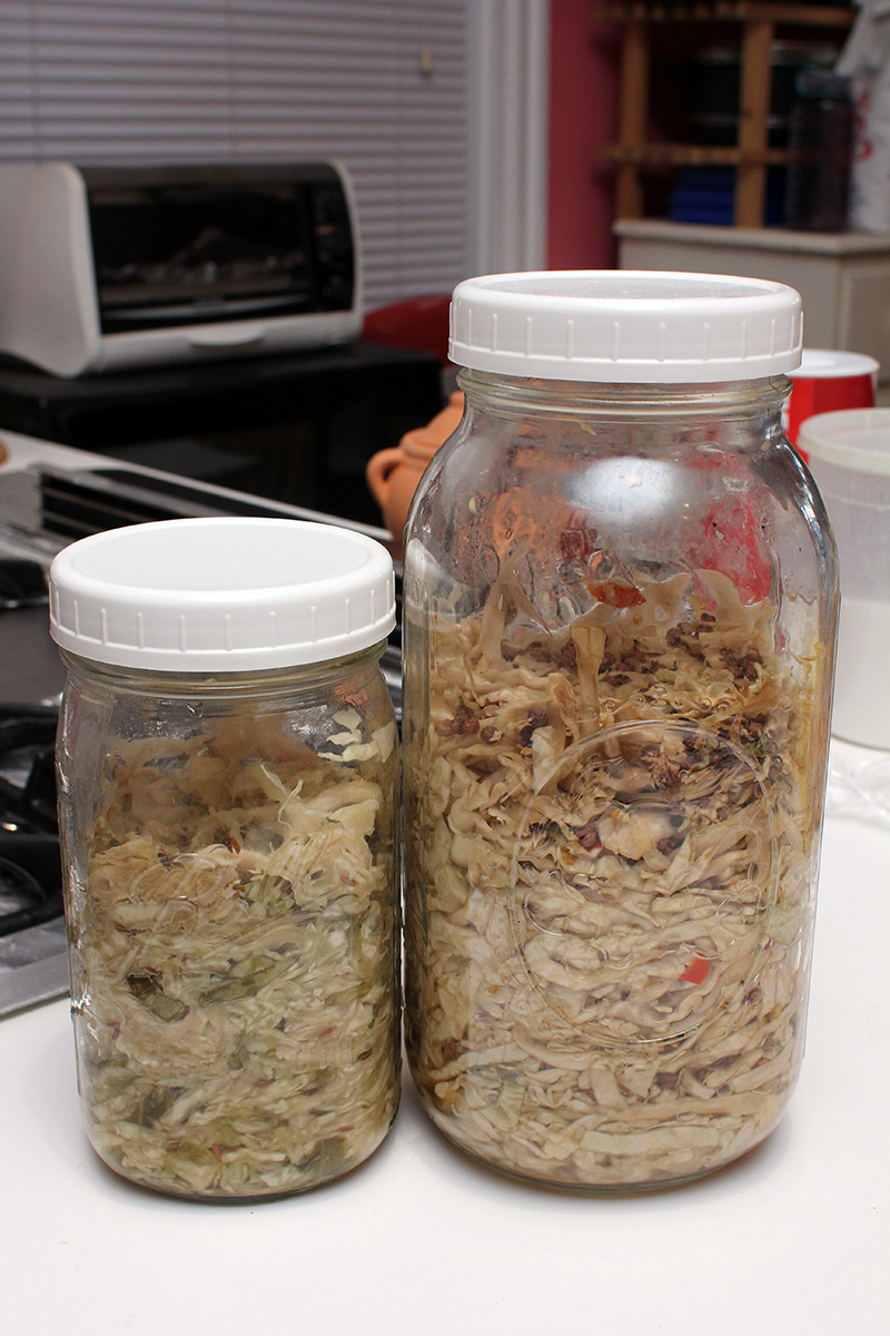 i also have a cabbage i got on sunday, was going to turn it into sauerkraut, before i realized that the old sauerkraut i had in the fridge was still edible. true, it's been aged 2 years, and doesn't look fresh at all, but there's no mold in the jar, no funky smells, and when i tasted some, i didn't get sick afterwards. i still prefer the taste of fresh sauerkraut though, so i maybe just start a new batch as i have plenty of empty jars, no need to throw out the old sauerkraut just yet.