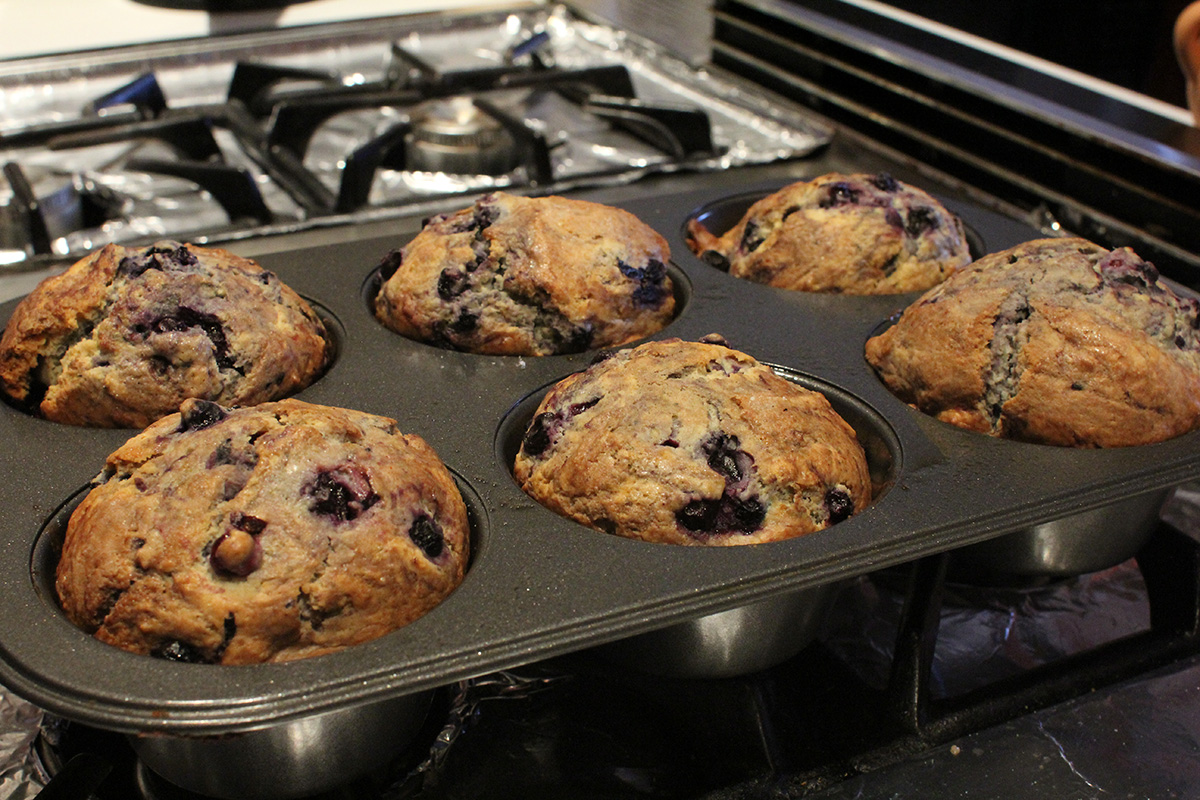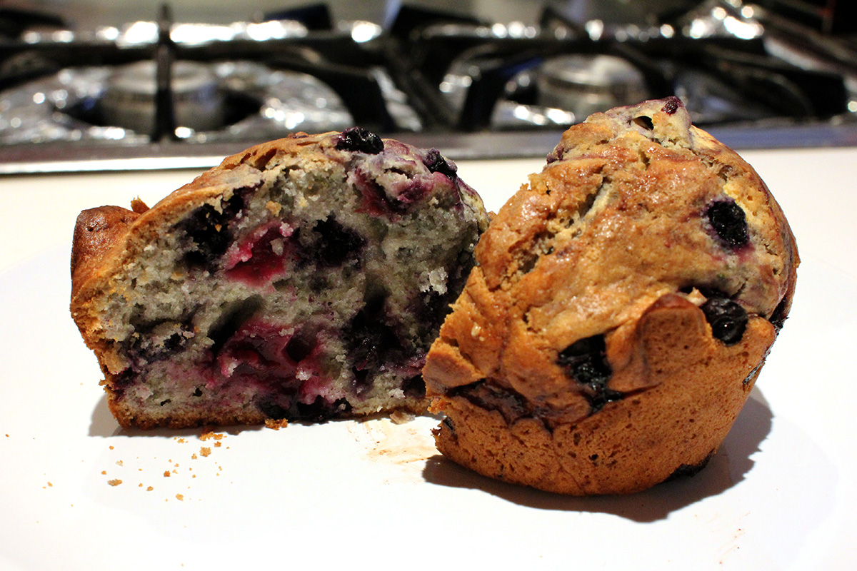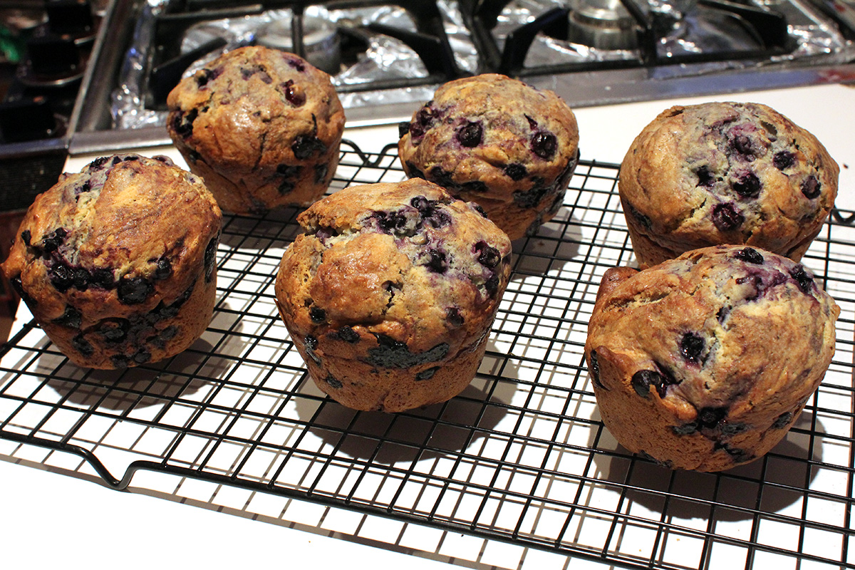 the muffins were done by 11am. i tried one, couldn't really say if they were better or worse compared to last time. these muffins do have a tastier crust however, not sure if it's because of the corn starch or maybe i never noticed it before. i use a mic of 1 cup regular blueberries and 1 cup wild blueberries. wild berries seem to taste better, the regular ones include some very large berries that aren't sweet at all and taste more like sour cranberries. i also don't really notice if these are fluffier, and if anything, they seem a little flatter like maybe it collapsed on itself.
