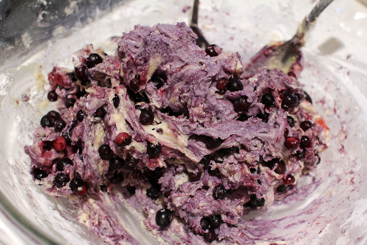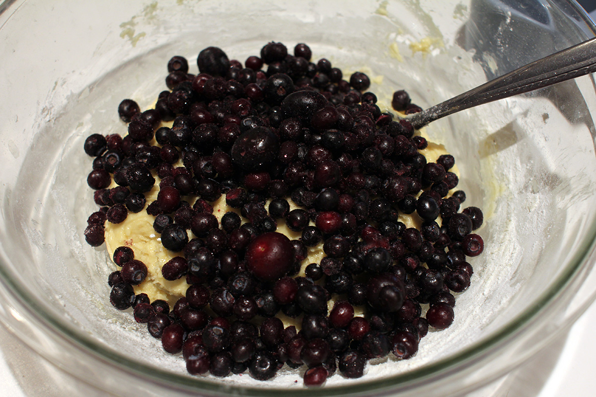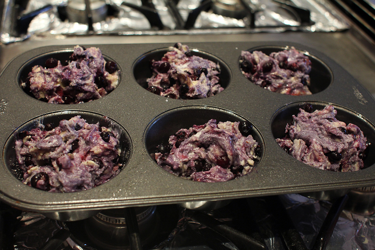 so the blueberry muffins this time around i made sure i had all the right ingredients in the right portions. so that meant 4 tbsp of corn starch to 2 cups of flour. i ran out of king arthur all-purpose flour and opened up a new package of pillsbury beset all purpose flour (1-1/2 cups of king arthur, 1/2 cup of pillsbury). i didn't subtract 4 tbsp of flour and simply added the additional 4 tbsp of corn starch. the other thing that i noticed that was different was the batter seemed soupier than usual. that shouldn't be the case, since i'm adding an additional 4 tbsp of corn starch; maybe when i was measuring the flour there were air pockets and i didn't get a full cup. it didn't matter anyway once i added frozen blueberries since it quickly thickened the batter.