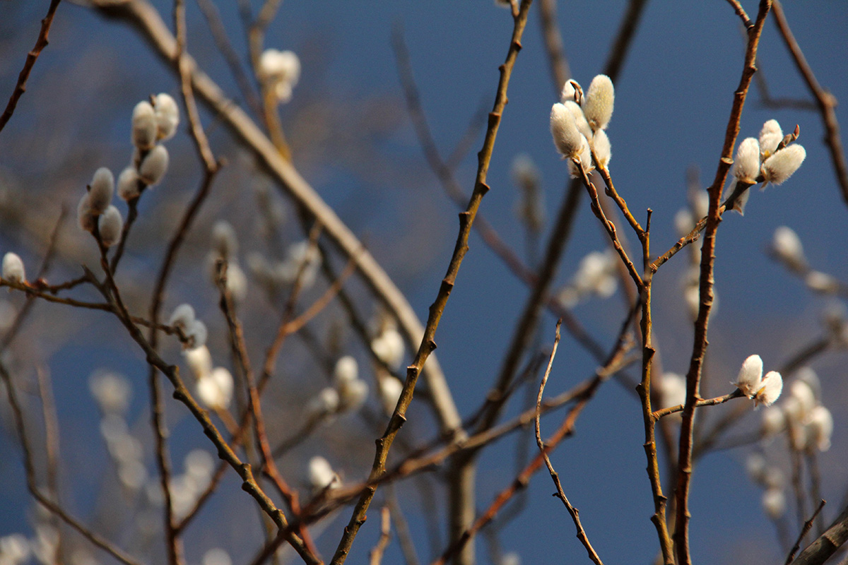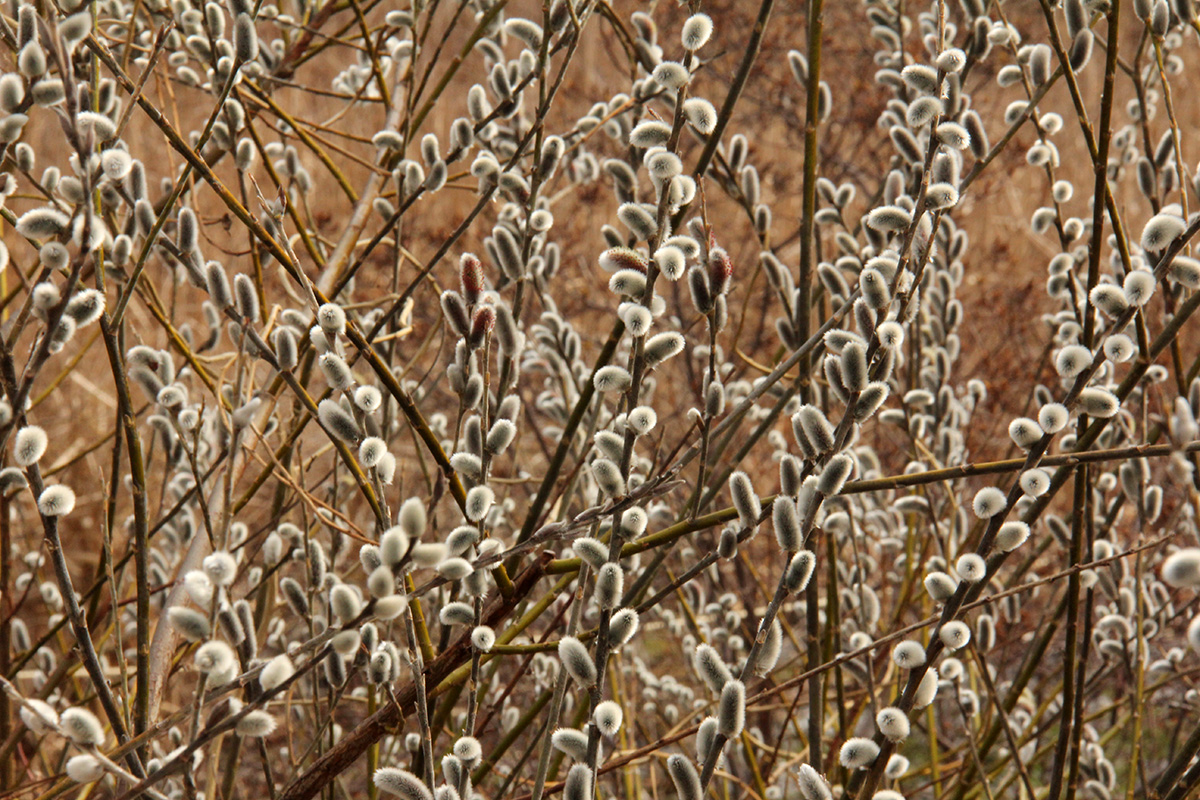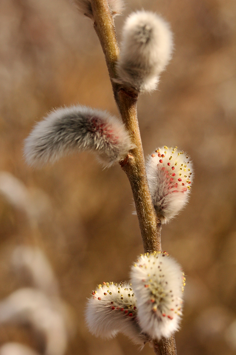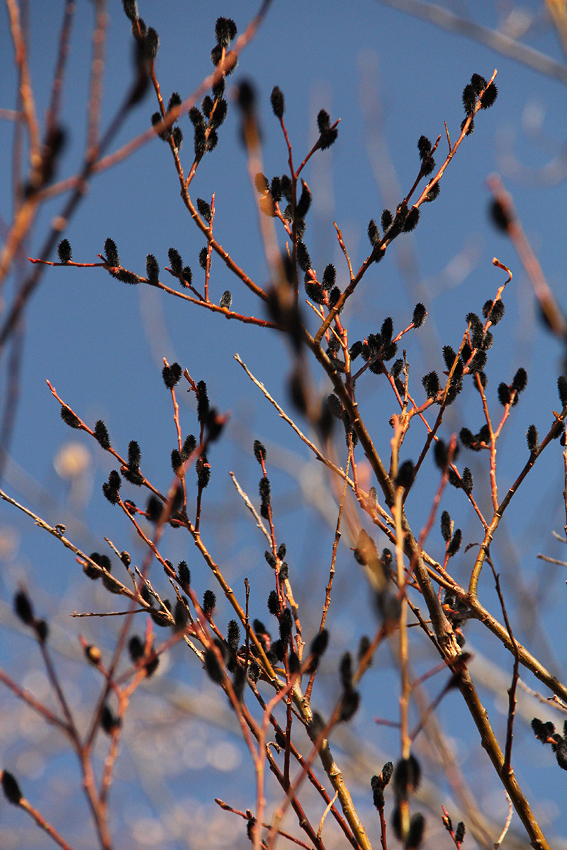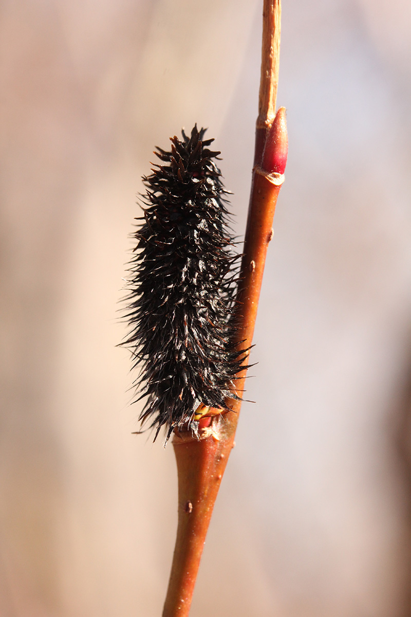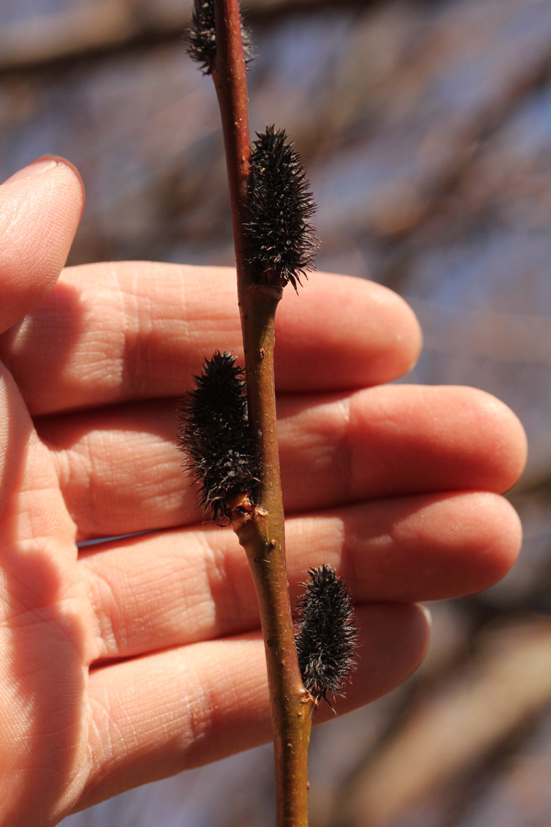 one of the things that bloom this early in the season are pussy willows. i thought i was pretty well-versed in pussy willows but today i discovered some black pussy willows. if i didn't know better i assumed they were diseased. the black catkins also resemble hairy caterpillars.