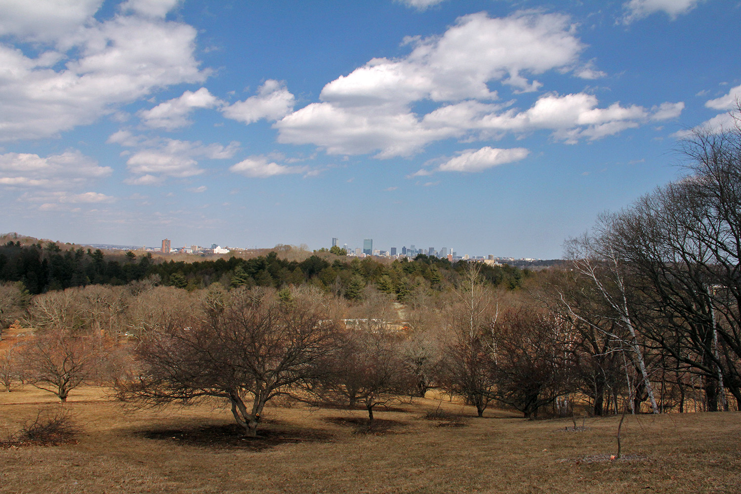 the arnold arboretum has a whole other section that i've never visited called peters hill. supposedly many crabapples are planted there, so i decided to visit. if cherries hadn't even bloomed, there as no chance crabapples would be flowering either. i biked around, making a loop around the hill, climbing to the summit for a view of boston, before finally leaving, cutting back across the main arboretum.