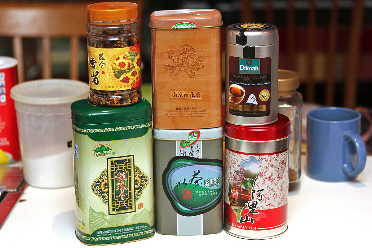 i didn't realize i had two containers of nanjing rain flower tea. i should've known because the loose leaves looked similar and tasted the same, and by that i mean very bland. maybe it's because they're old and they lost their flavor. i tried to compensate by adding more tea but the flavor never improved and i was left with a weak yet bitter drink. the best tea i have is the ceylon orange pekoe, a gift from WWY when she visited sri lanka. they come in little pyramidal tea bags and they're almost too good to drink. as far as loose leaf teas, the taiwanese tea is very good. it doesn't look like much, all black and shriveled, but once soaked they open up to full size. 3g worth of alishan tea can be steeped for several glasses of tea while still keeping its flavor. the fujian tea is pretty good too, the leaves aren't rolled or shriveled but instead flattened. it also has a strong tea flavor. i also have some kunlun snow chrysanthemum tea from xinjiang, a gift to my parents from some friends. a little goes a long way - 4-5 dried flowers - will turn a tall glass of hot water into a yellow-orange tinted slightly sweet flavored tea. supposedly it's also good for high blood pressure.