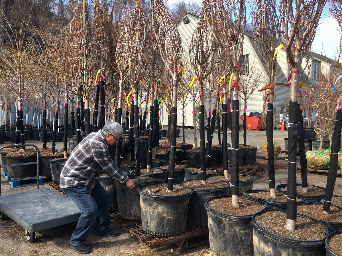 one thing i didn't know before looking for trees to buy is that trees are categorized not by height - which can vary from tree to tree - but rather by trunk diameter and container size. we knew we wanted to get a kwanzan flowering cherry. how big was limited by how large a container we can carry. the biggest one we could still manage to drag was approximately 25 gallons, with a trunk diameter of 1.75-2" ($260). a few were opened, but we picked a tree that had the branches still bundled up for easier transport. for our second tree we decided on a flowering cherry plum, a 'krauter vesuvius.' we also got a 25 gallon size, but the tree had a smaller diameter of 1.50" ($230). i also really wanted a witch hazel bush based on how fragrant it was, but we didn't have a place for it in the backyard. while my father paid at the cashier kiosk, i pushed the trees onto the parking lot, tagged by a young kid who worked at the nursery helping people load trees into cars. together the three of us managed to squeeze the two trees into the back of the honda element with the crowns poking out of the back.